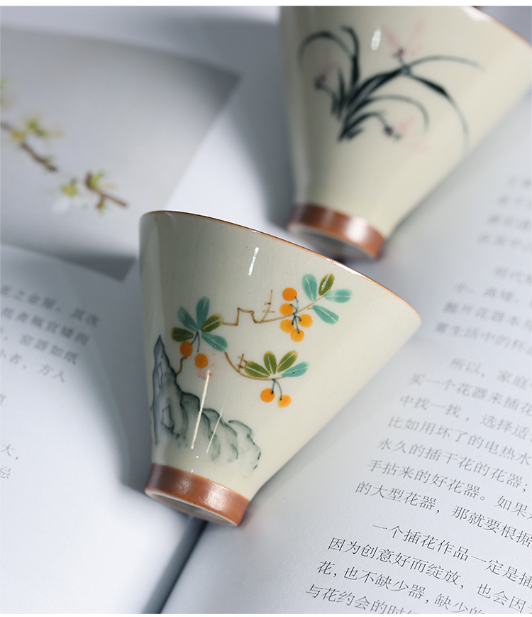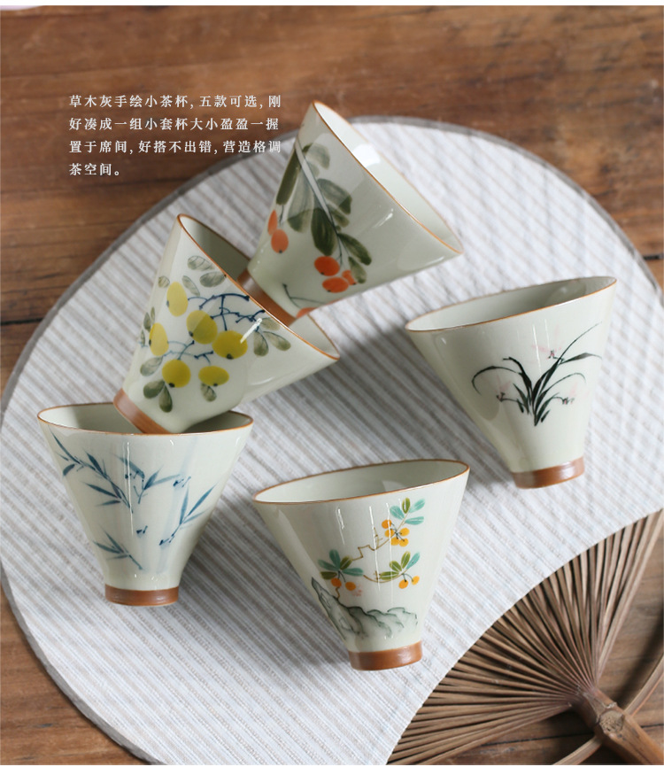 单杯喝茶小杯子功夫茶具草木灰陶瓷釉下彩品茗杯手绘竹子斗笠茶杯