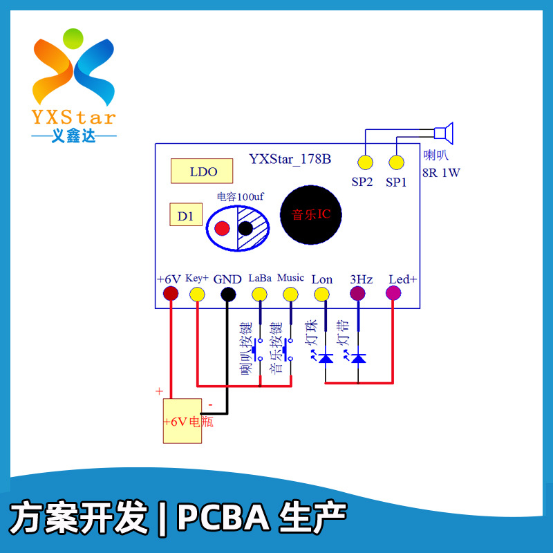 生产两个按键178B中文童车音乐线路板模块支持灯珠灯带童车电路板