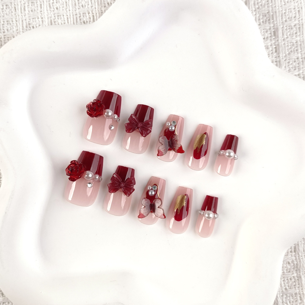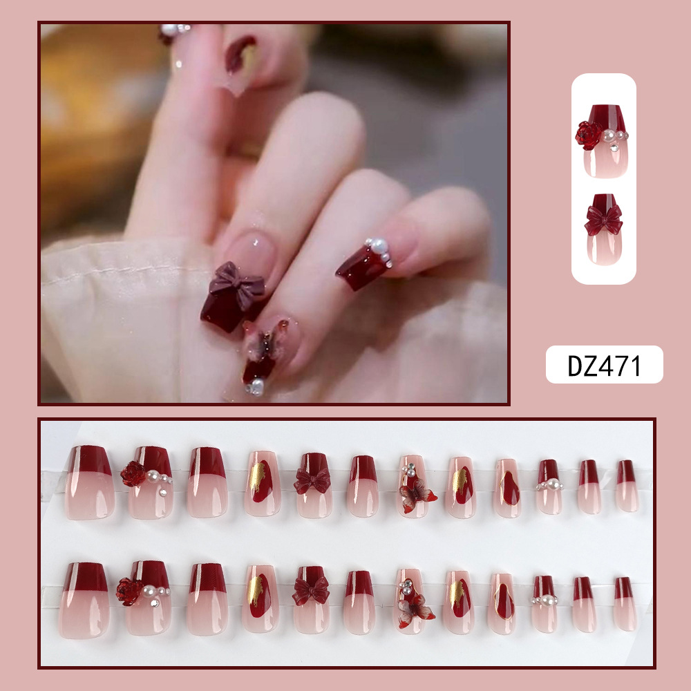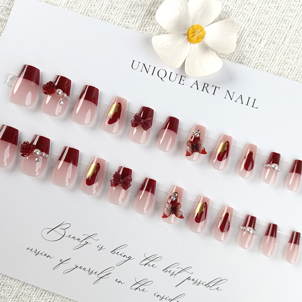 短款纯欲甜美酒红法式穿戴甲美甲甲片山茶花蝴蝶结指甲贴成品甲片