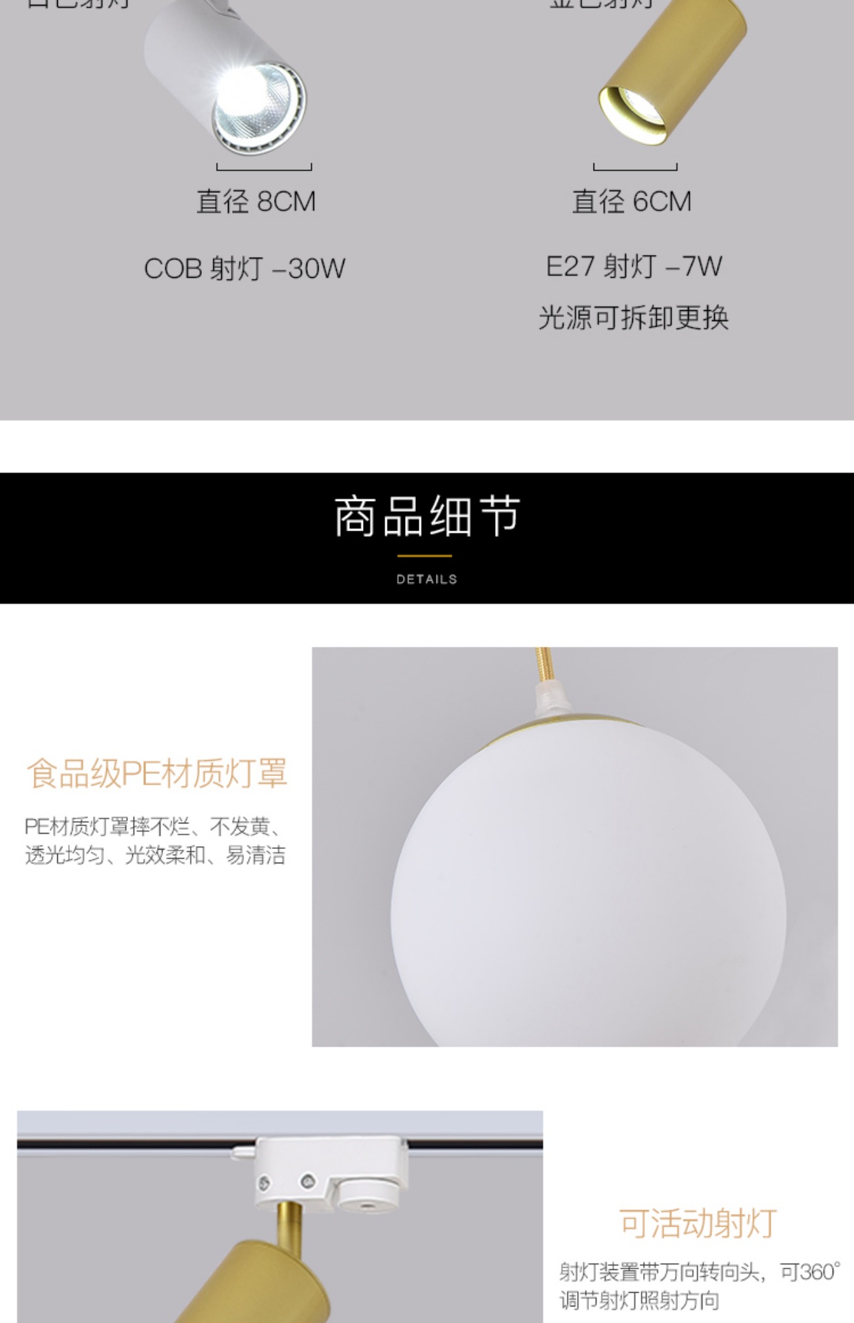 | 1 m track +3 18cm chandeliers +2 golden spotlights(1米轨道+3个18CM吊灯+2个金色射灯) | USD $32.94 | 200 piece available |