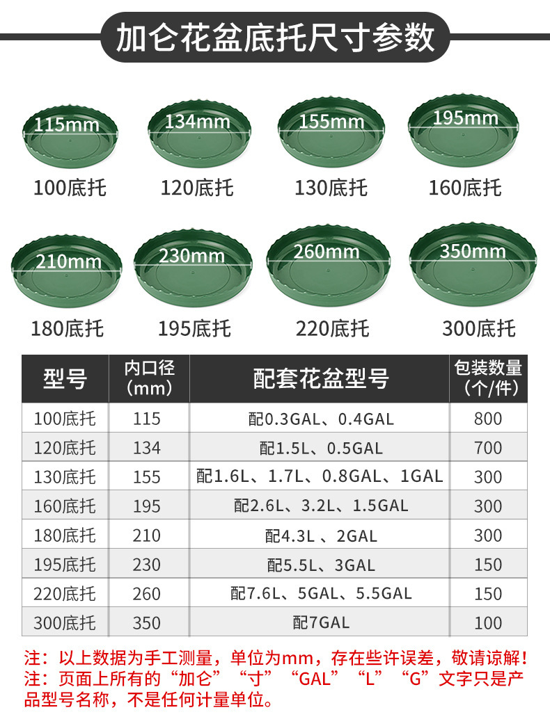 | 100 plate (without basin, can match root-controlling 0.3, 0.4 gallon basin) 800 pieces per piece(100底碟(不含盆,可搭配控根0.3、0.4加仑盆)800个一件) | USD $0.07 | 963449 piece available |