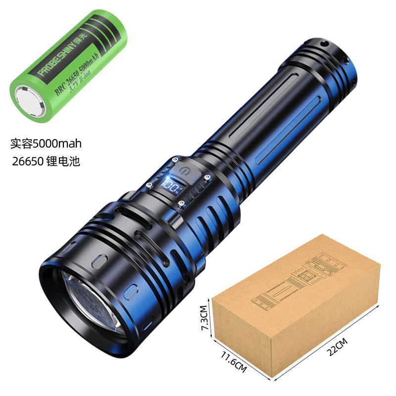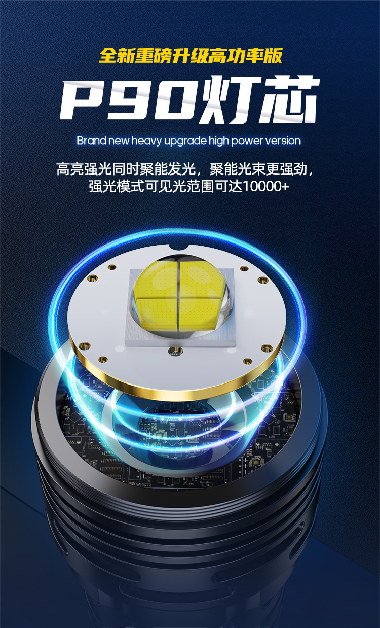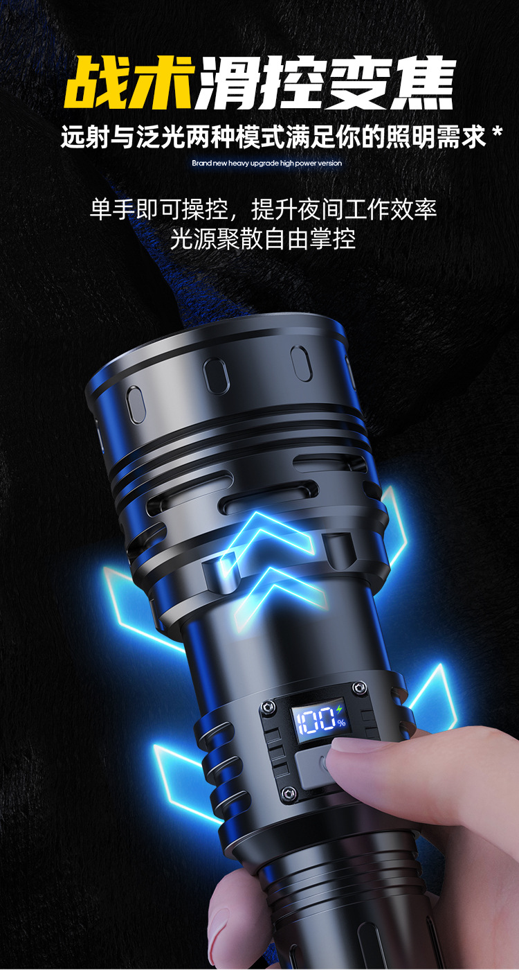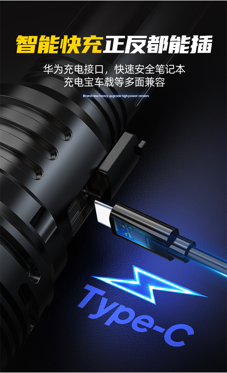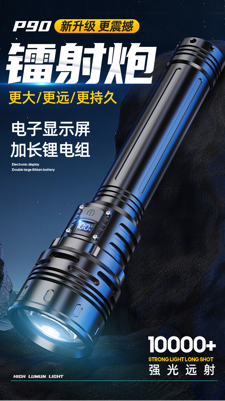 新款 Type-C快充数显P90手电筒 户外防水充电超亮战术变焦手电筒
