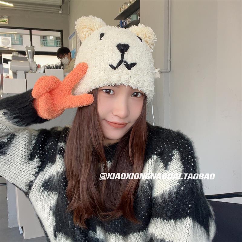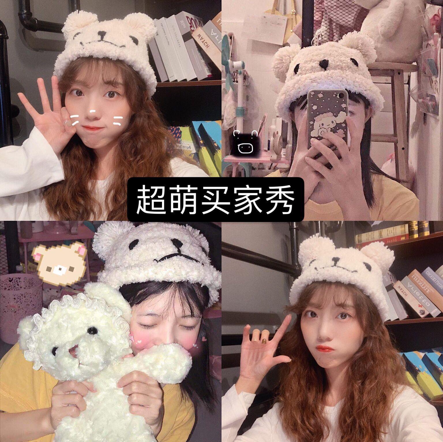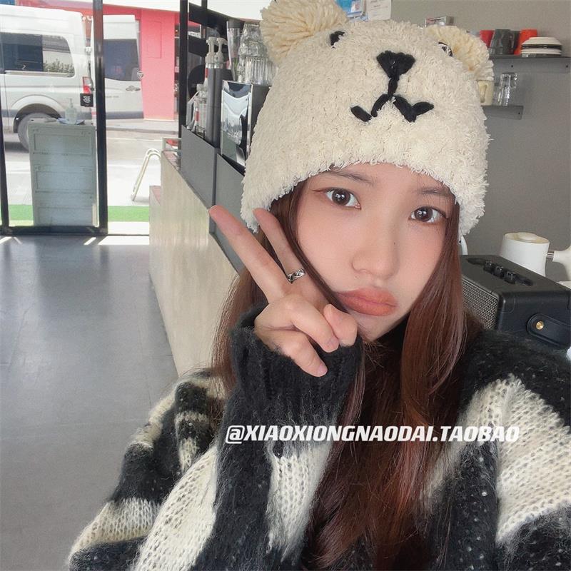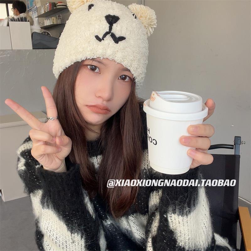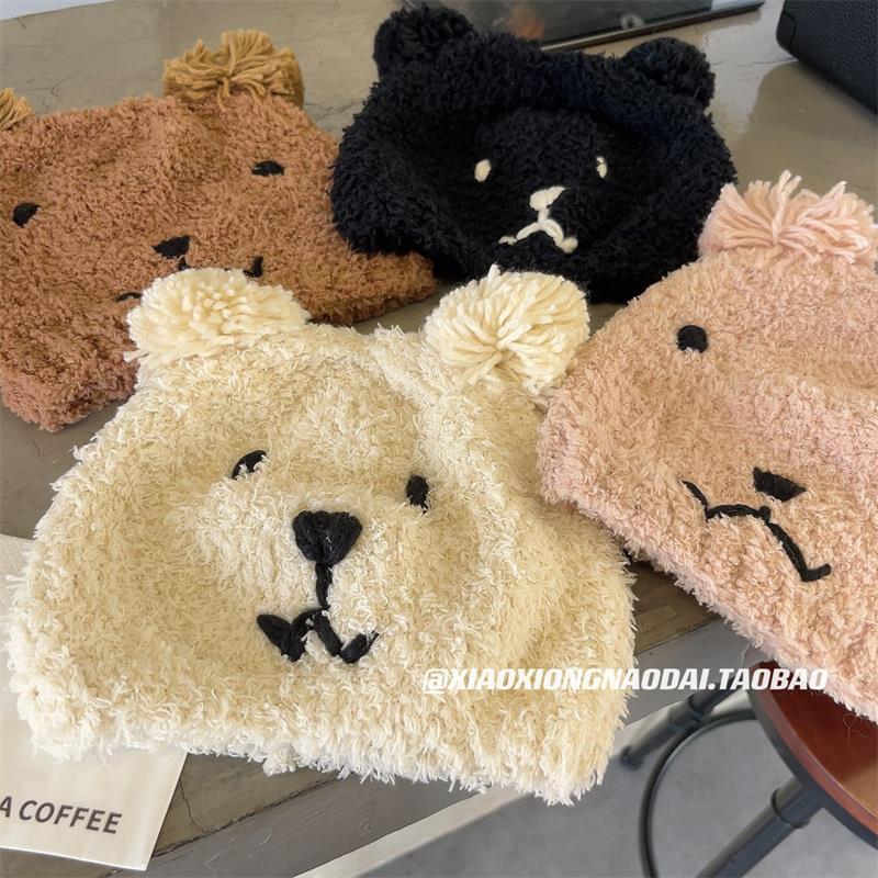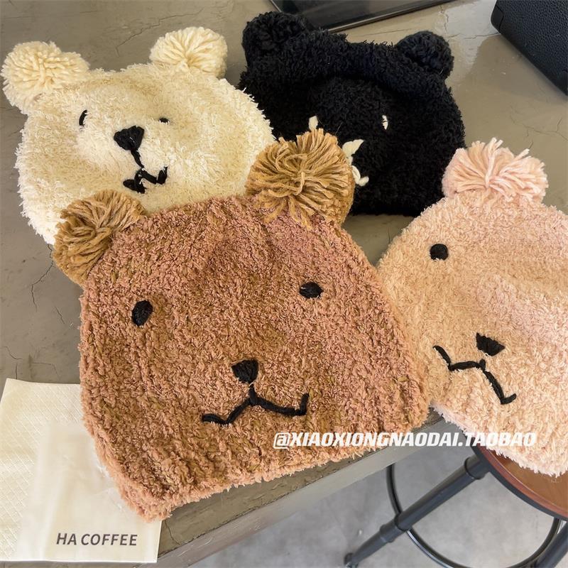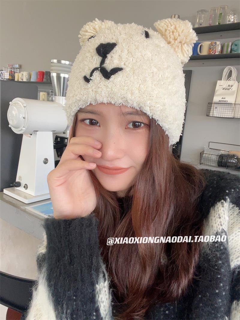 明星同款小熊可爱羊羔绒针织帽保暖护耳冬季帽子ins可爱毛线帽