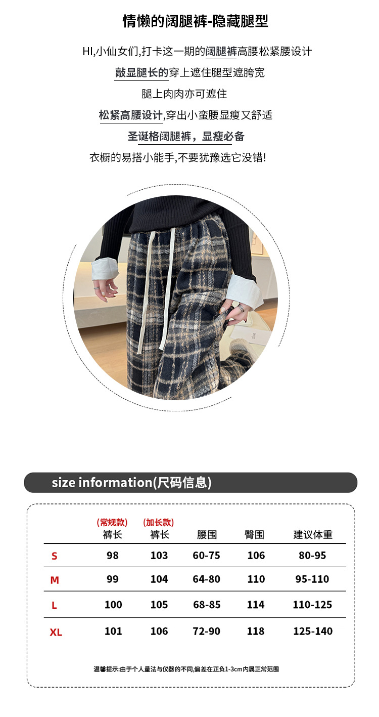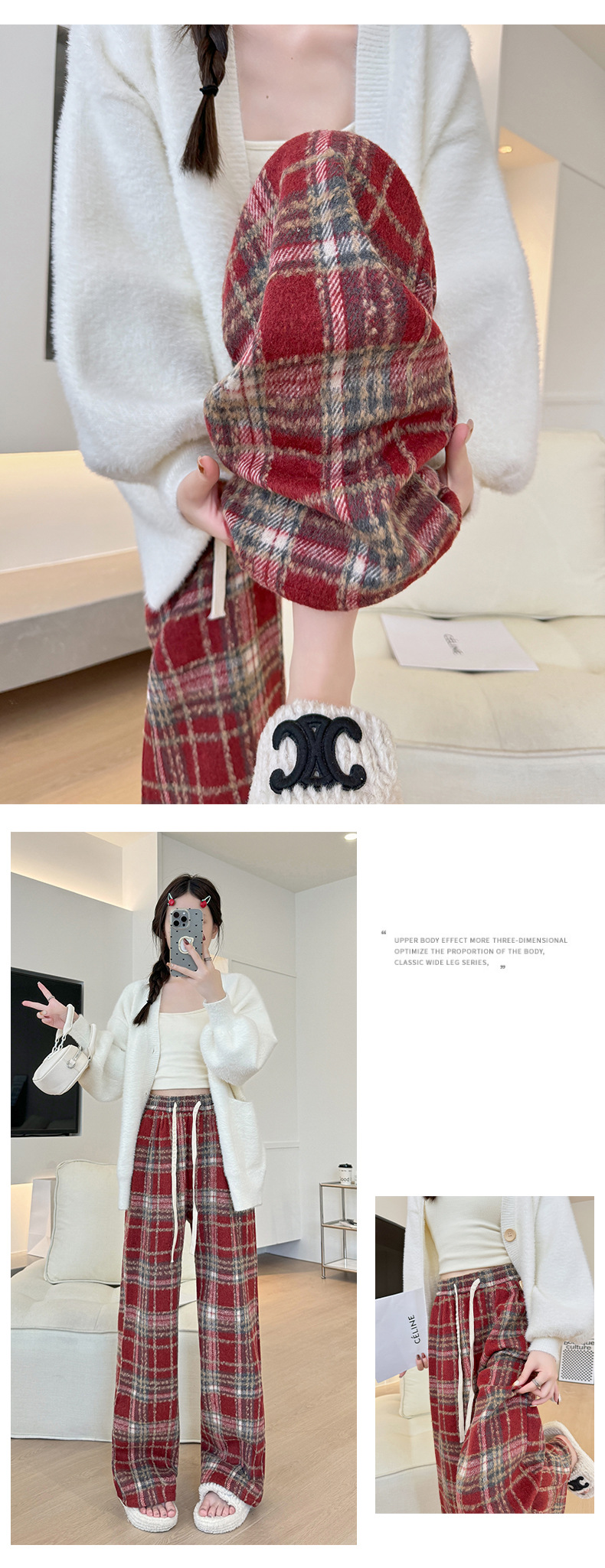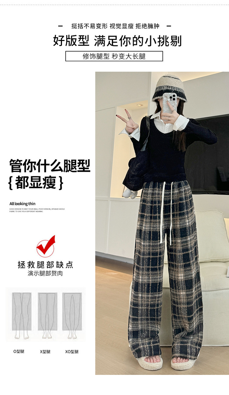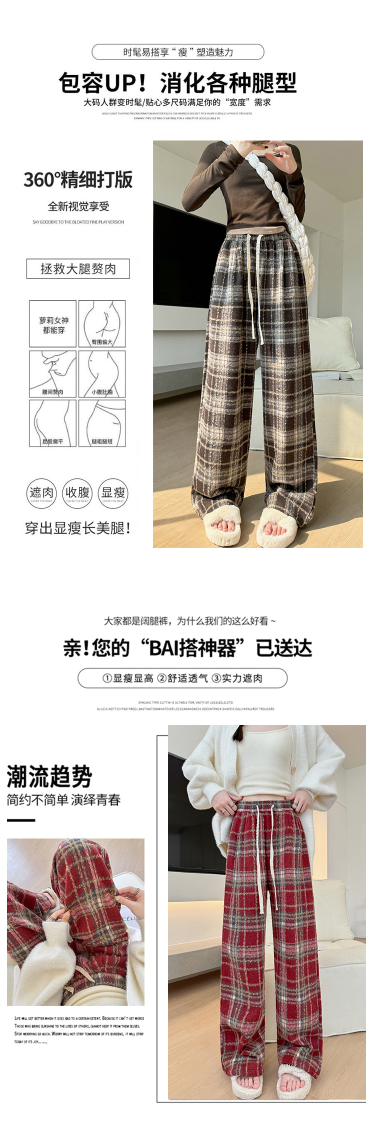 红色格子裤子女阔腿裤春秋新款垂感休闲直筒裤遛弯山本毛呢拖地裤