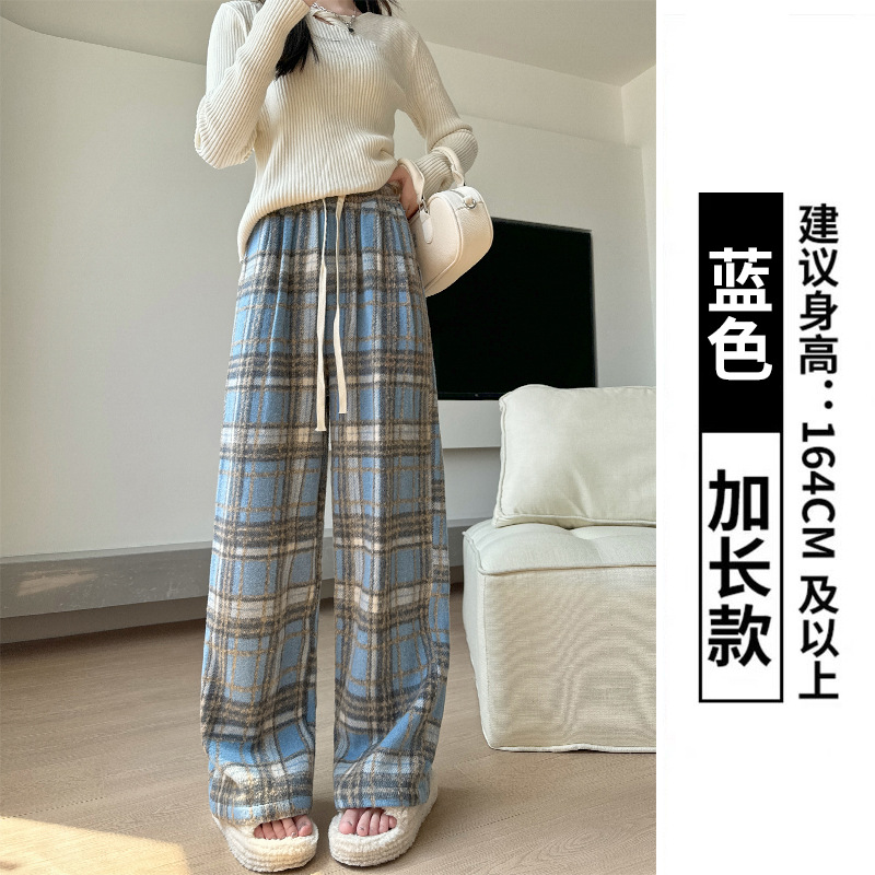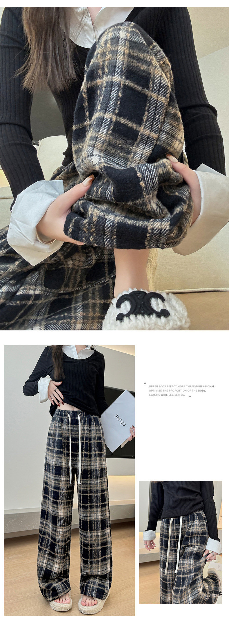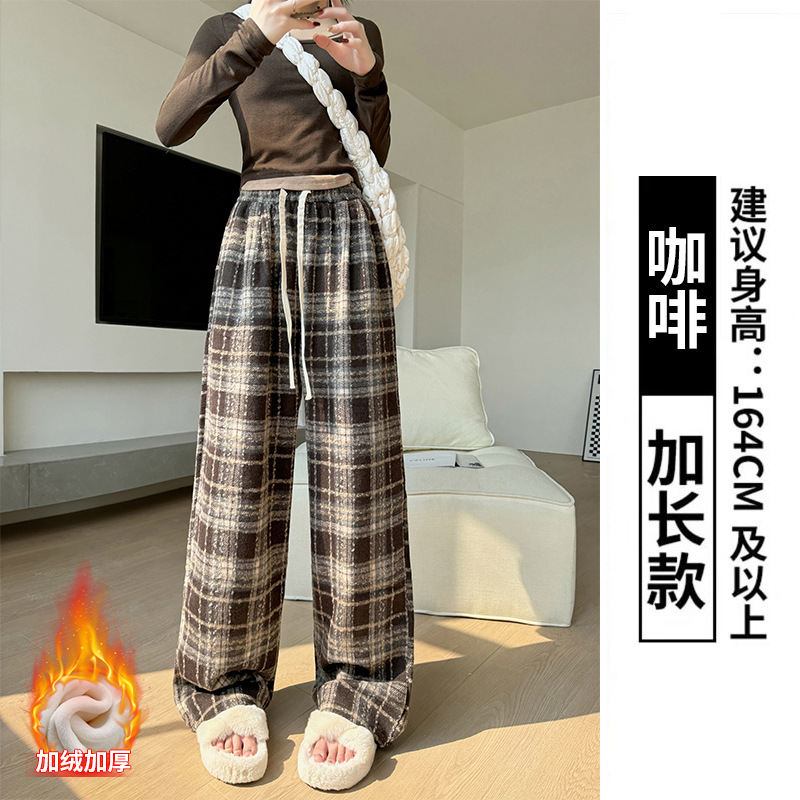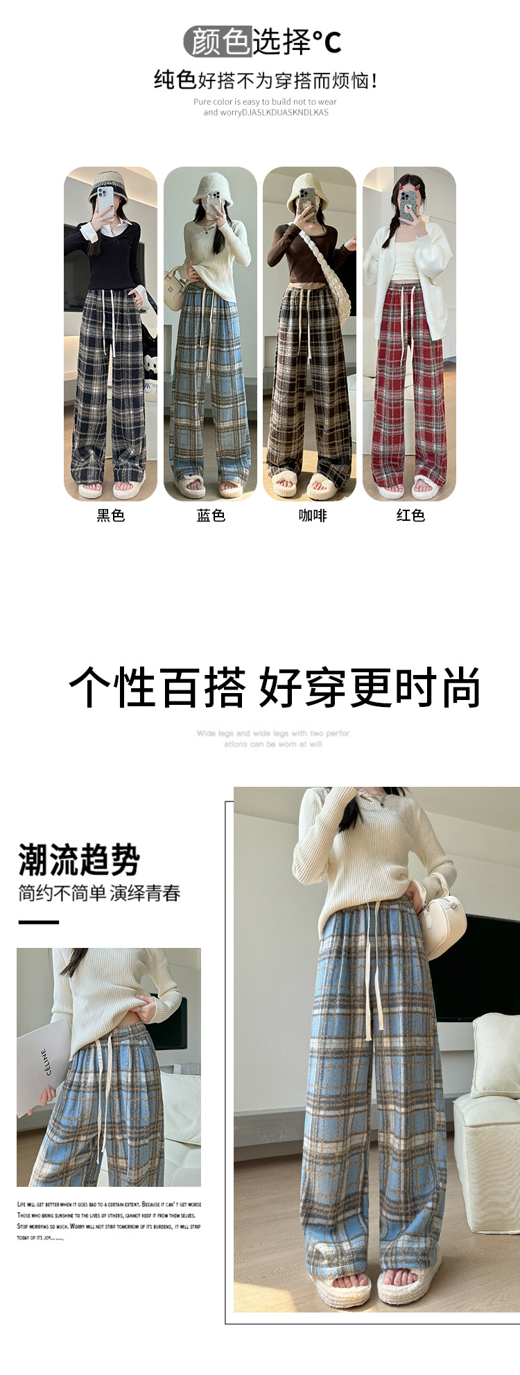 红色格子裤子女阔腿裤春秋新款垂感休闲直筒裤遛弯山本毛呢拖地裤