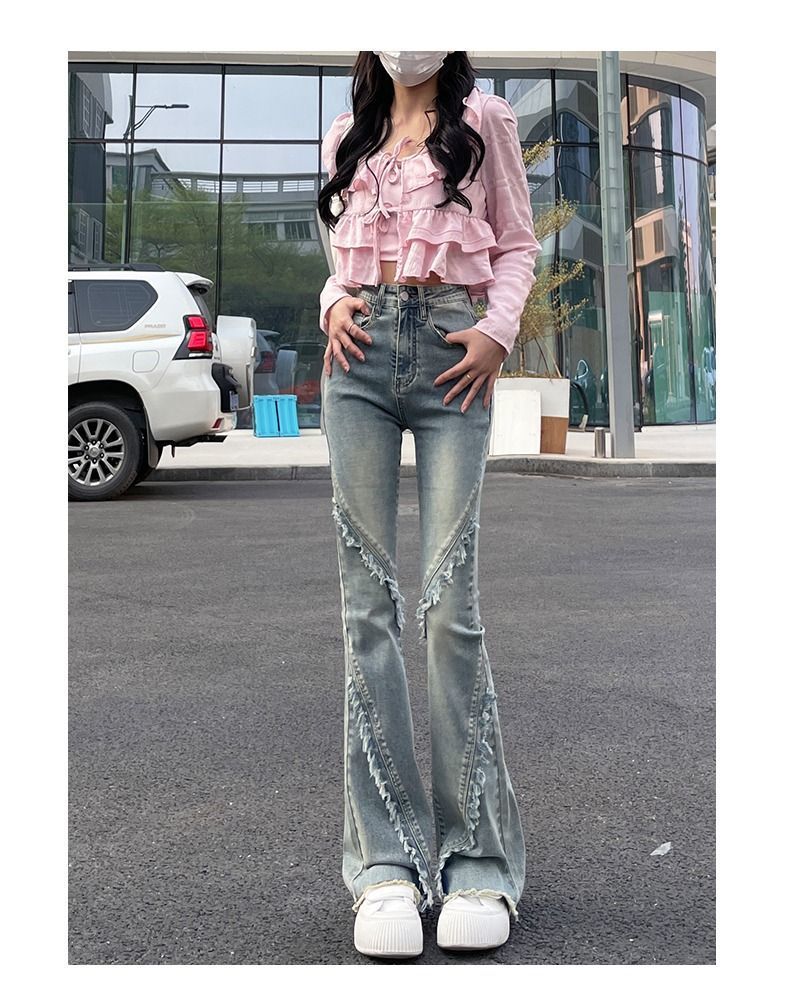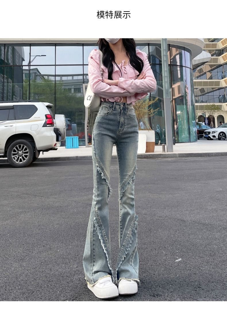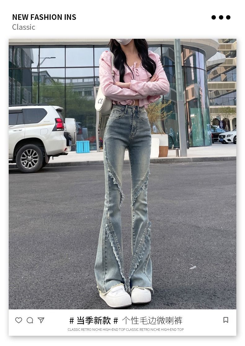 毛边微喇牛仔裤女春秋小个子新款怀旧马蹄裤修身拼接高腰喇叭长裤