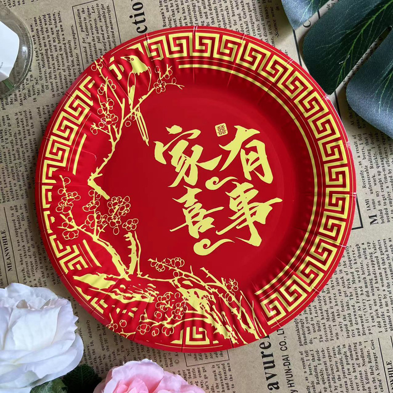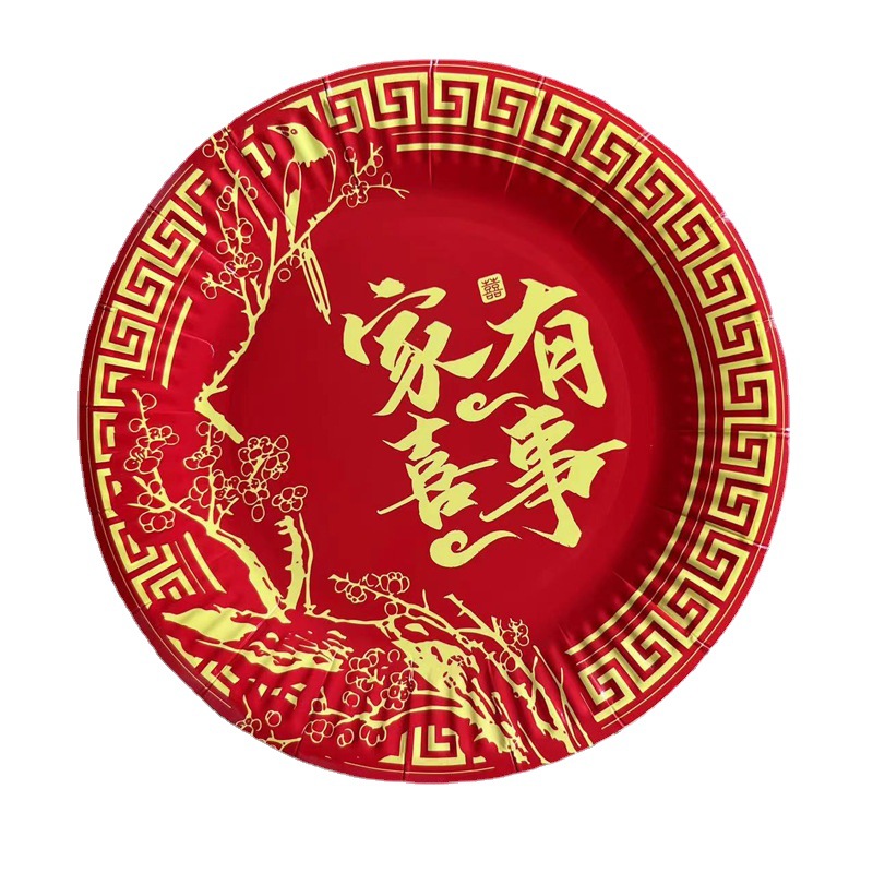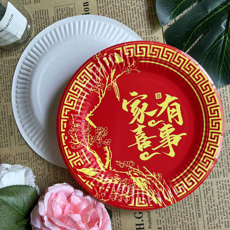 家有喜事喜庆盘7寸纸盘一次性白卡纸盘细纹纸盘派对盘子厂家批发