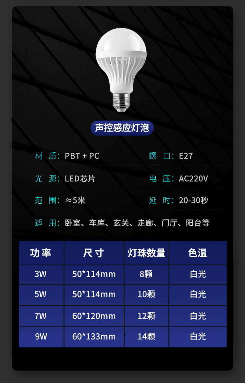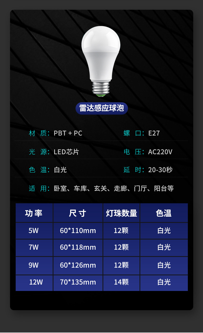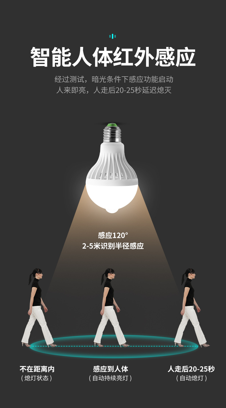 led球泡灯5W 楼梯过道人体感应灯智能声光控灯泡高亮螺口室内照明