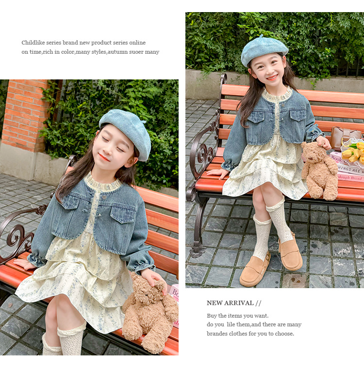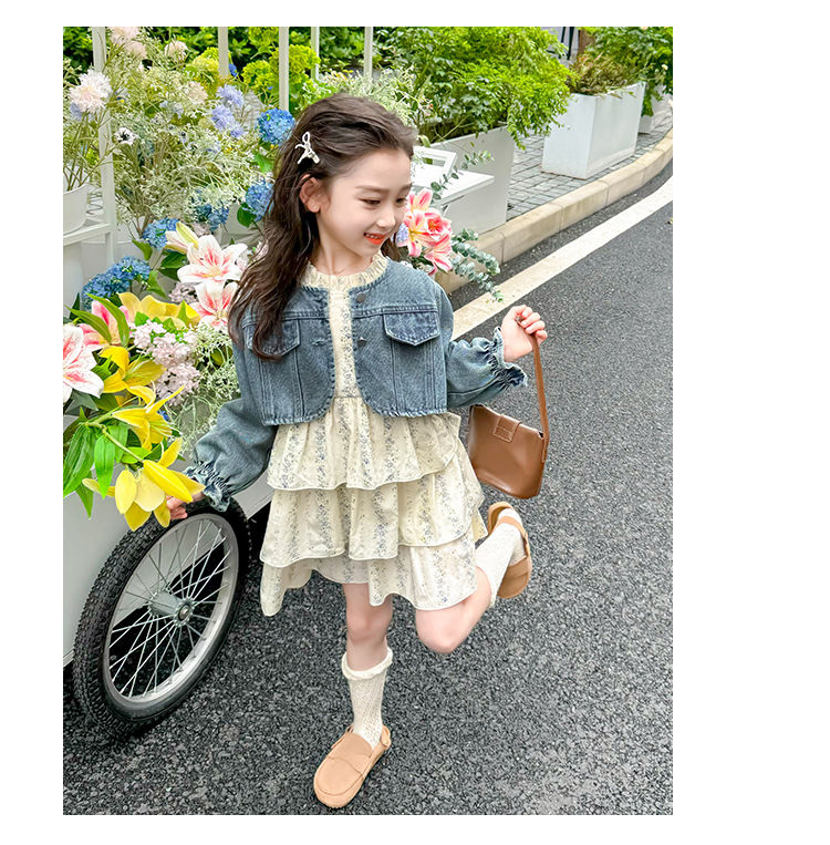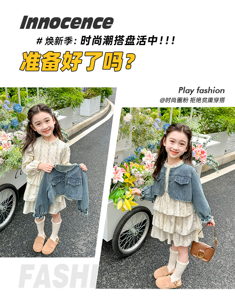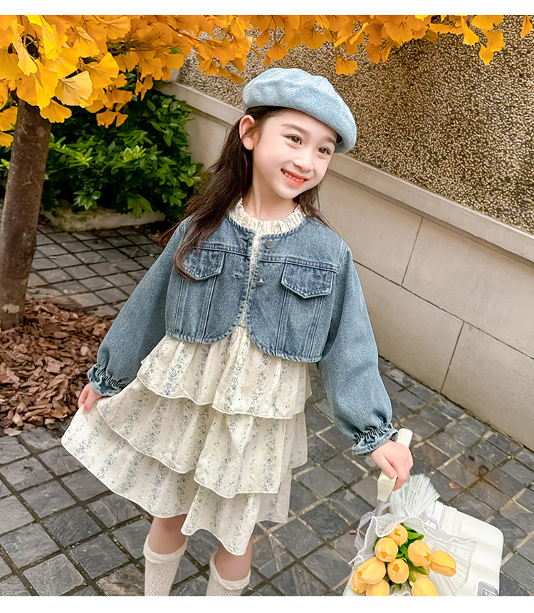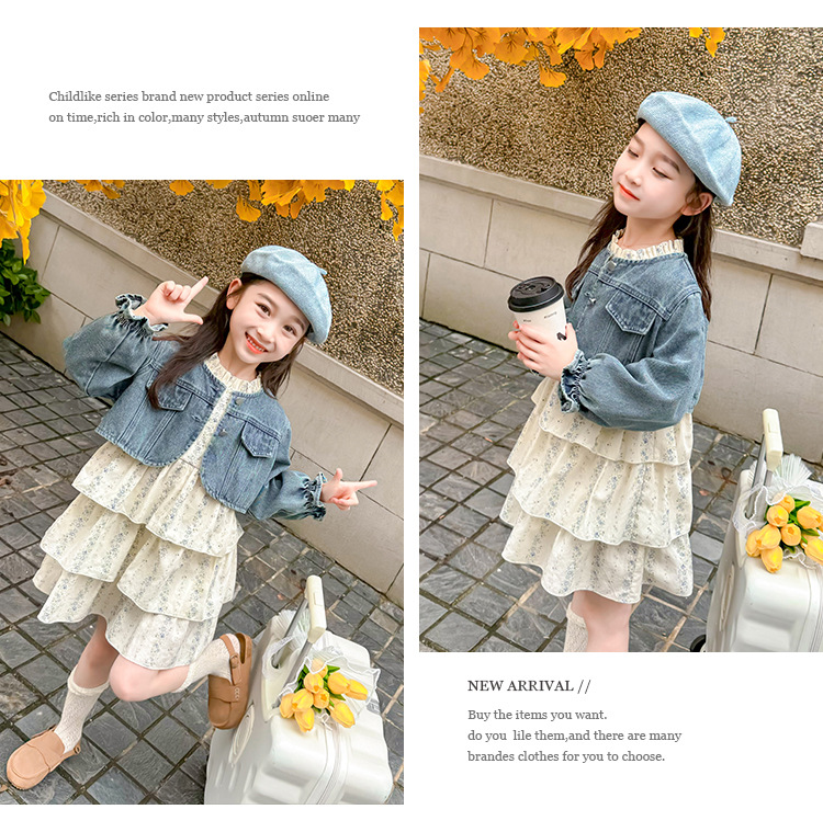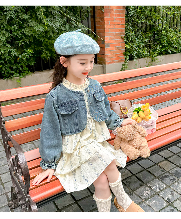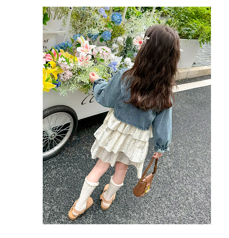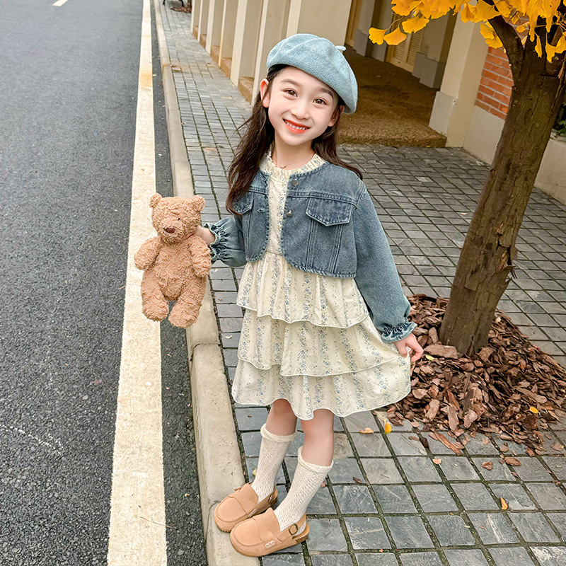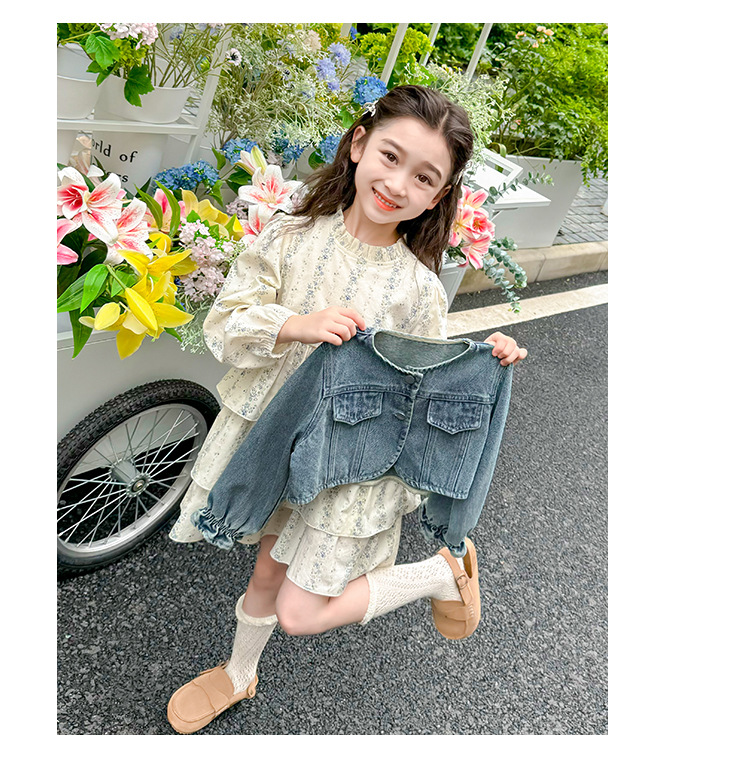 女童套装2024碎花裙秋款儿童时髦牛仔外套连衣裙宝宝两件套秋季