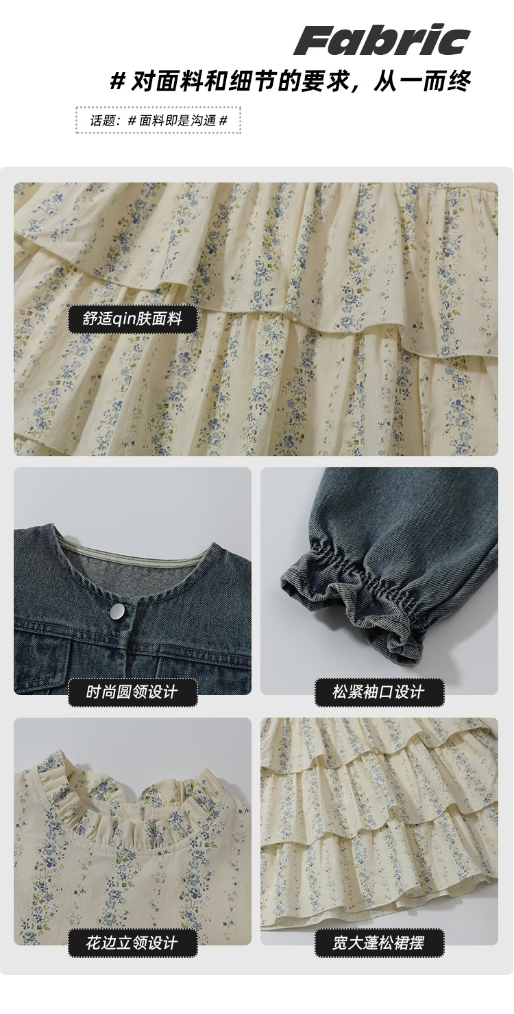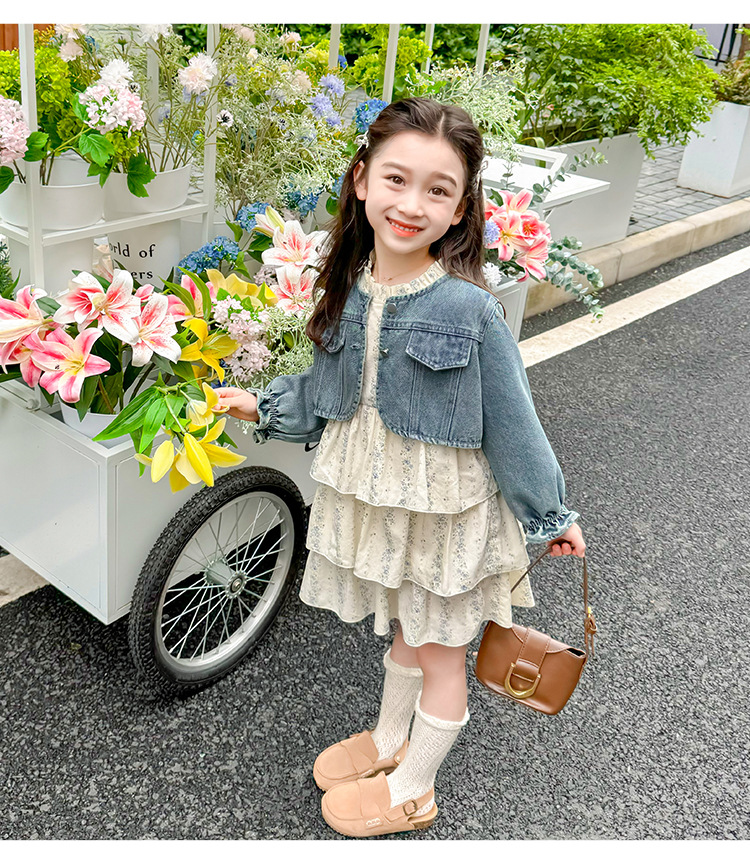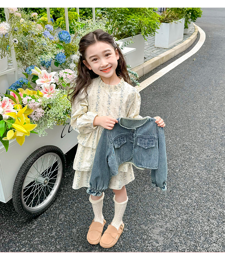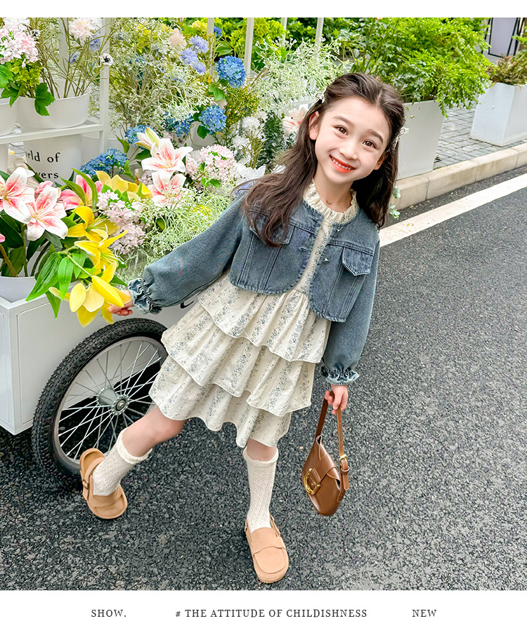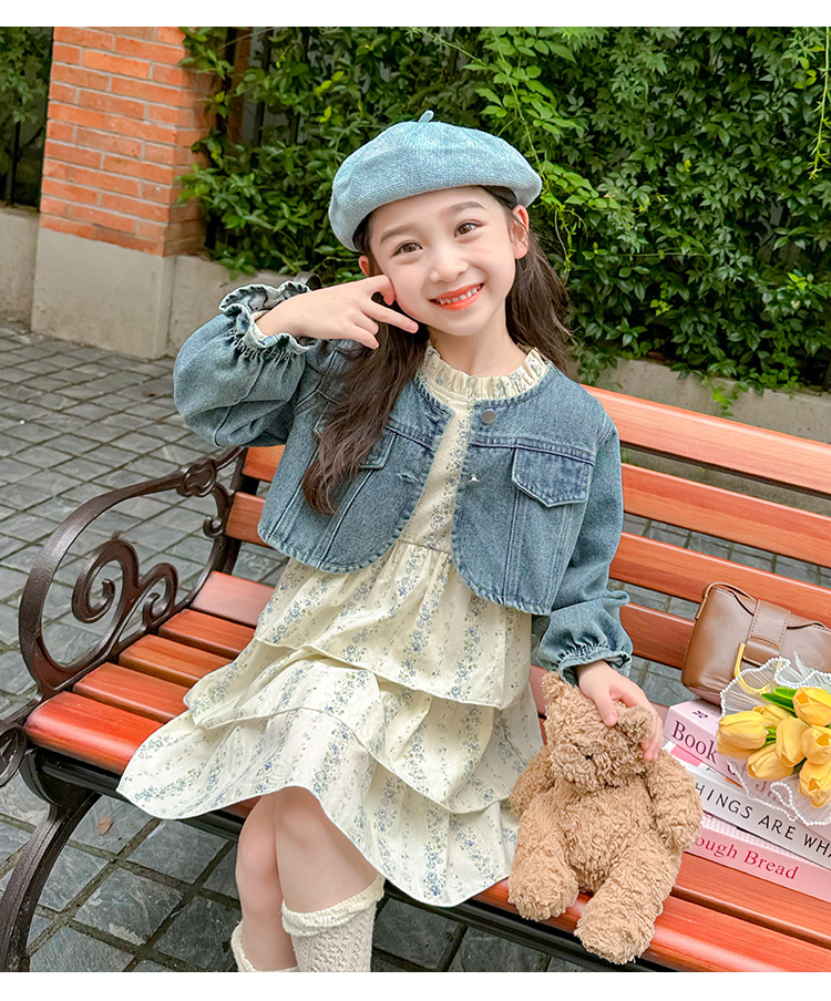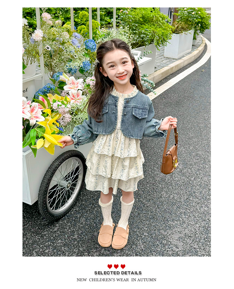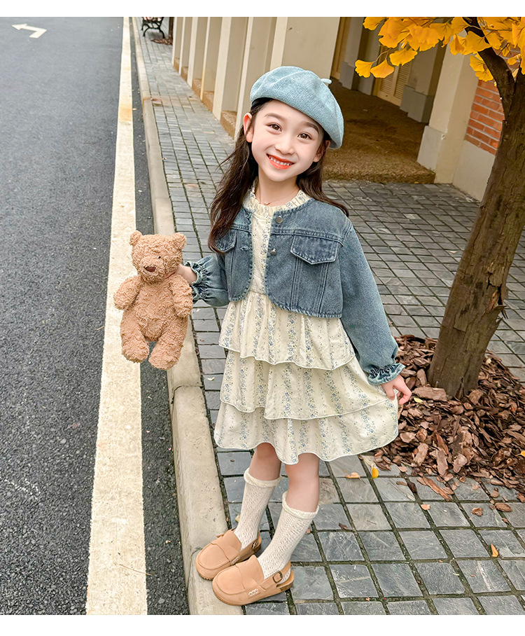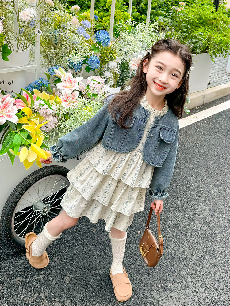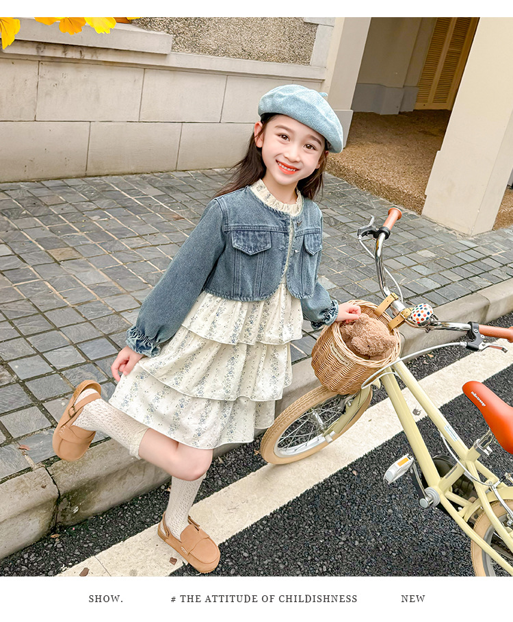 女童套装2024碎花裙秋款儿童时髦牛仔外套连衣裙宝宝两件套秋季