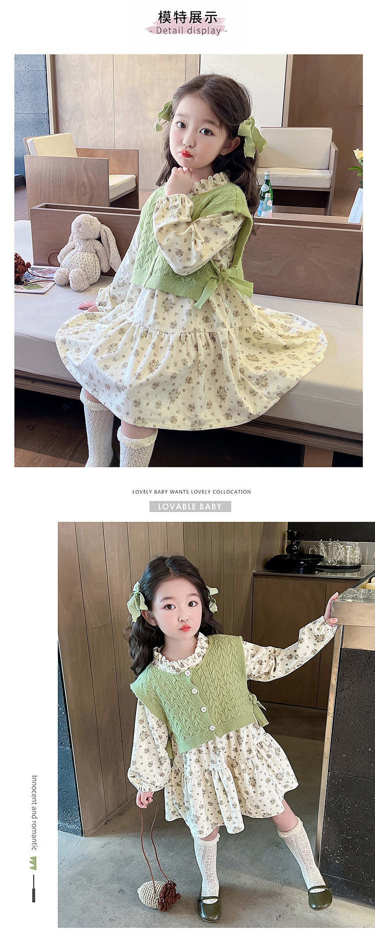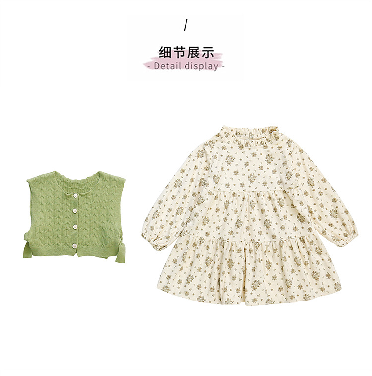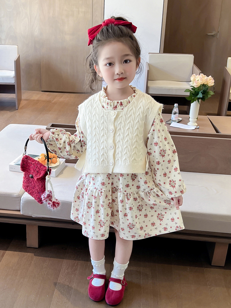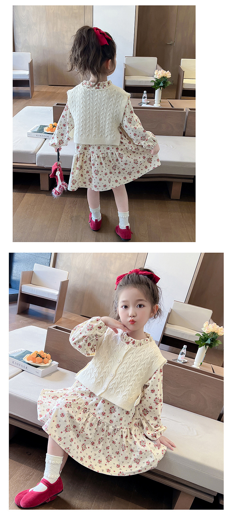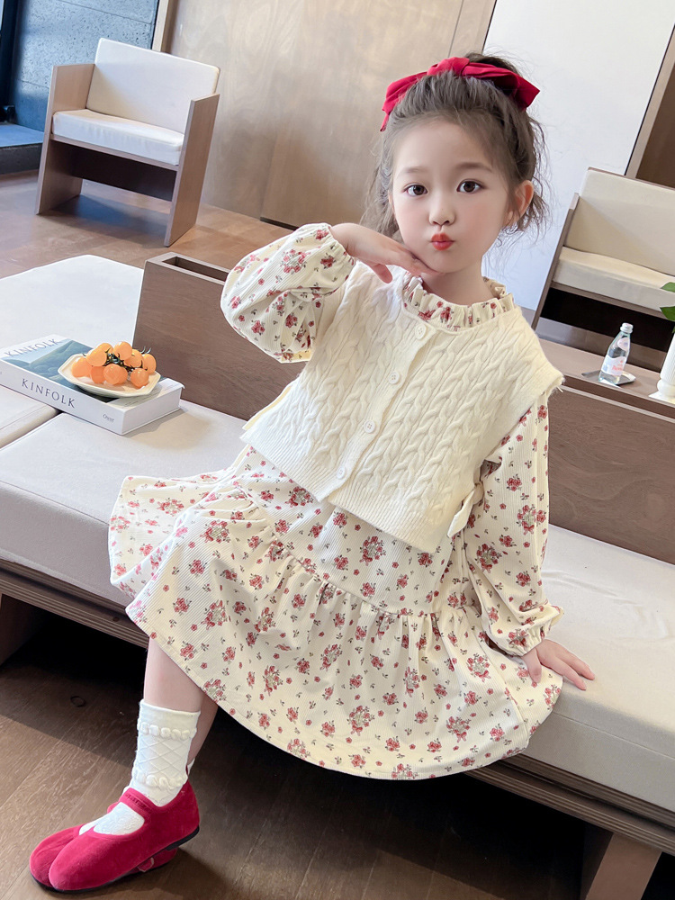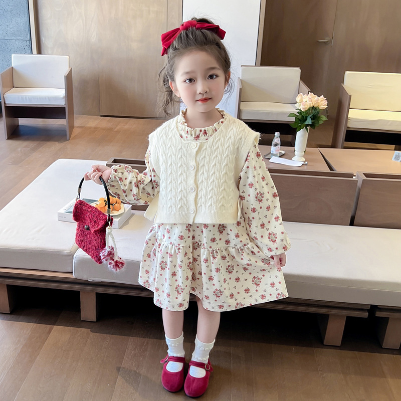 女童春秋碎花连衣裙新款儿童洋气毛线衣马甲春秋款女宝宝连衣裙潮