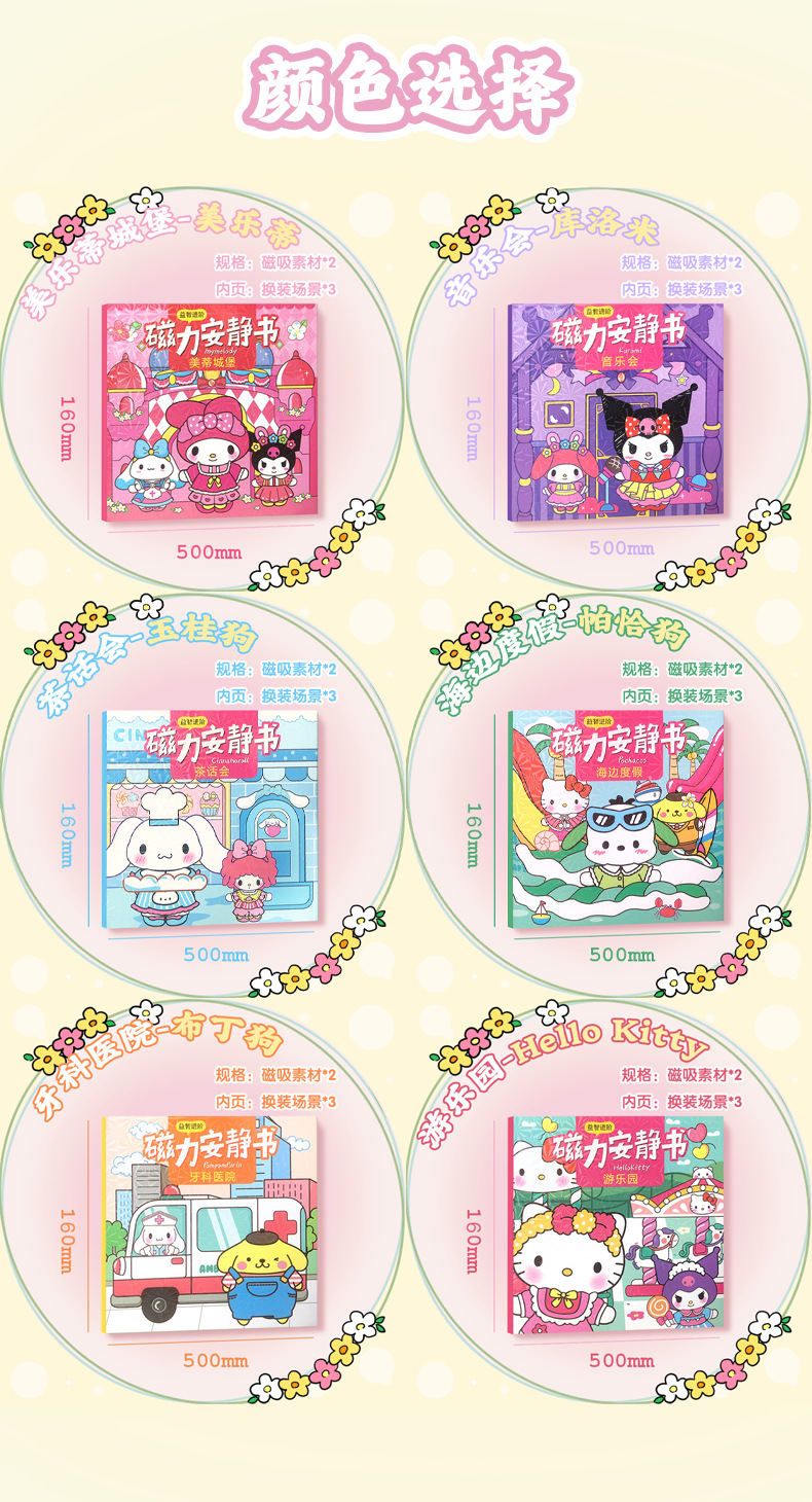 三丽鸥安静书磁力安静书新款可反复粘贴DIY卡通免剪裁白卡16*16CM