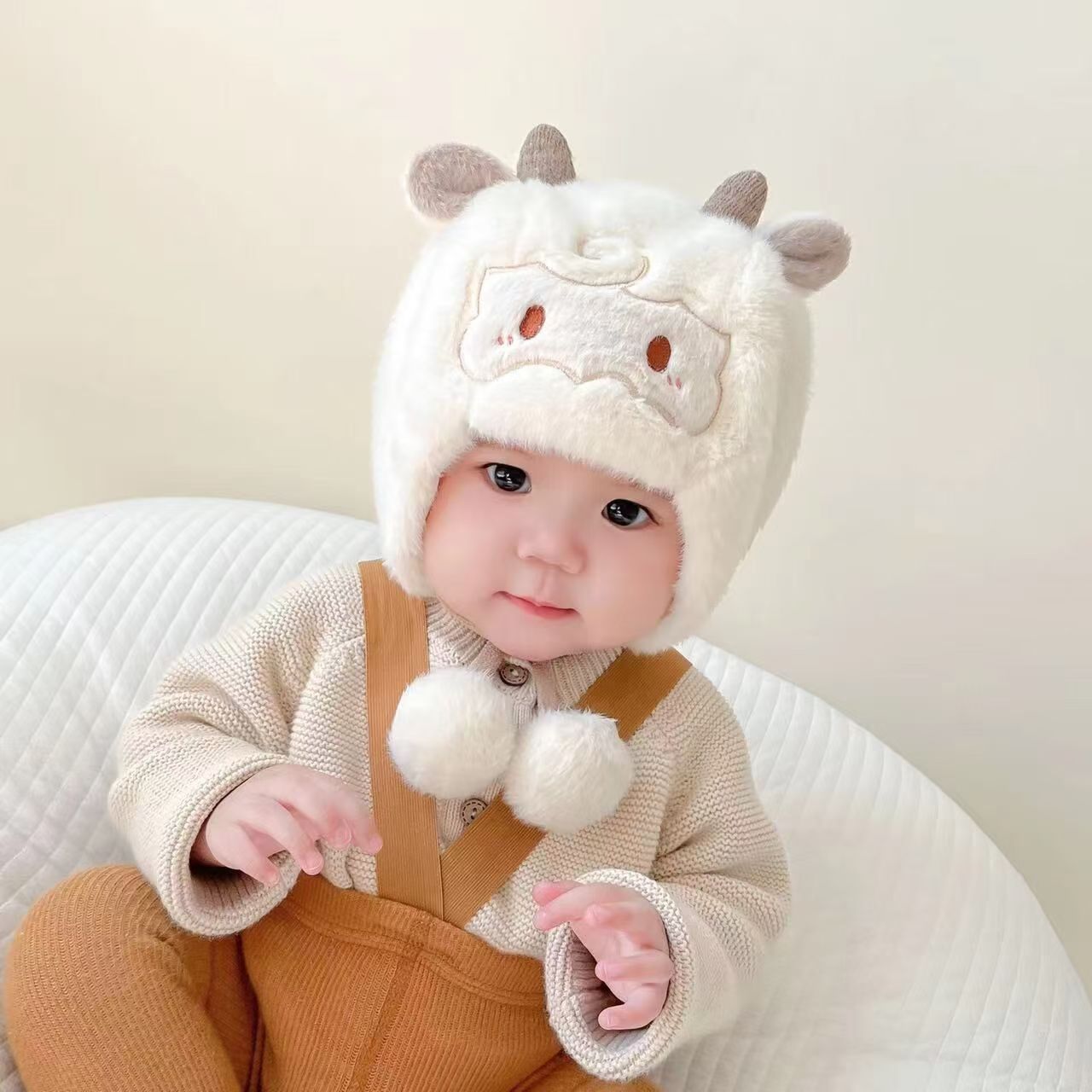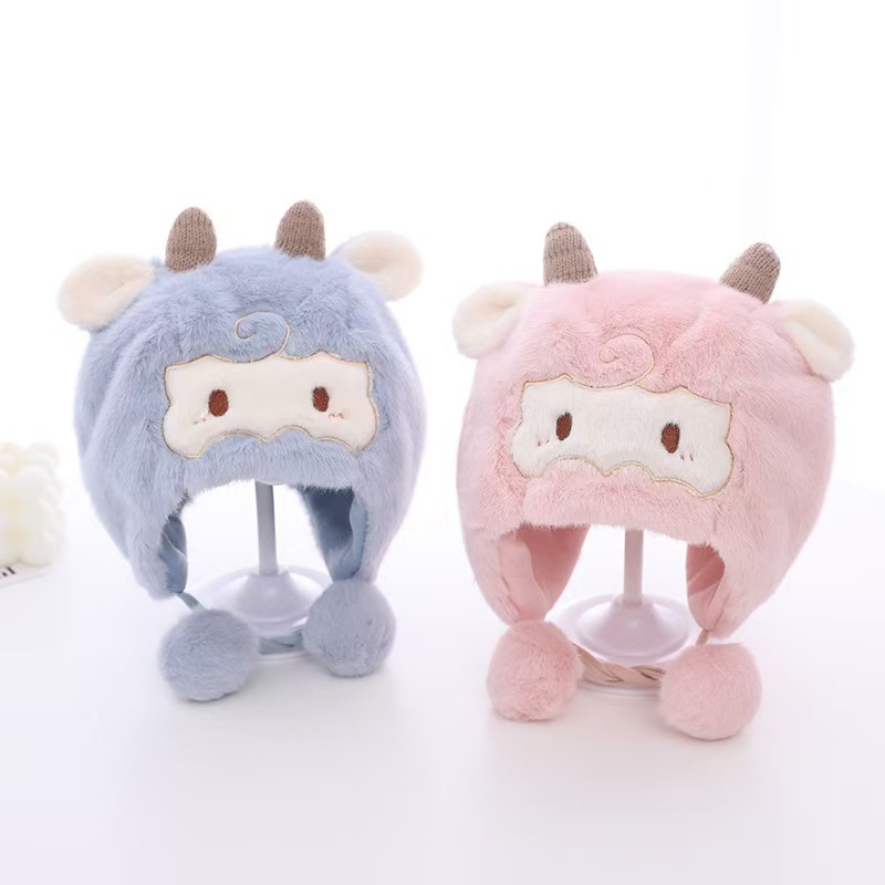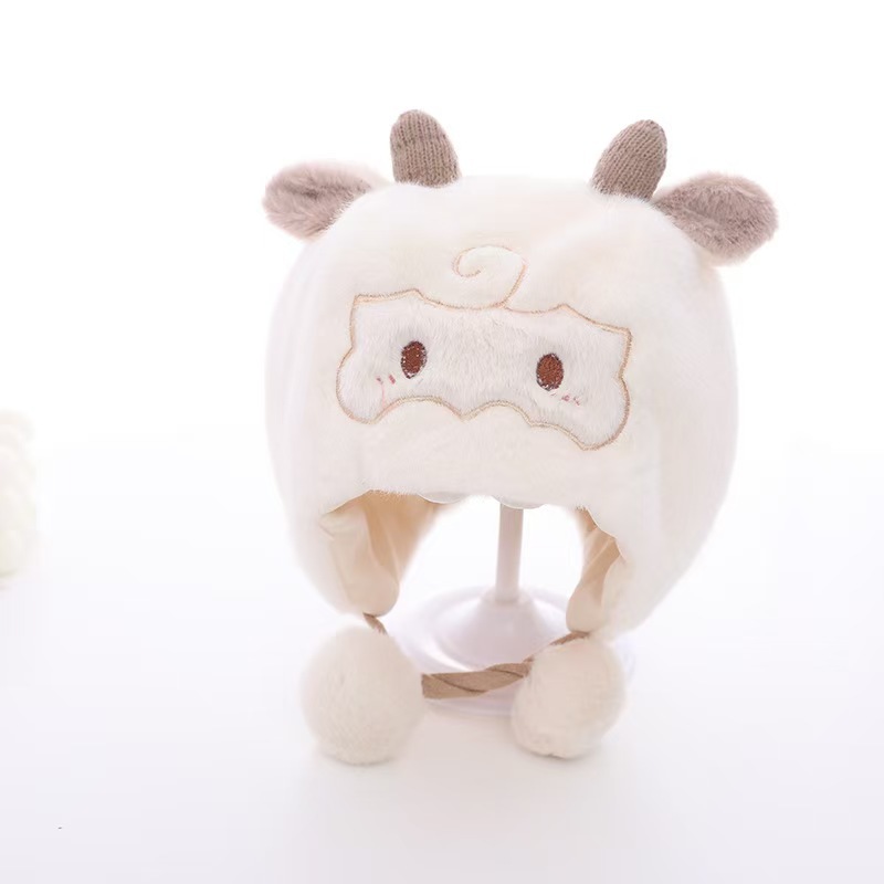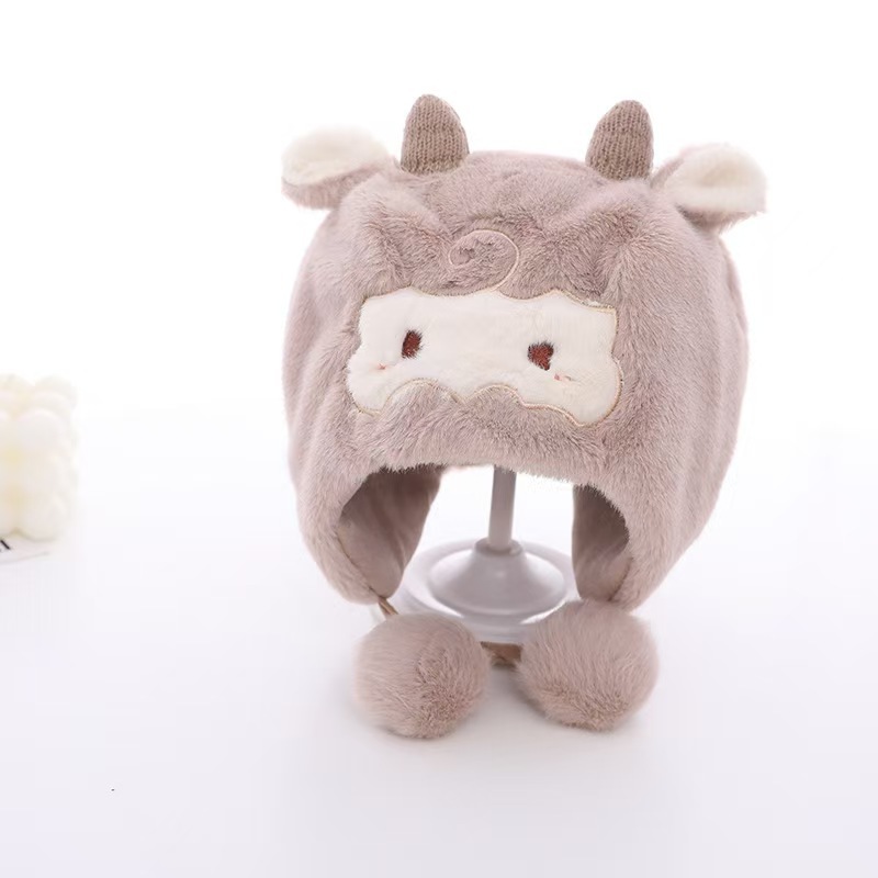 可爱羊角宝宝帽子秋冬新款毛绒卡通套头帽男女超萌保暖防寒护耳帽