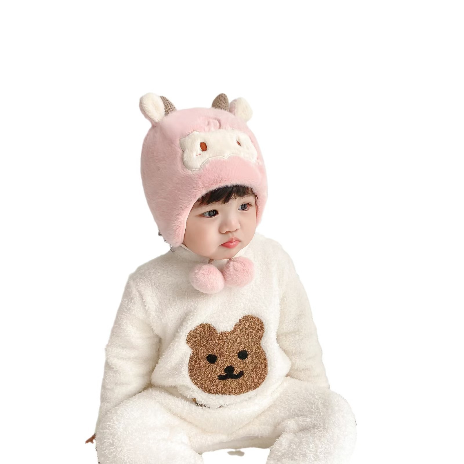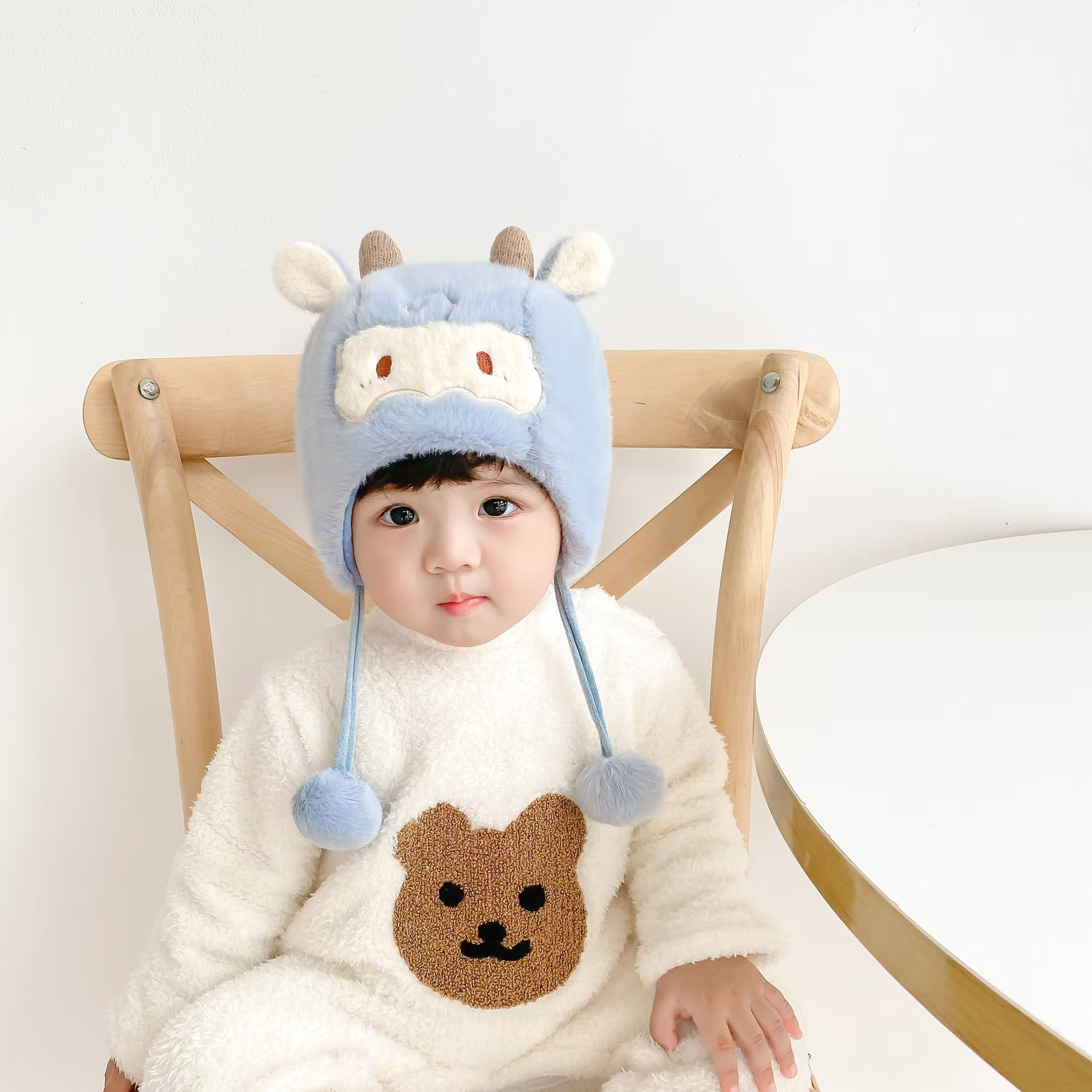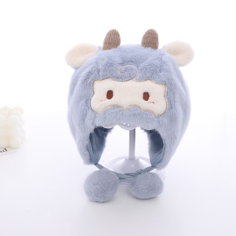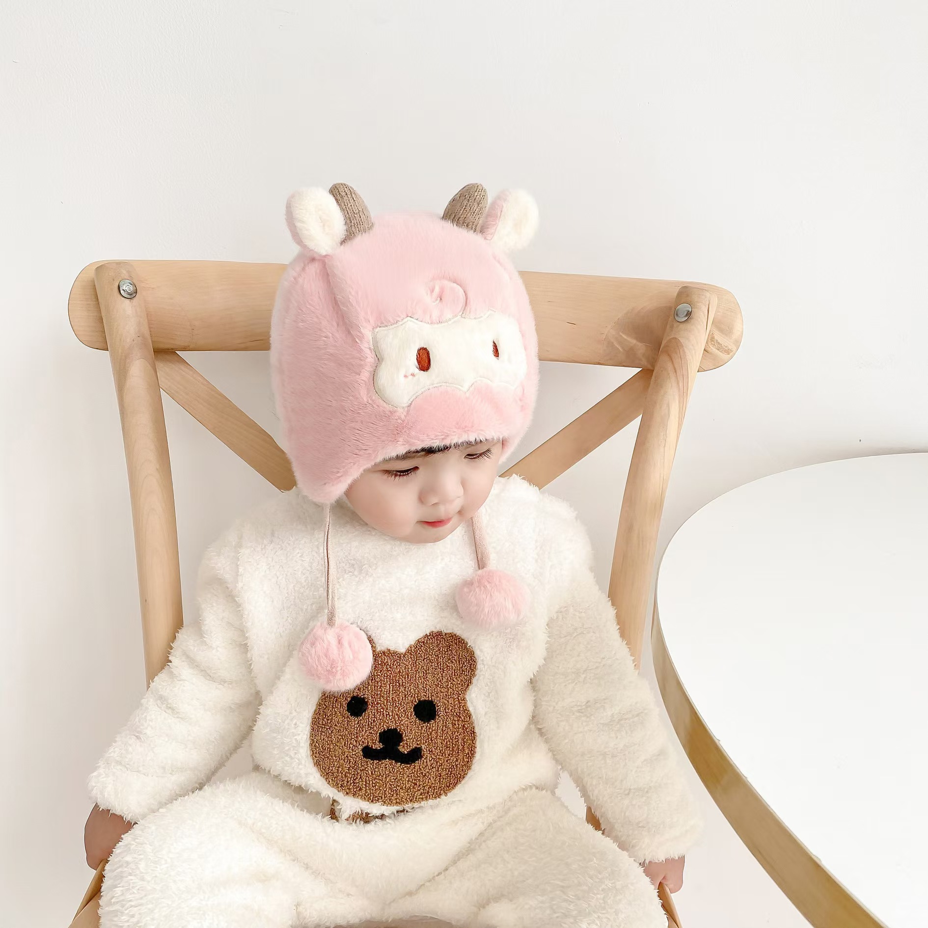 可爱羊角宝宝帽子秋冬新款毛绒卡通套头帽男女超萌保暖防寒护耳帽