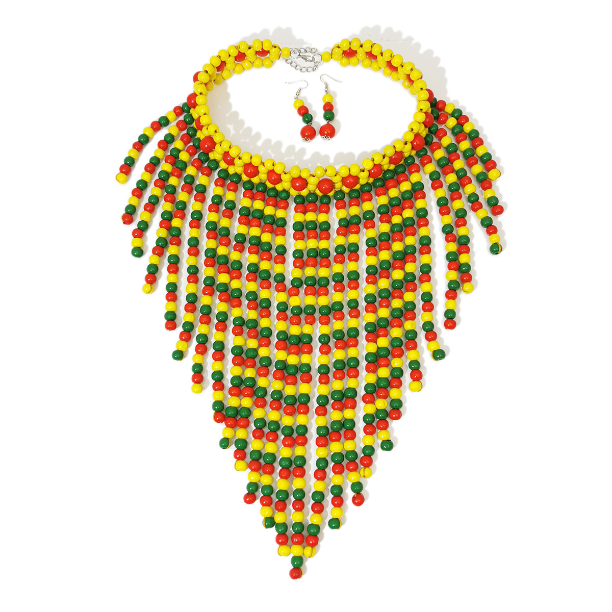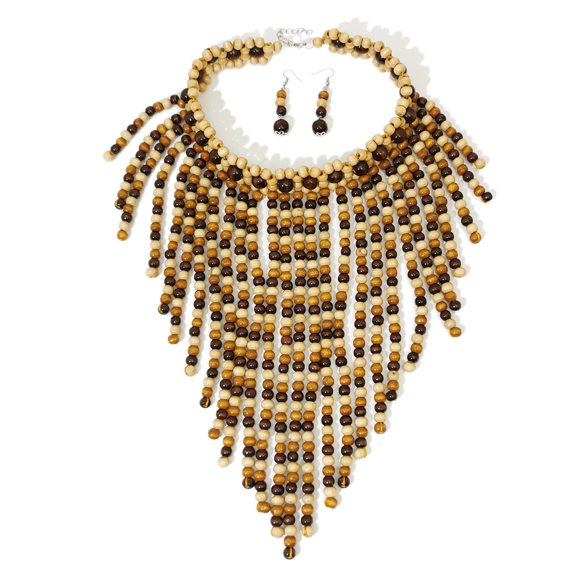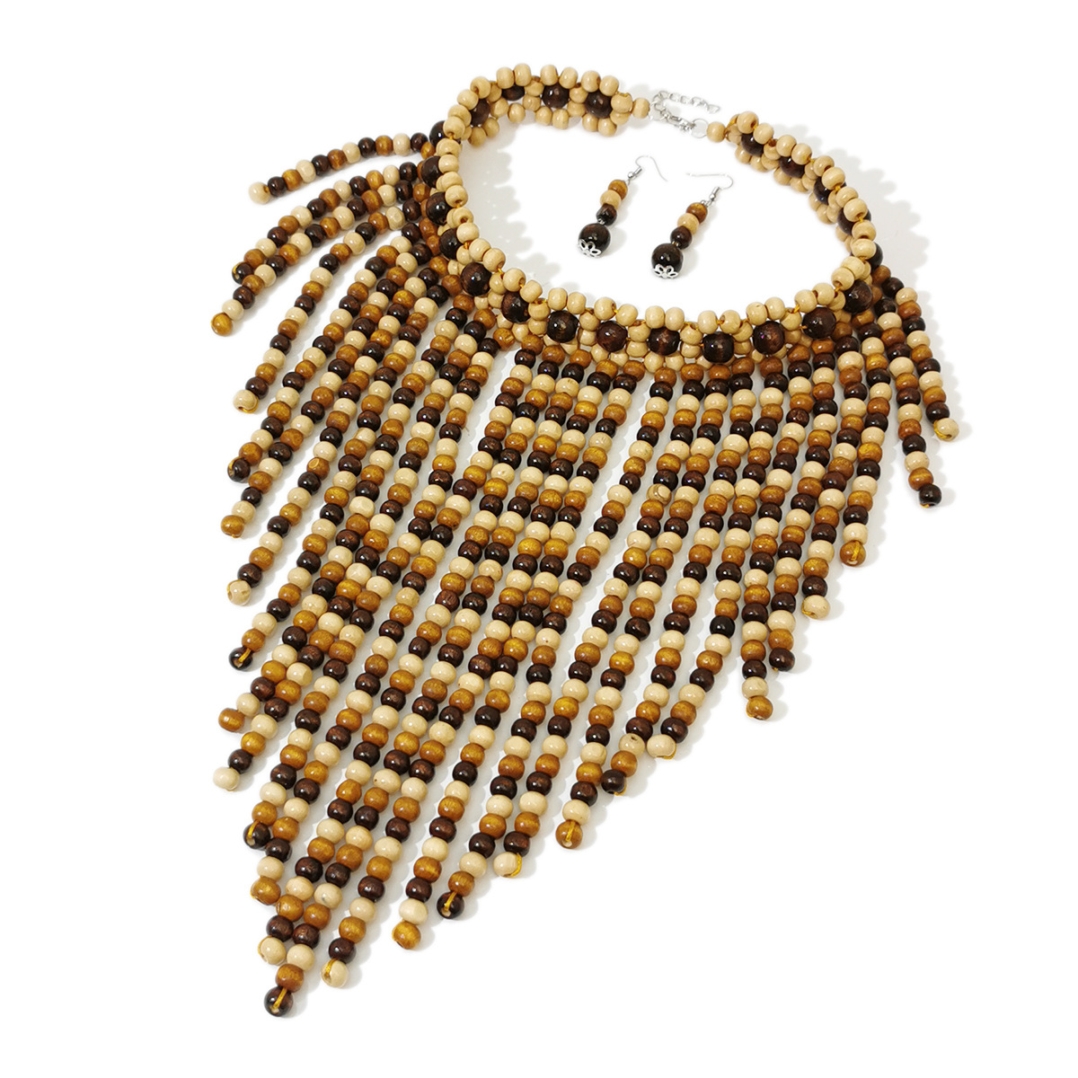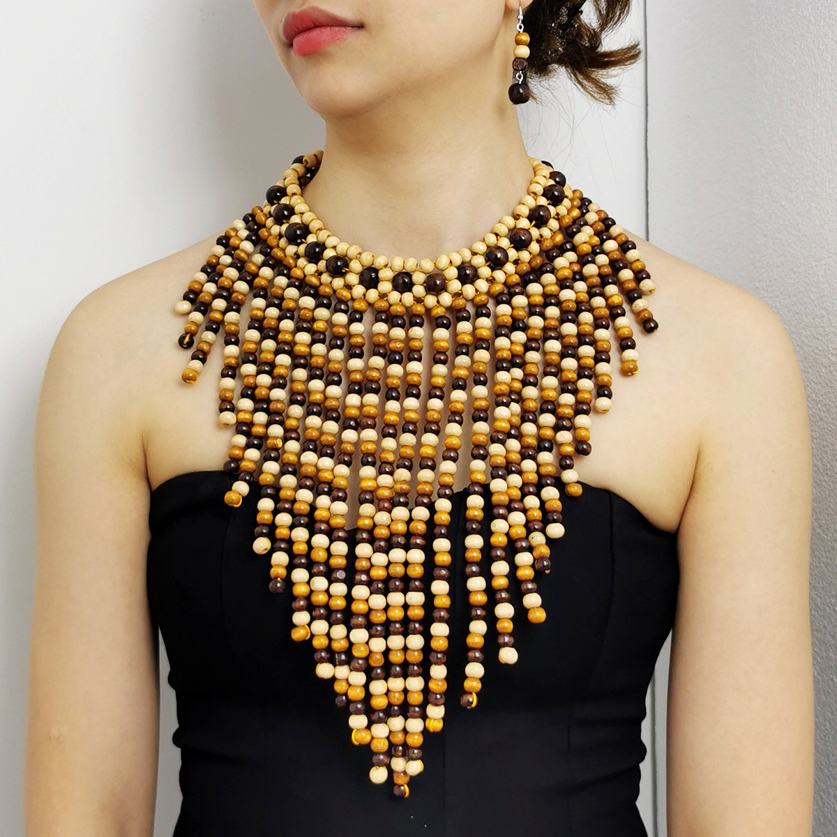 非洲部落风格配饰手工制作长木珠流苏女士夸张项链耳环套装大时尚