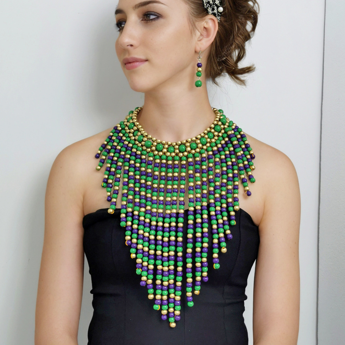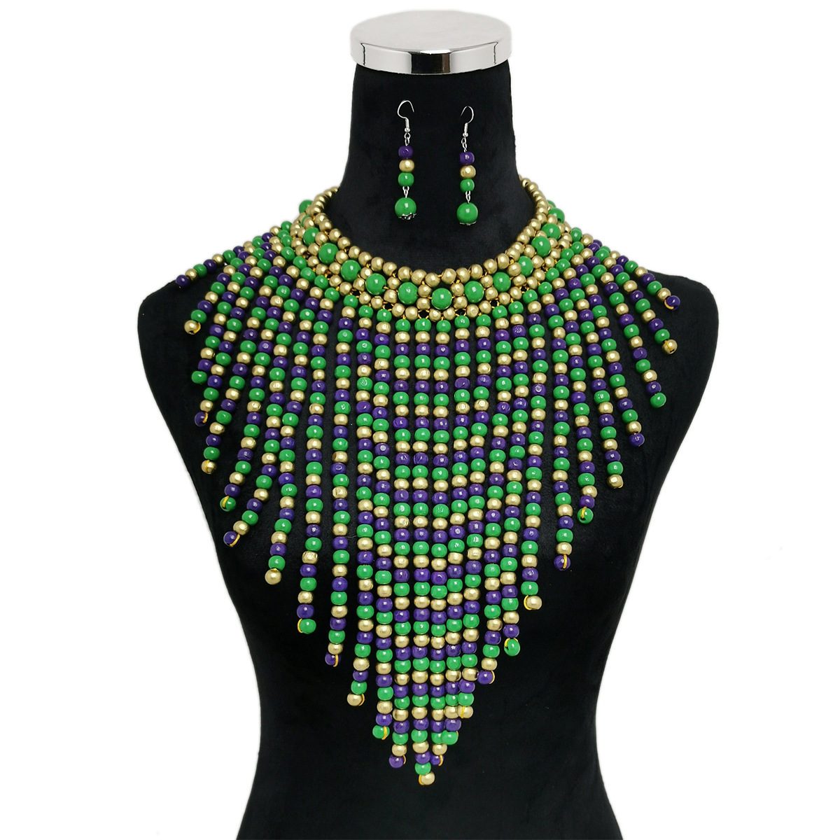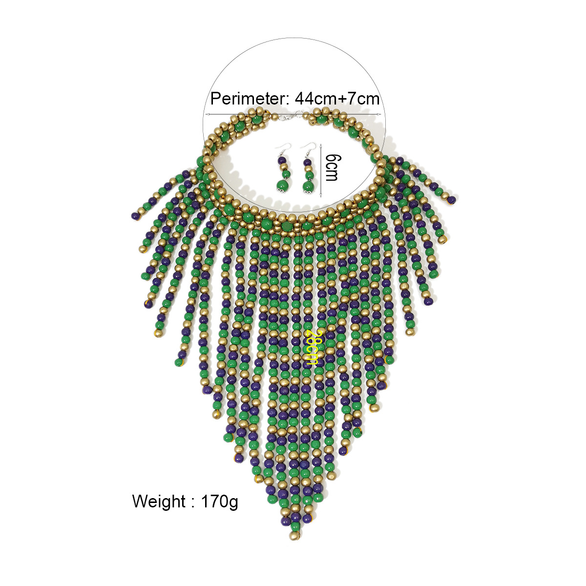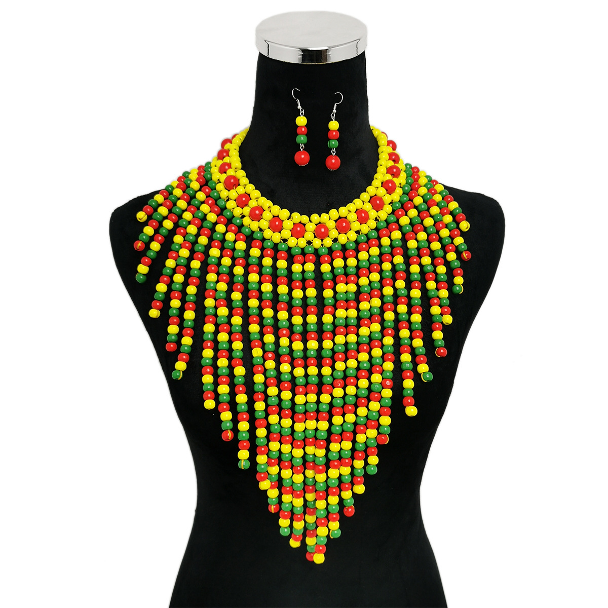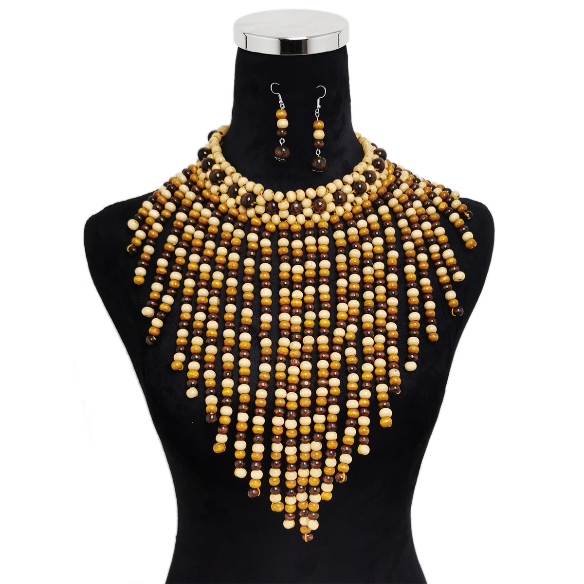 非洲部落风格配饰手工制作长木珠流苏女士夸张项链耳环套装大时尚
