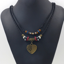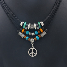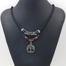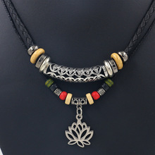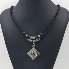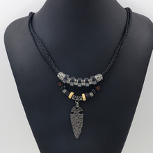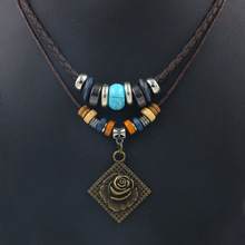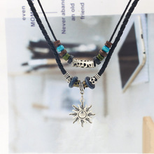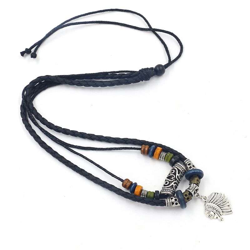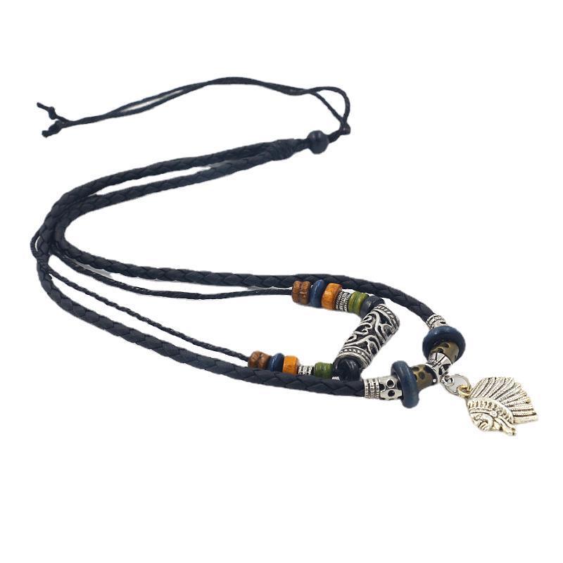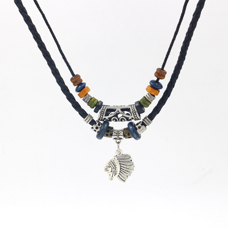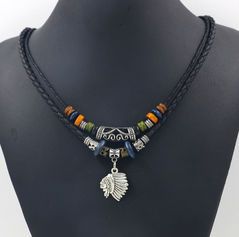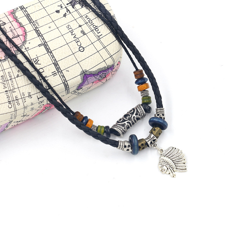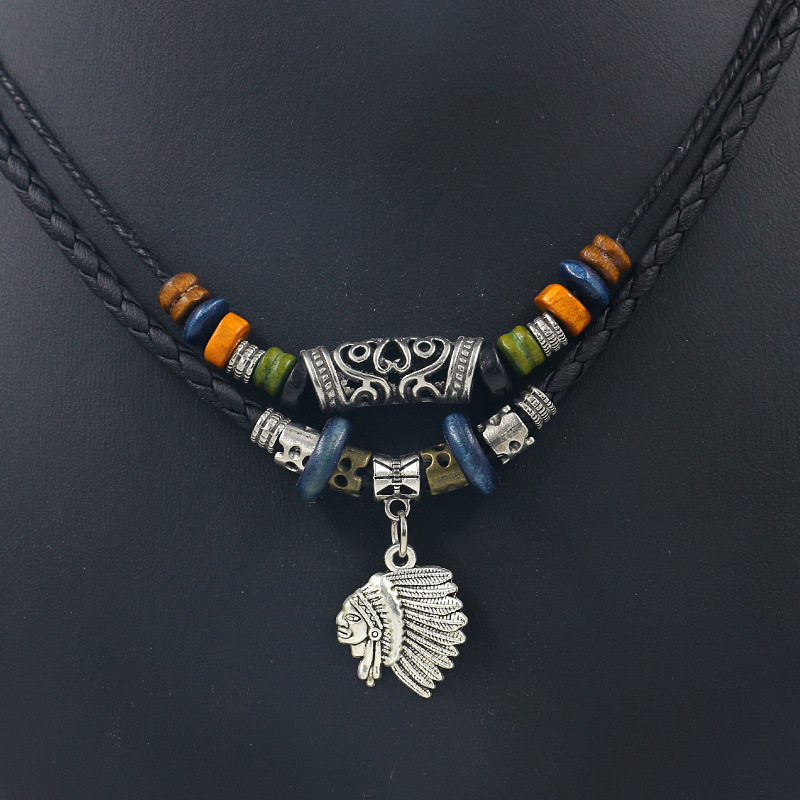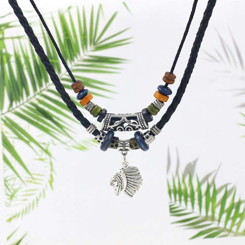 异域复古男士部落首领项链多层串珠印第安头像吊坠手工编织项饰品