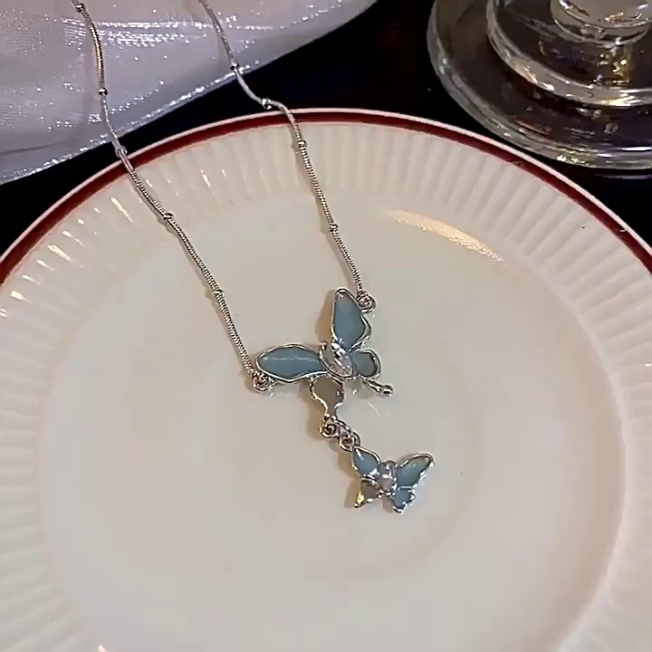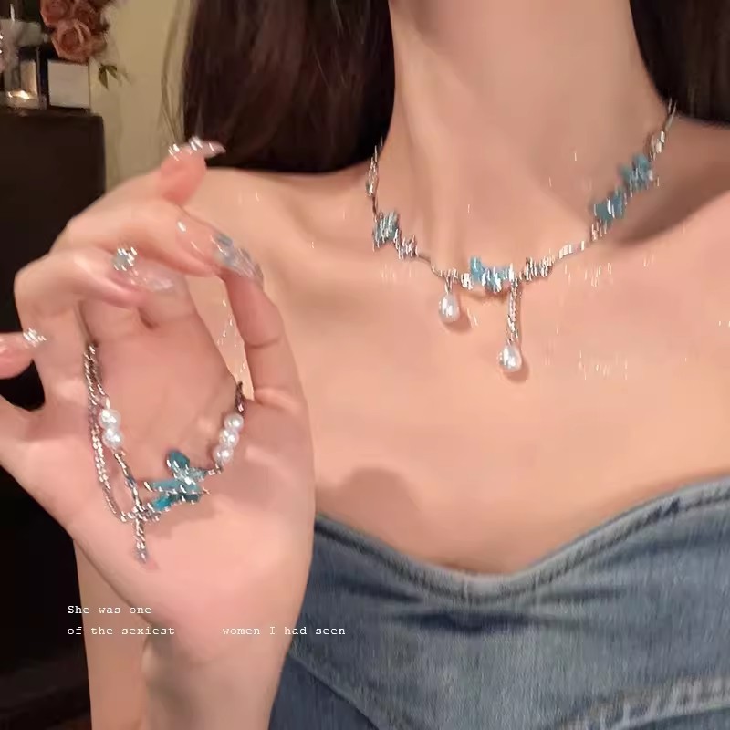 饰品小众高级感锁骨链颈链甜酷辣妹风清冷感蓝色蝴蝶珍珠项链女