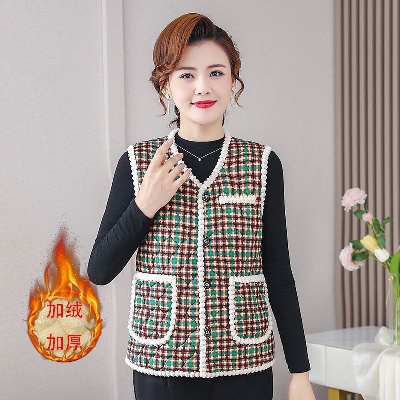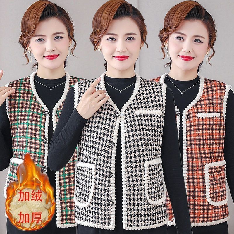 时尚中年妈妈秋冬装小香风格子马甲外套女士外穿加绒保暖坎肩背心