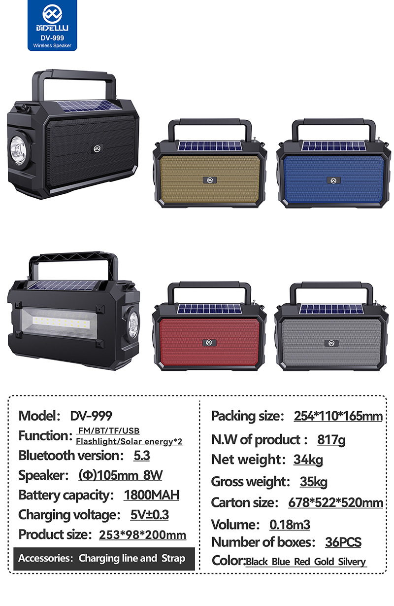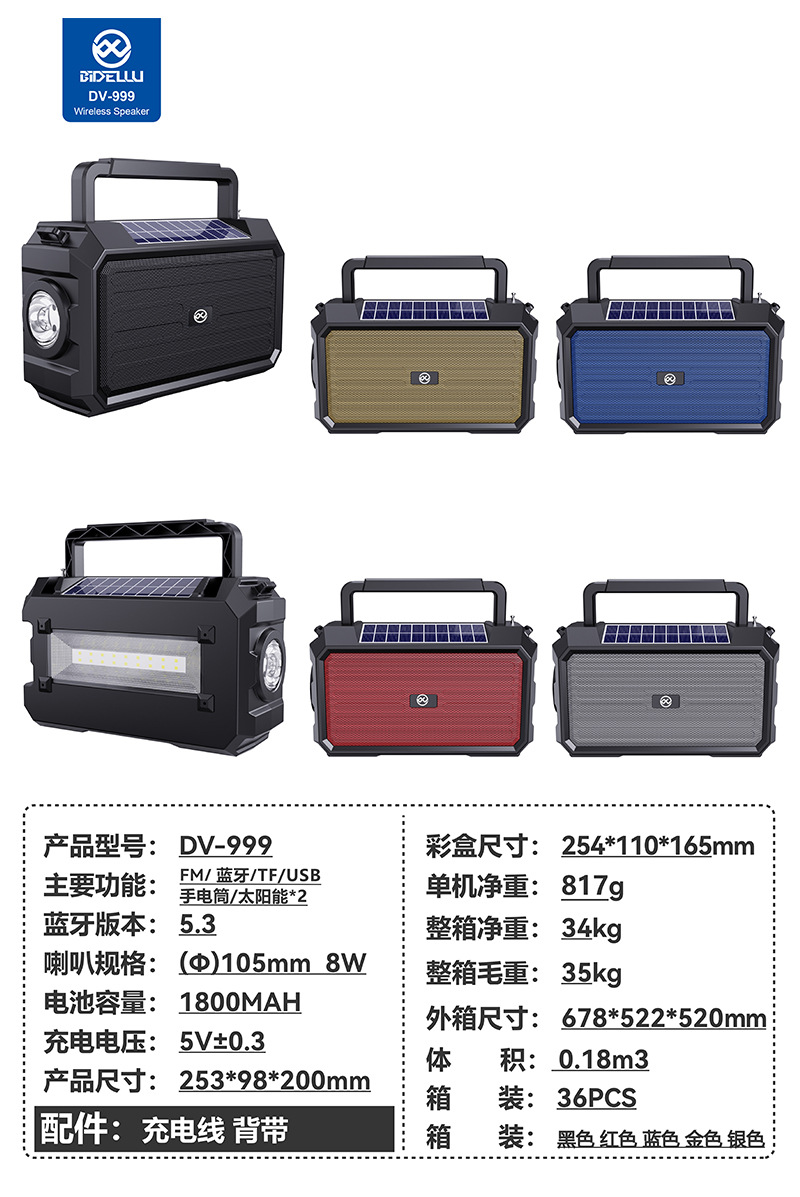 DV-999太阳能音响蓝牙无线插口户外收音机蓝多功能便捷式蓝牙音箱