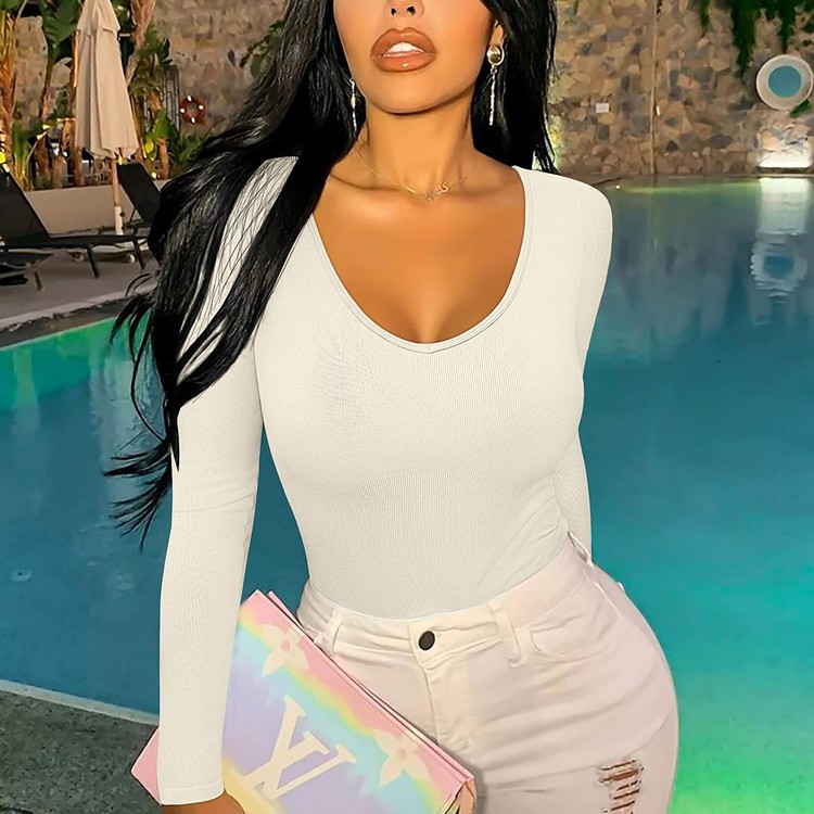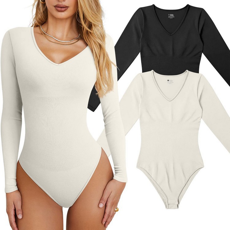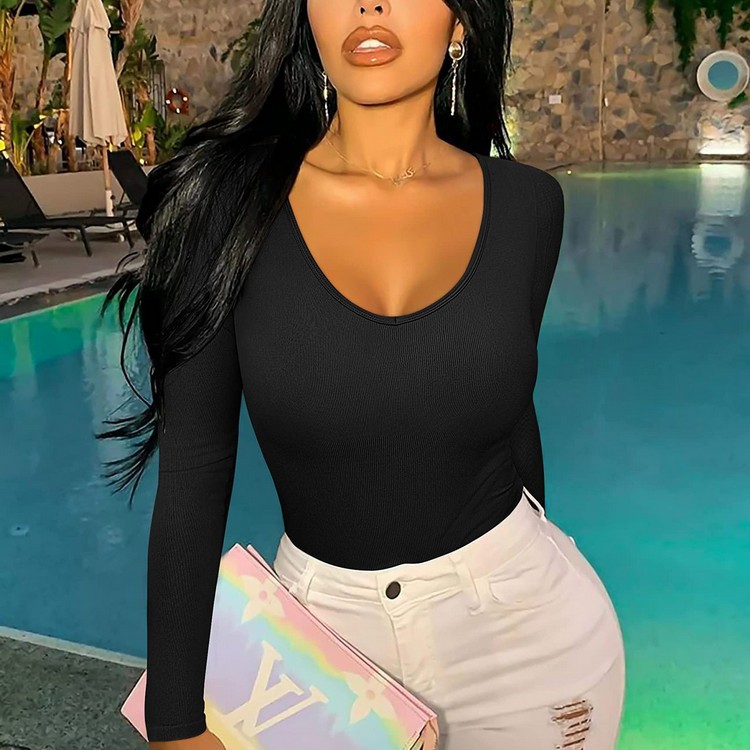 现货丁字裆性感纯色V领连体衣长袖透气速干罗纹T恤瑜伽服连体裤女