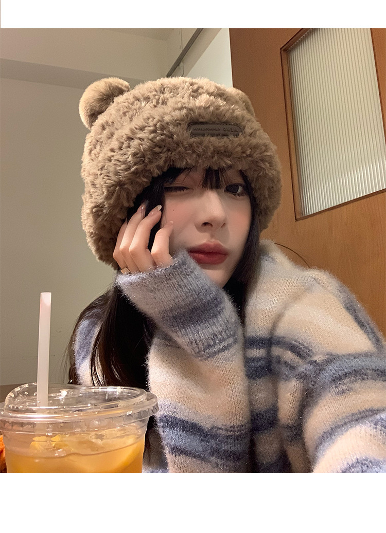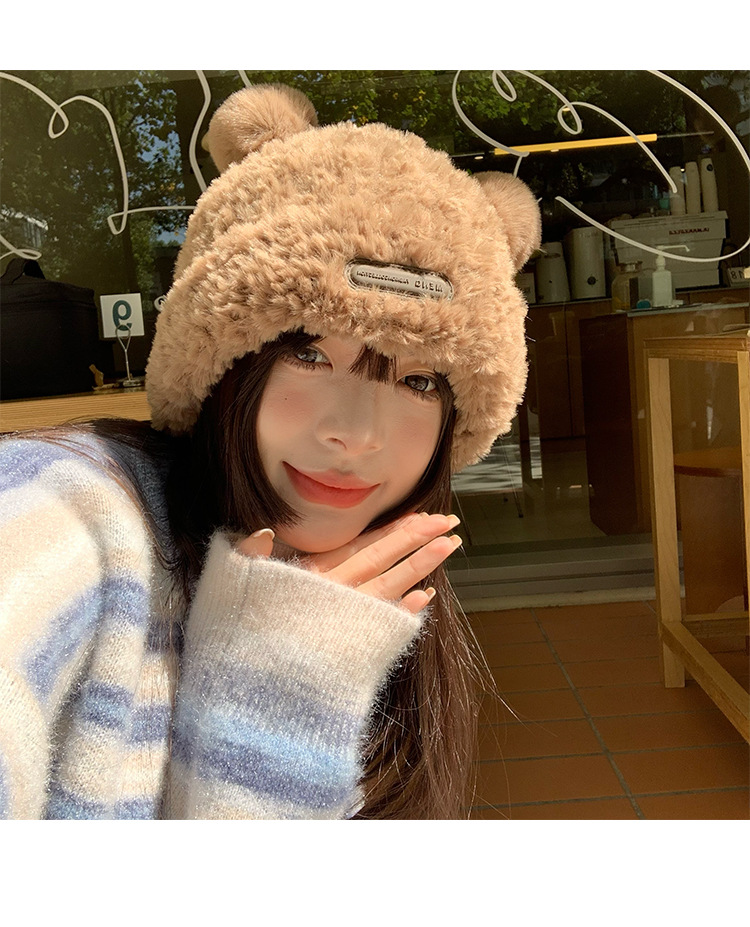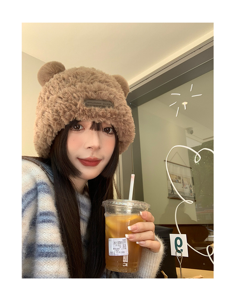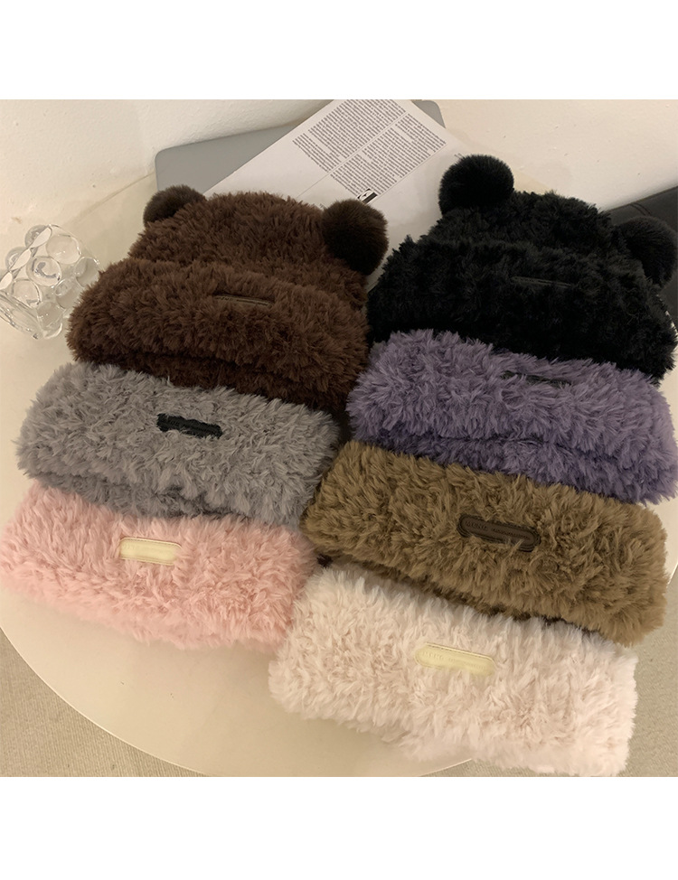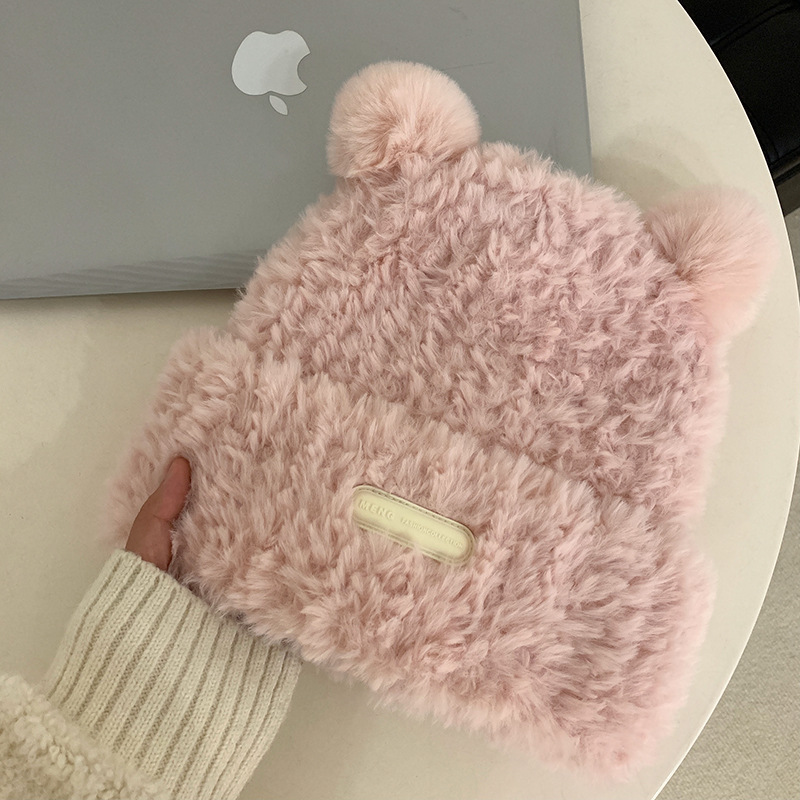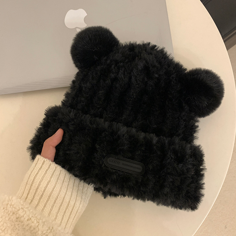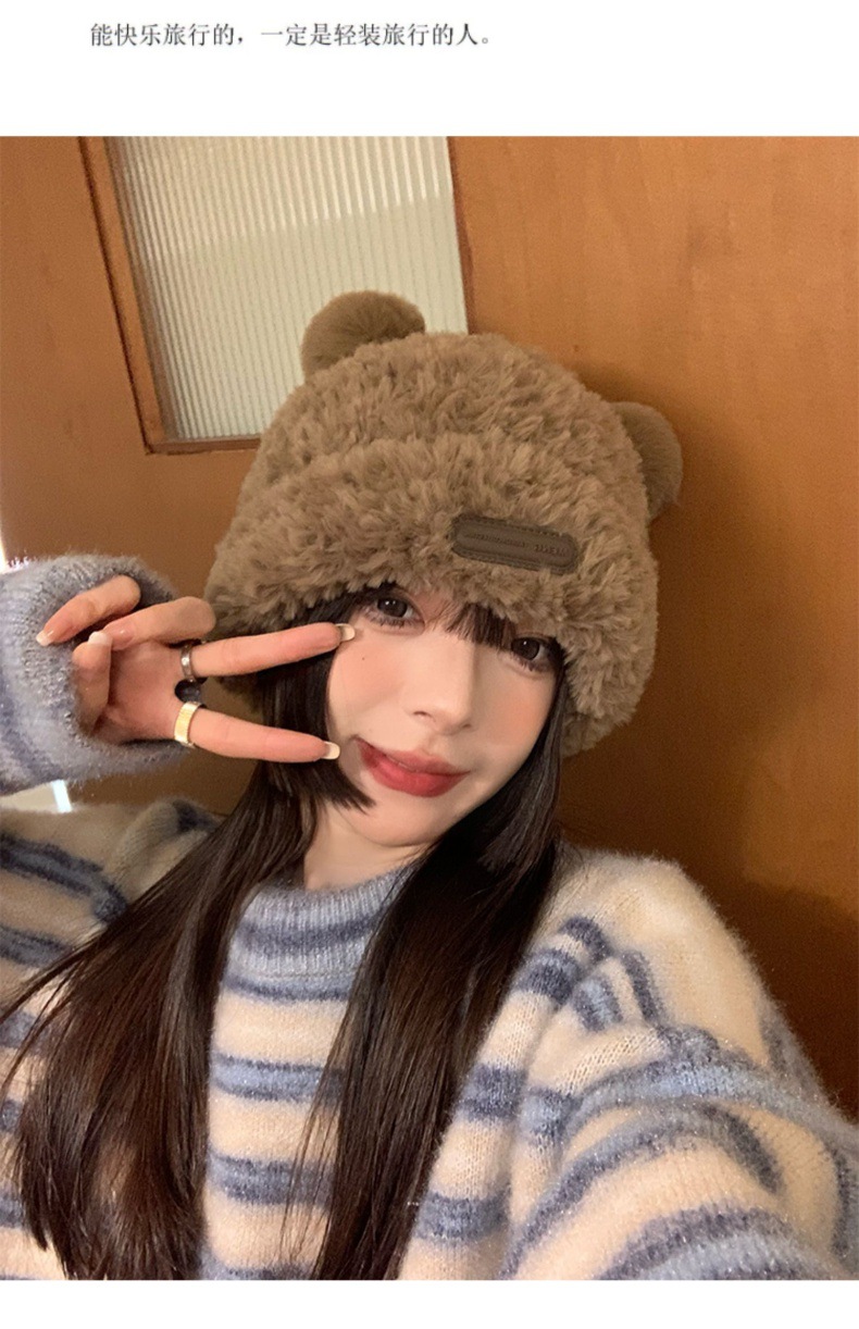 可爱小熊毛线帽子女冬季2023年爆款毛绒保暖毛毛秋冬大头围针织帽