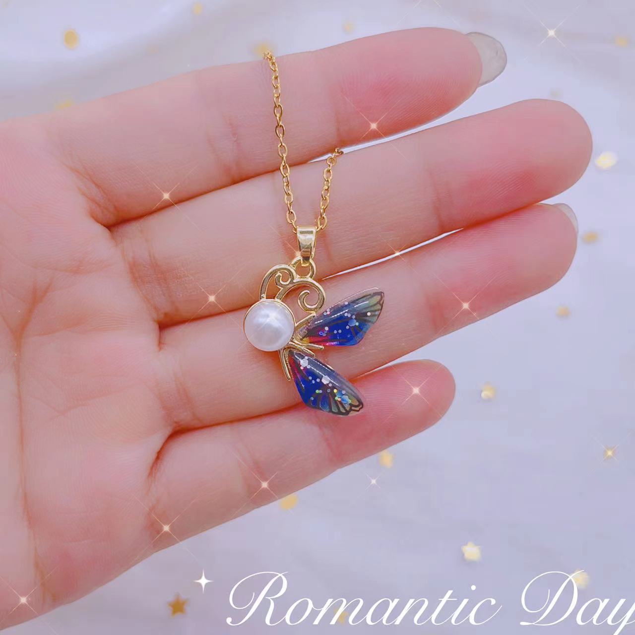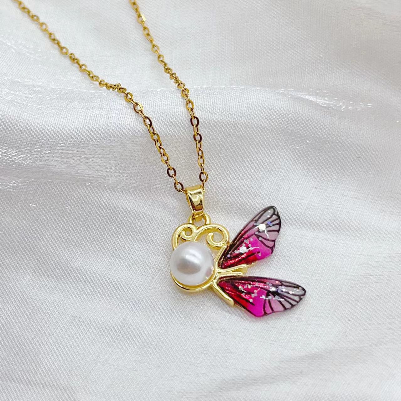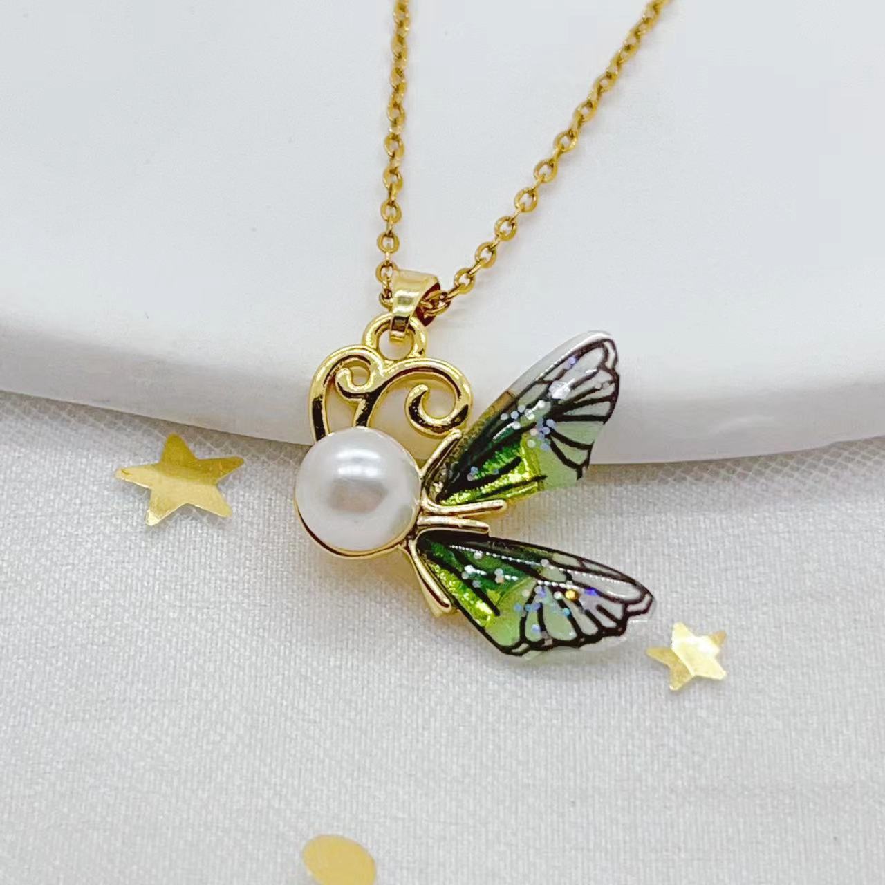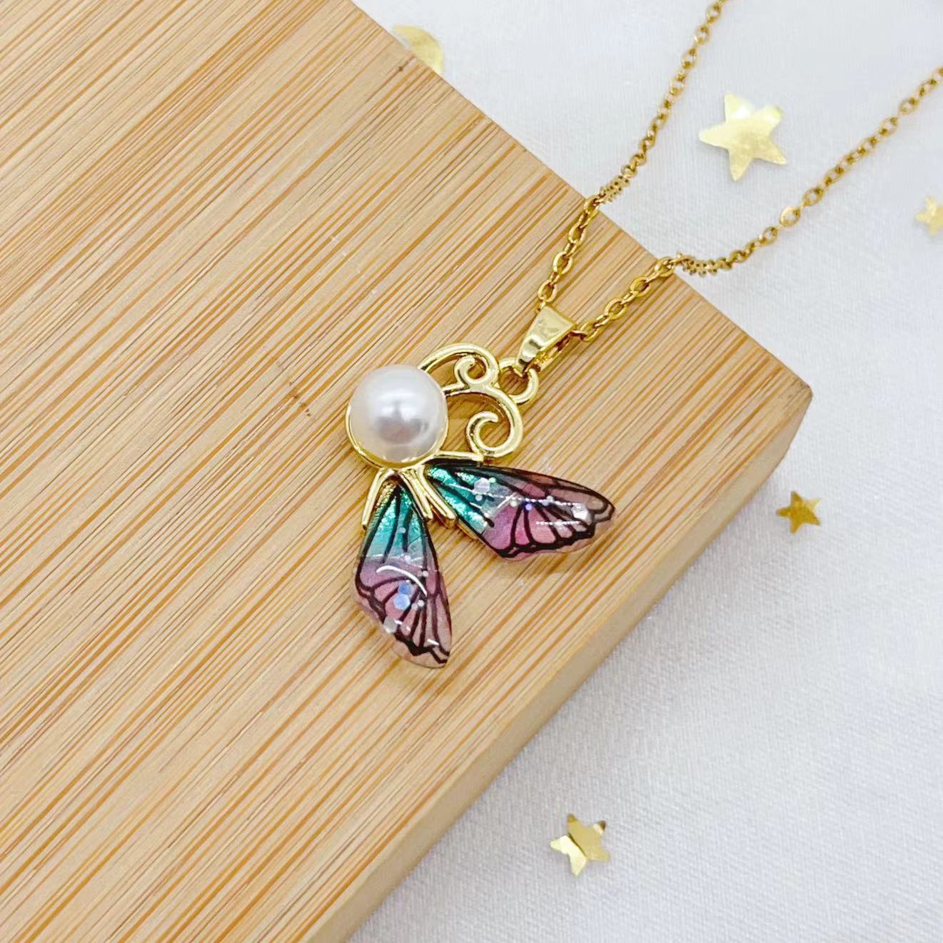 跨境爆款滴胶蝴蝶钛钢项链女时尚幻彩百搭饰品珍珠流行锁骨链女