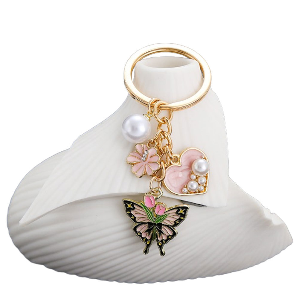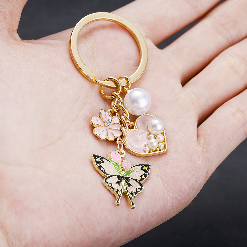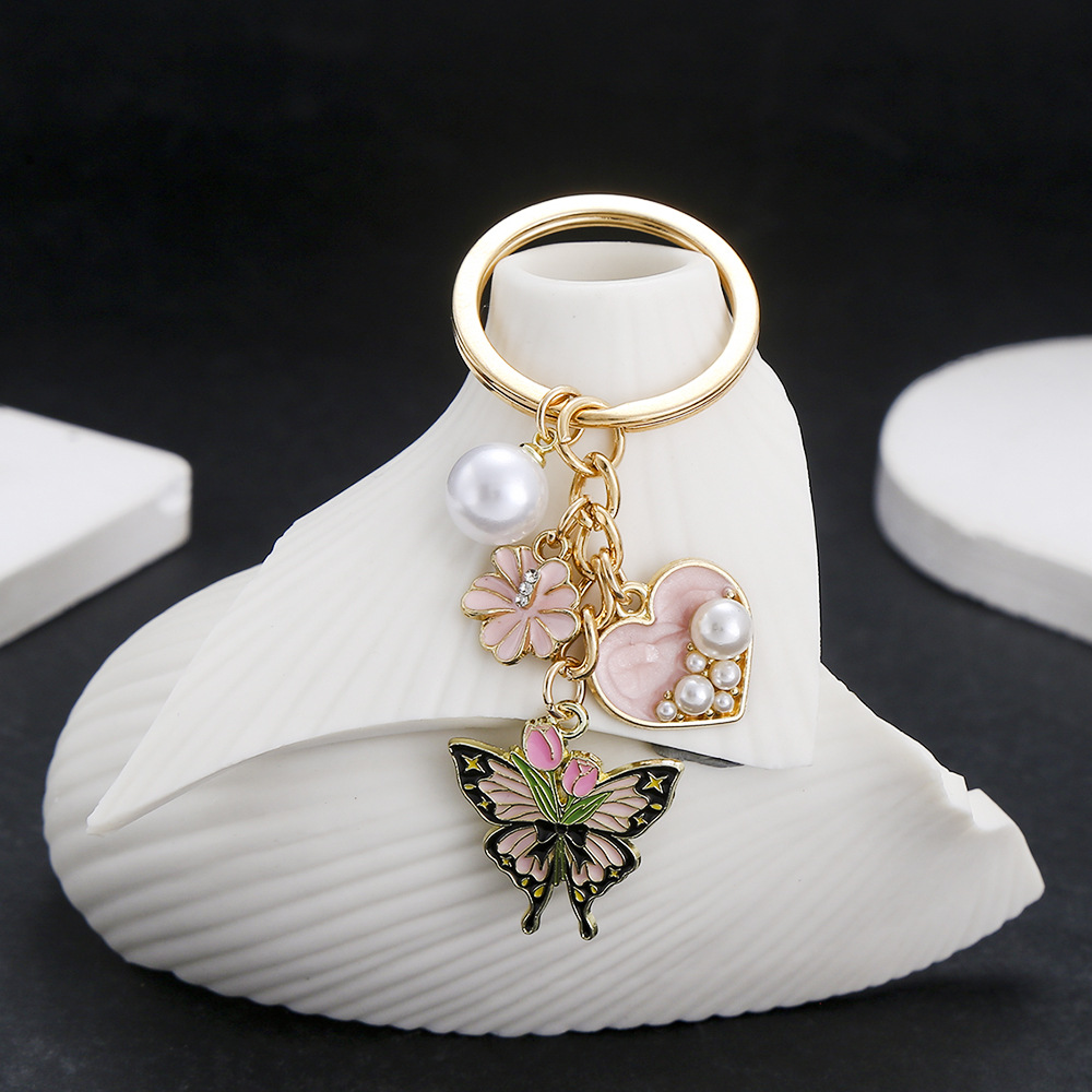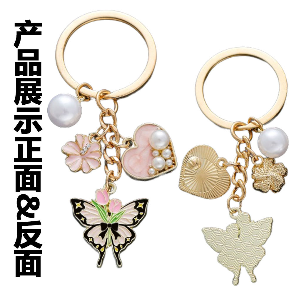 跨境专供唯美粉色滴油蝴蝶郁金香 爱心珍珠 花钥匙扣女孩饰品配件