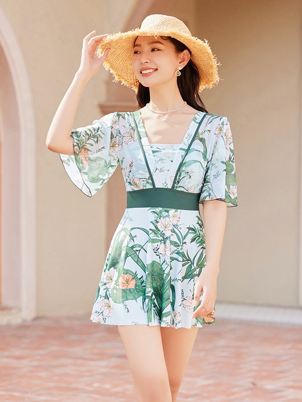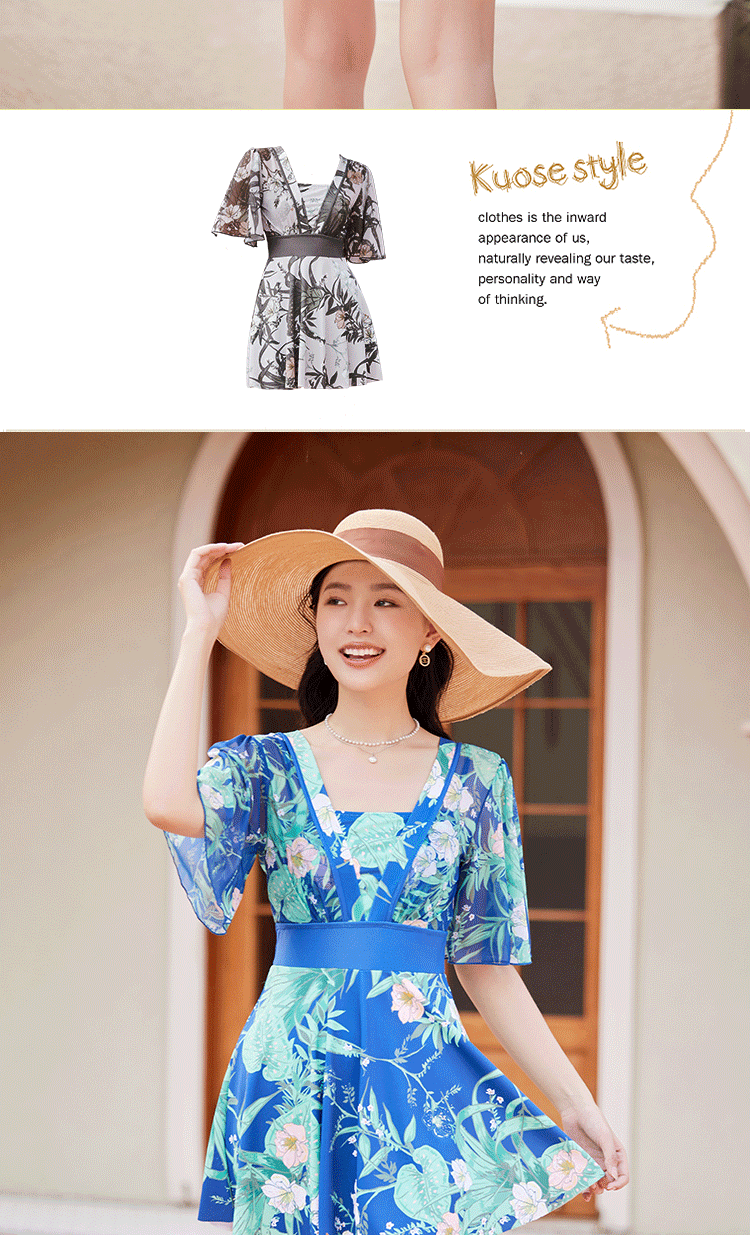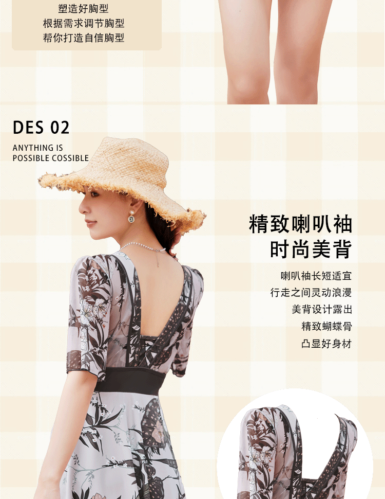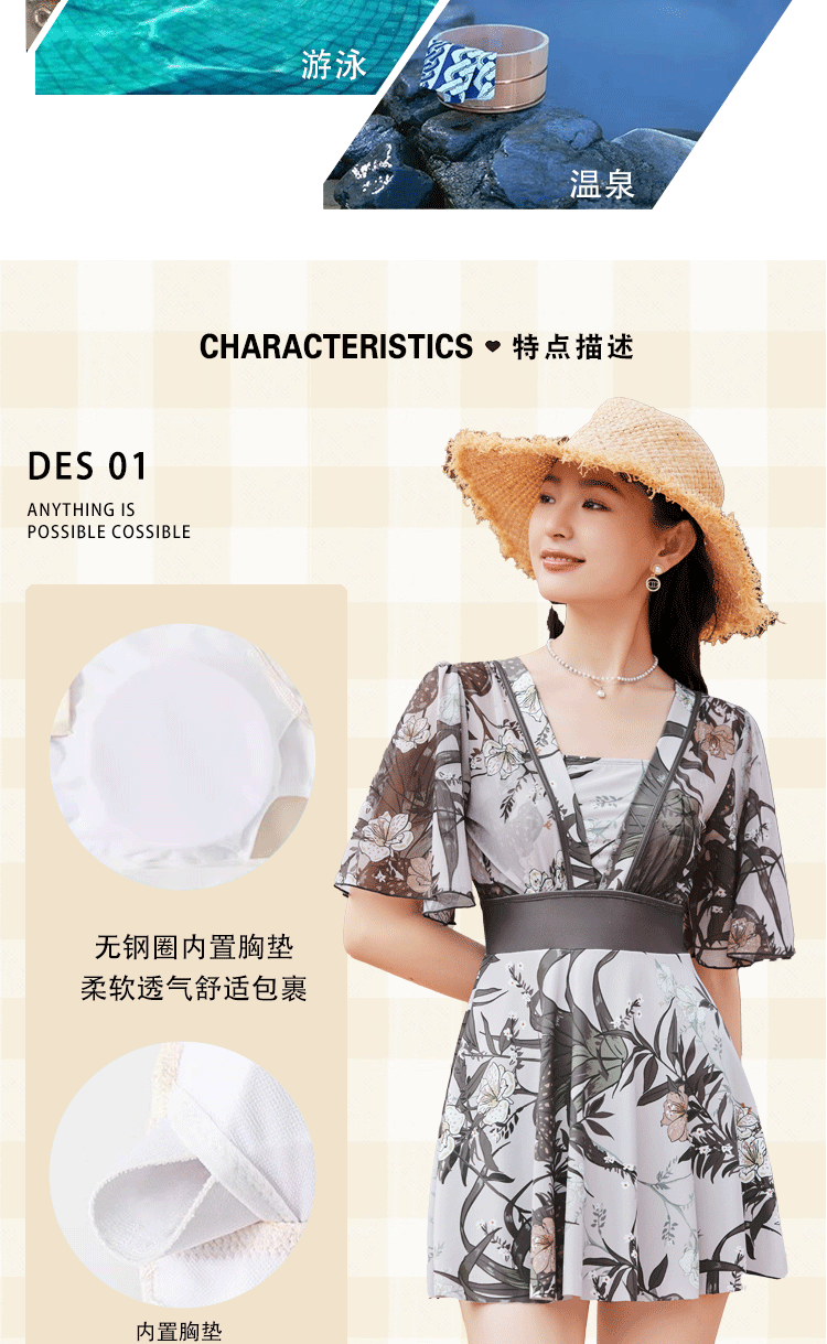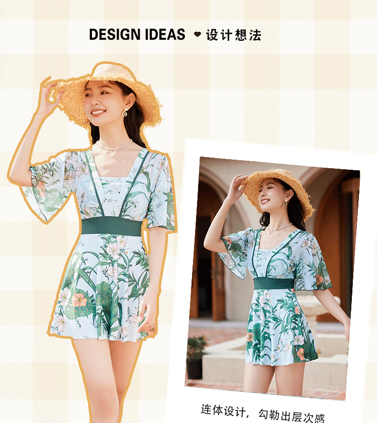 温泉泳衣遮肉显瘦泳衣女 时尚V领防走光高级感泳衣小清新连体泳裙