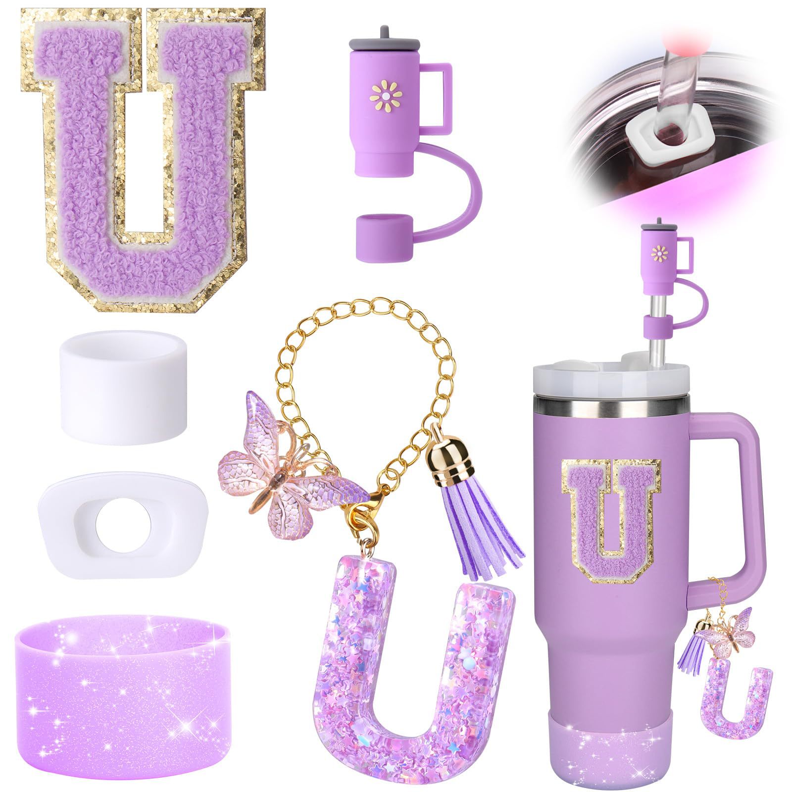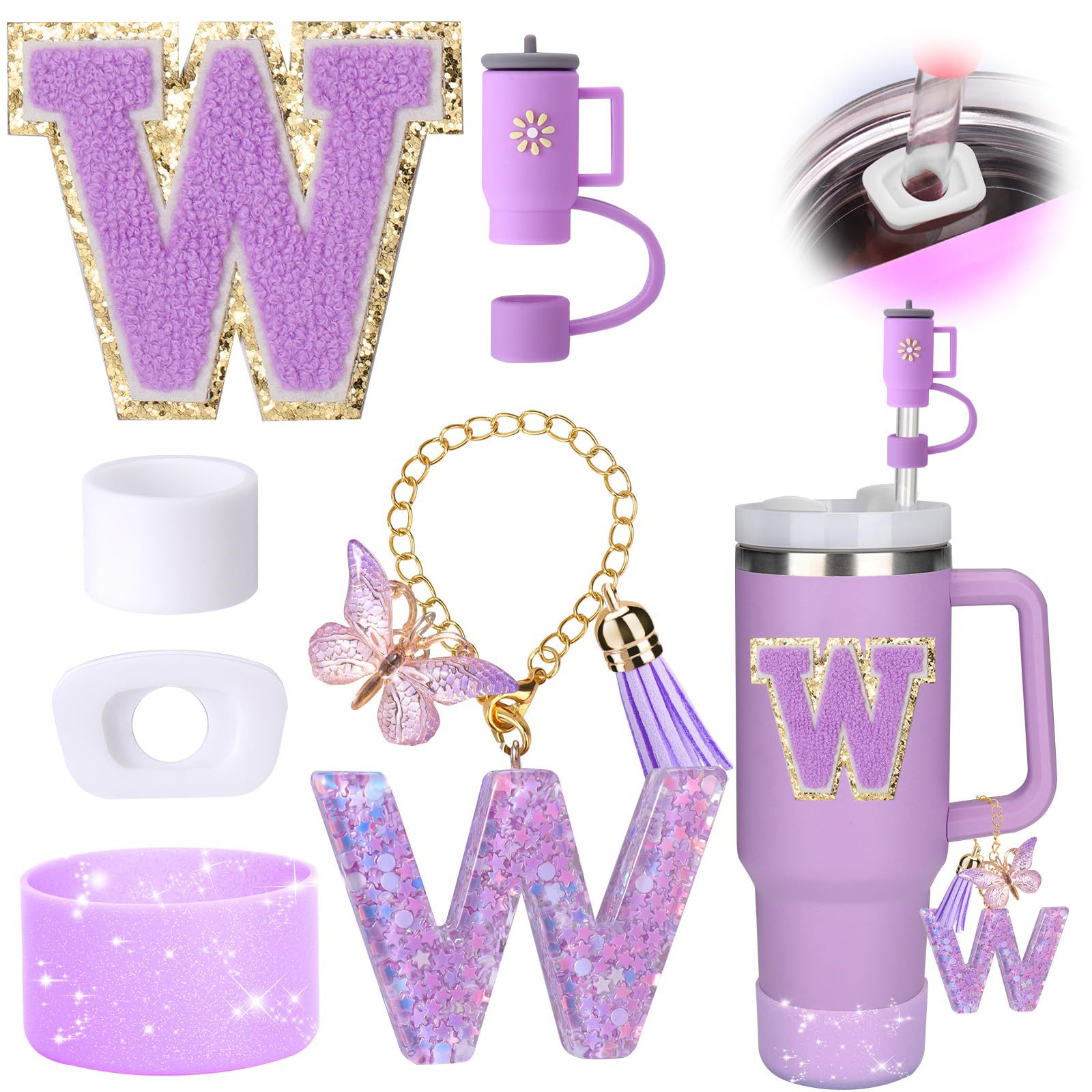 紫色杯托6件套树脂亮片蝴蝶流苏杯链字母毛巾刺绣硅胶闪紫杯套