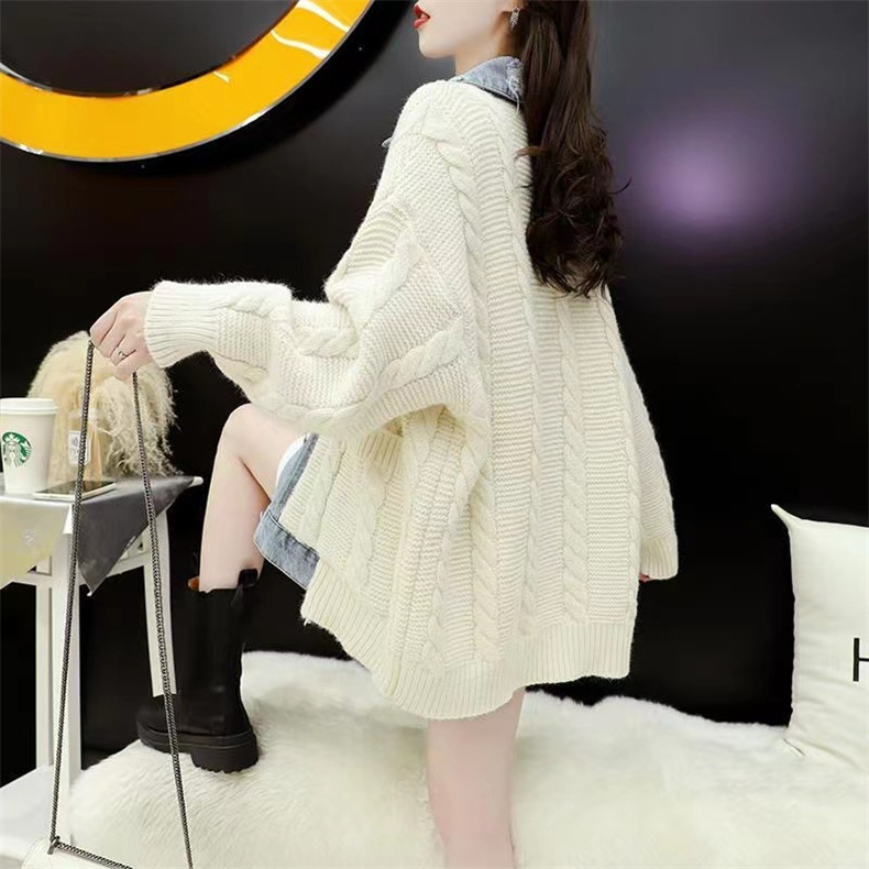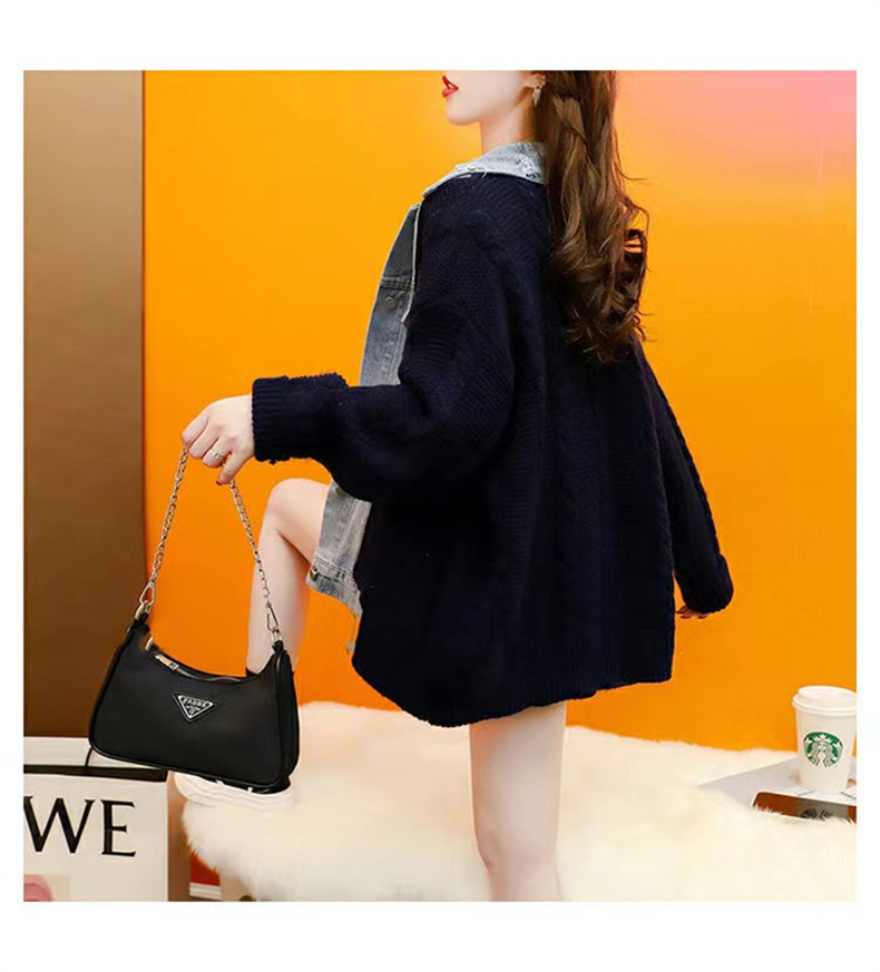 大码设计感牛仔拼接毛衣开衫女2023新款女秋冬宽松慵懒风针织外套