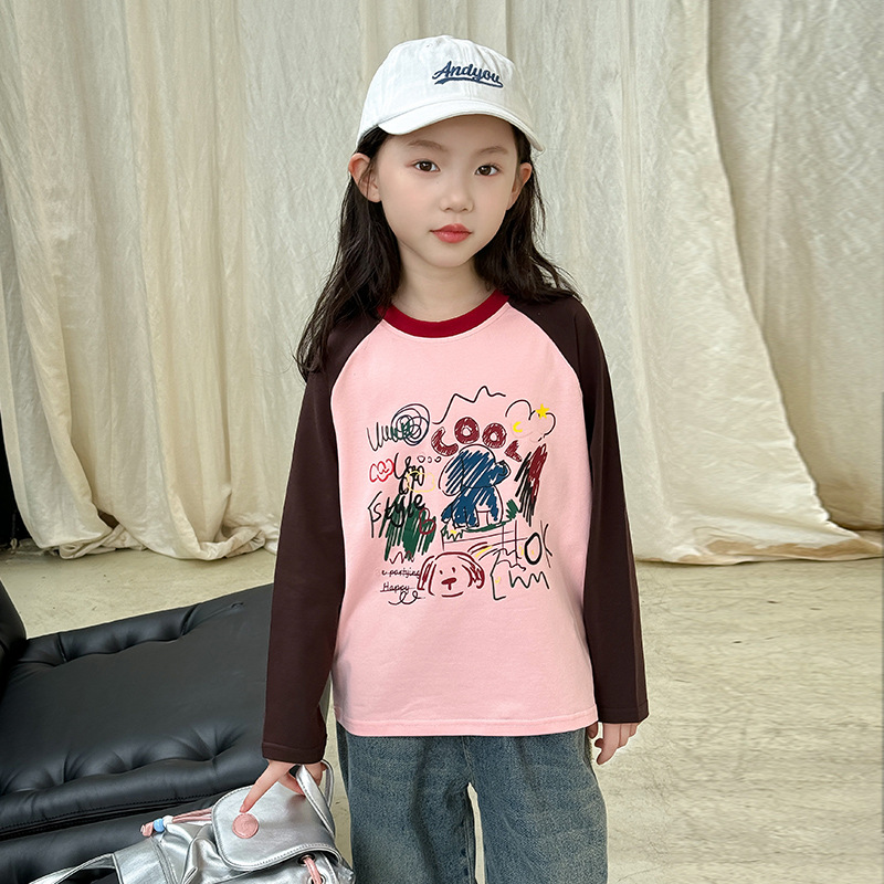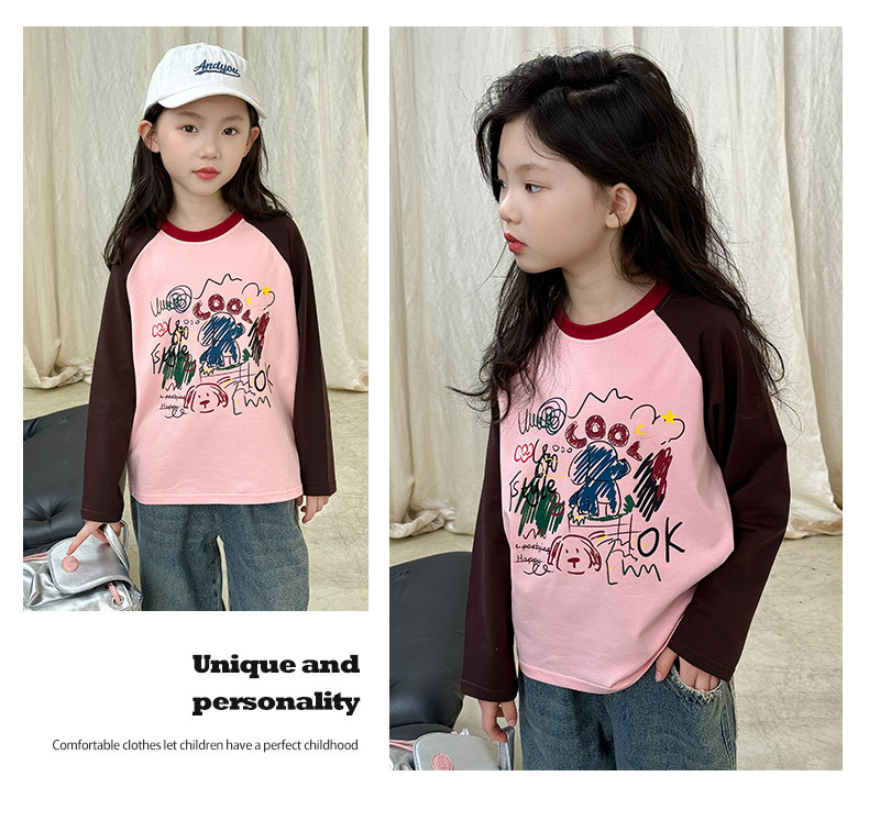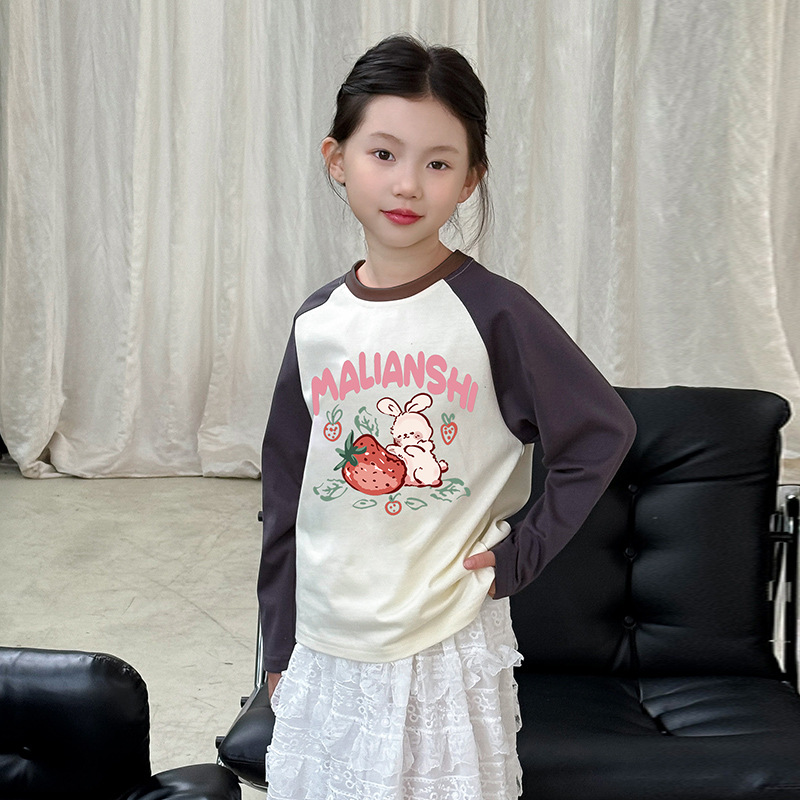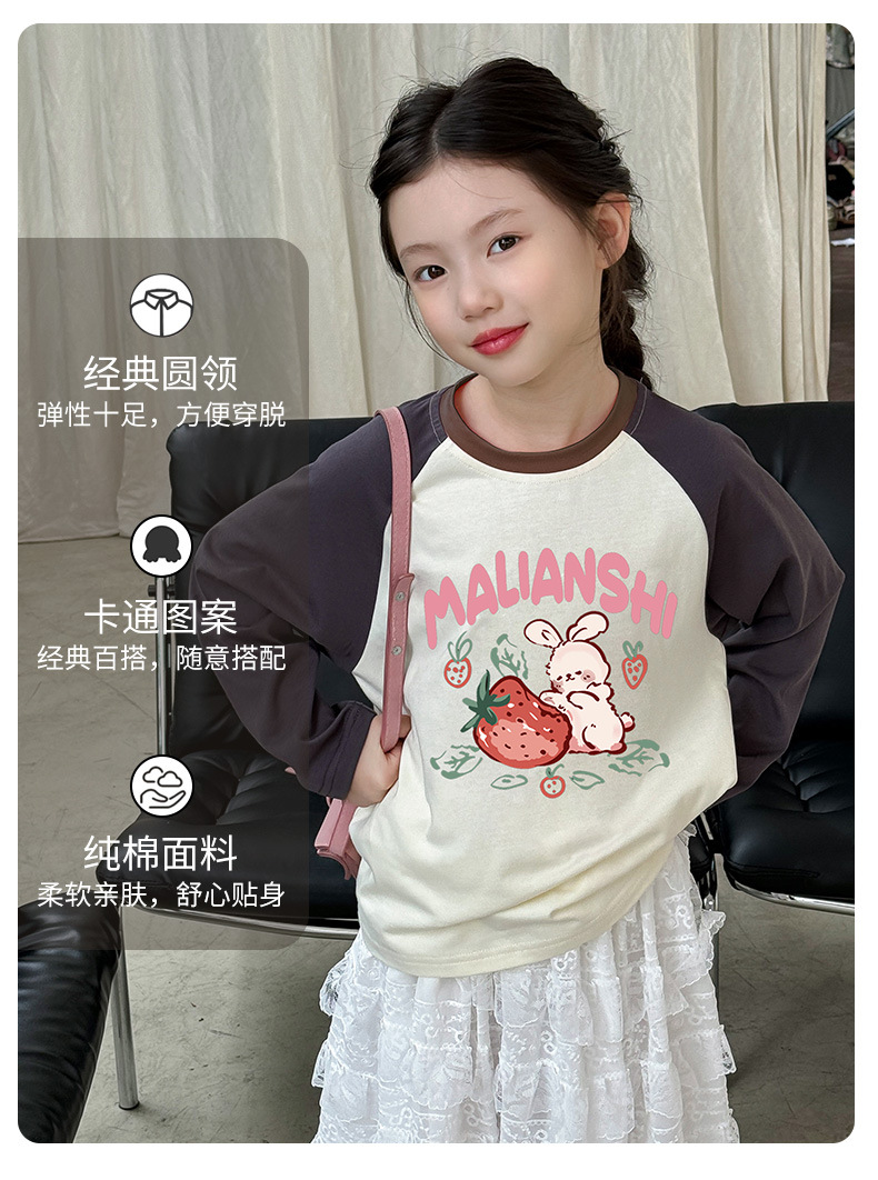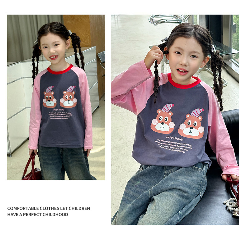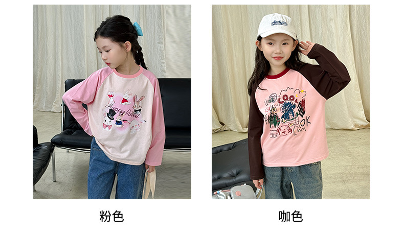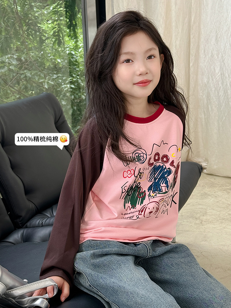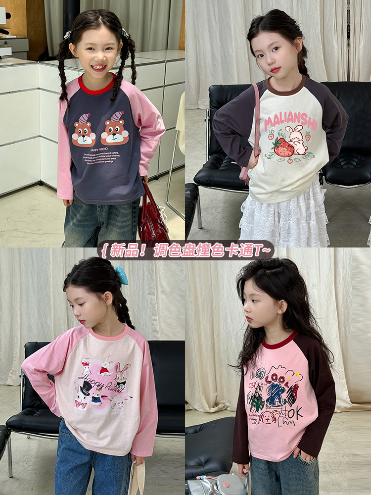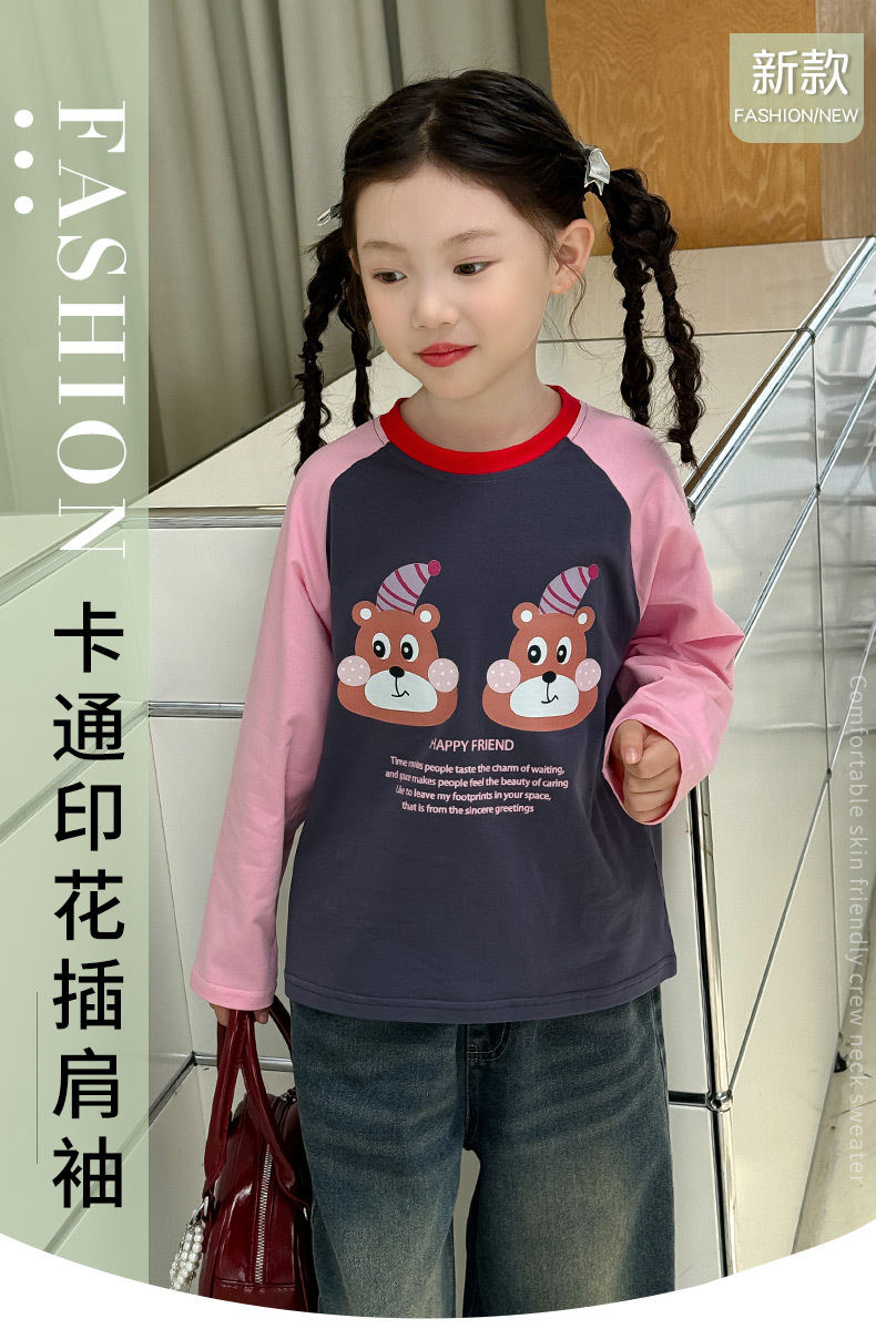 儿童t恤女纯棉长袖卡通印花上衣中小童插肩袖拼色打底衫一件代发