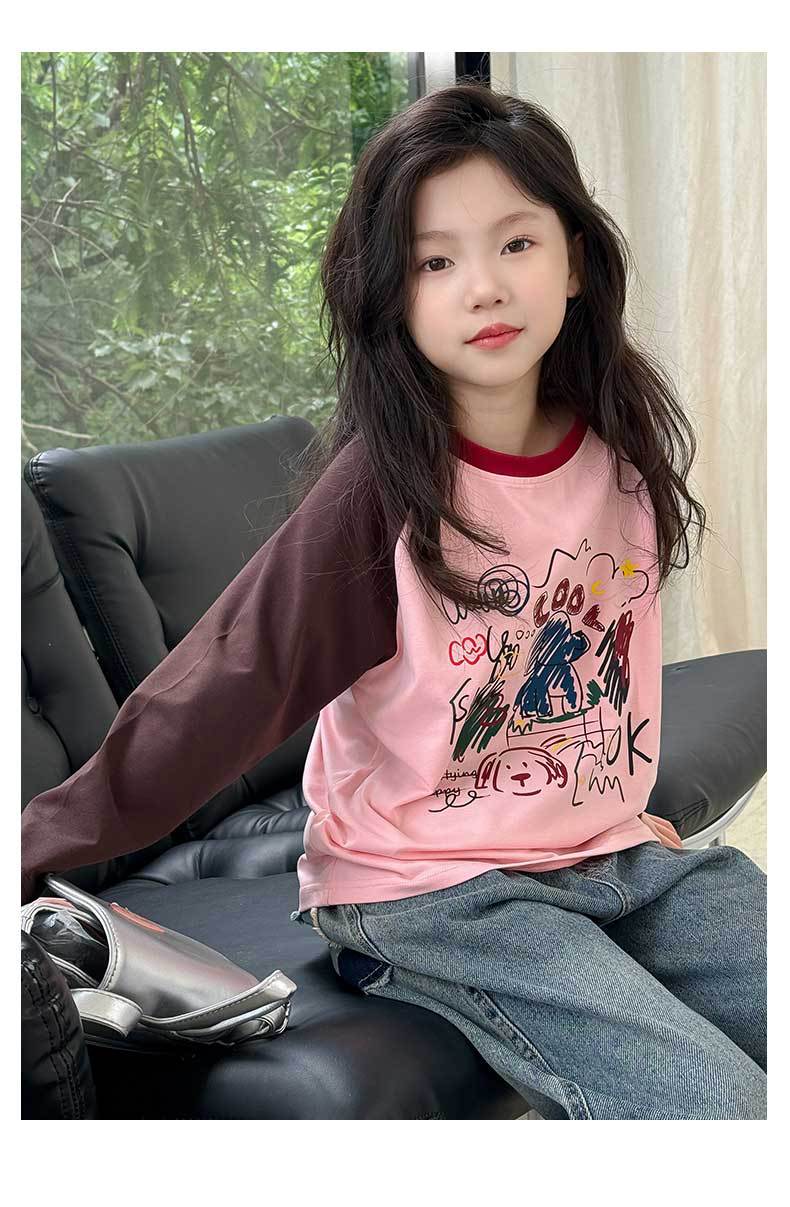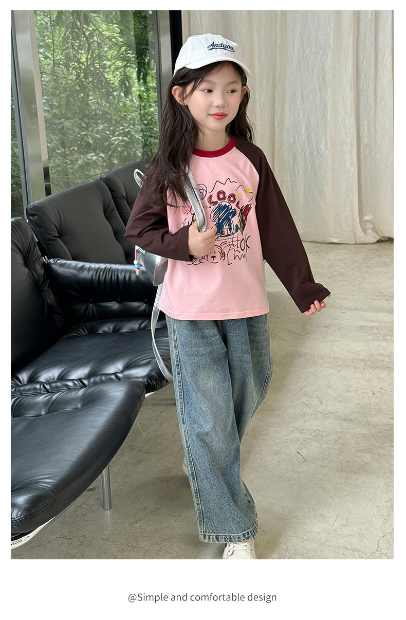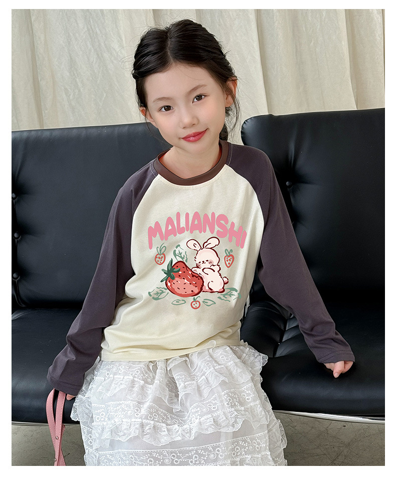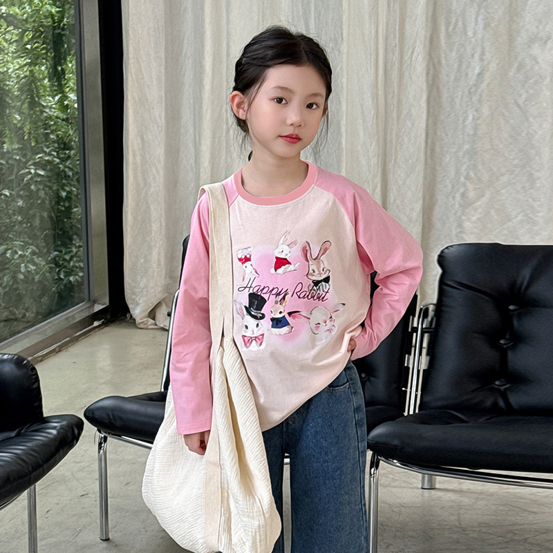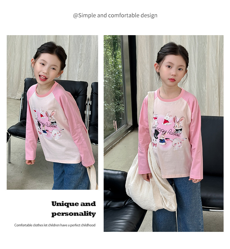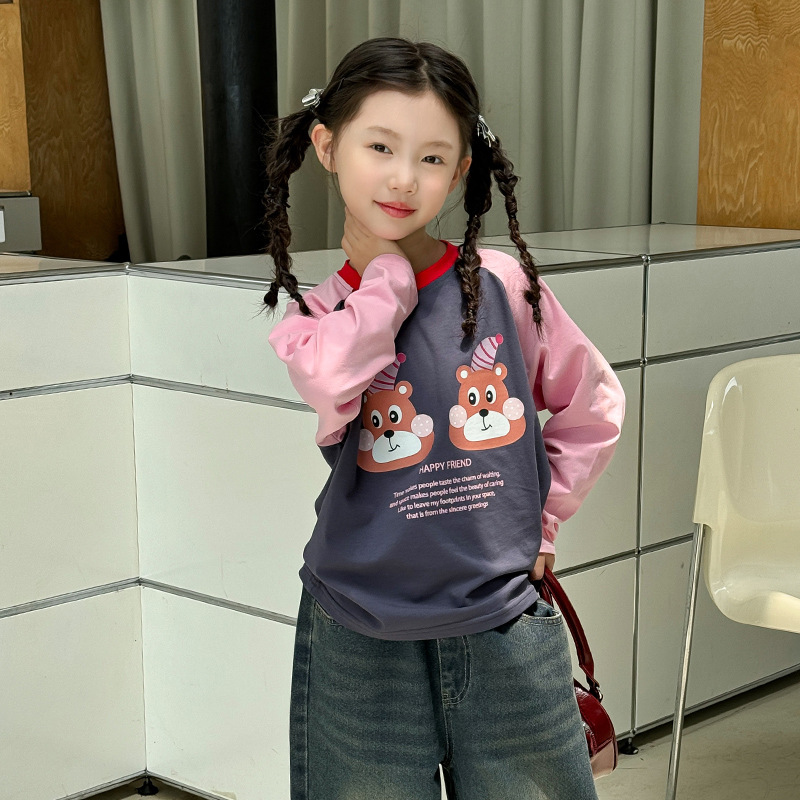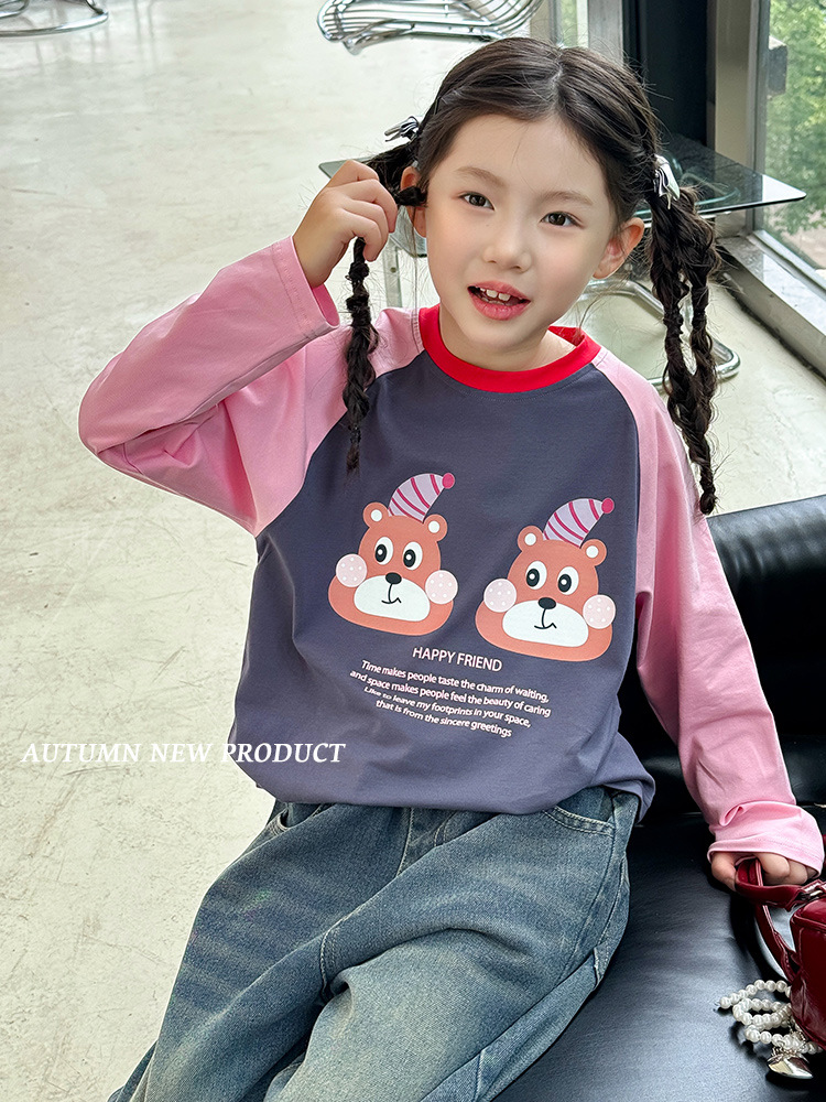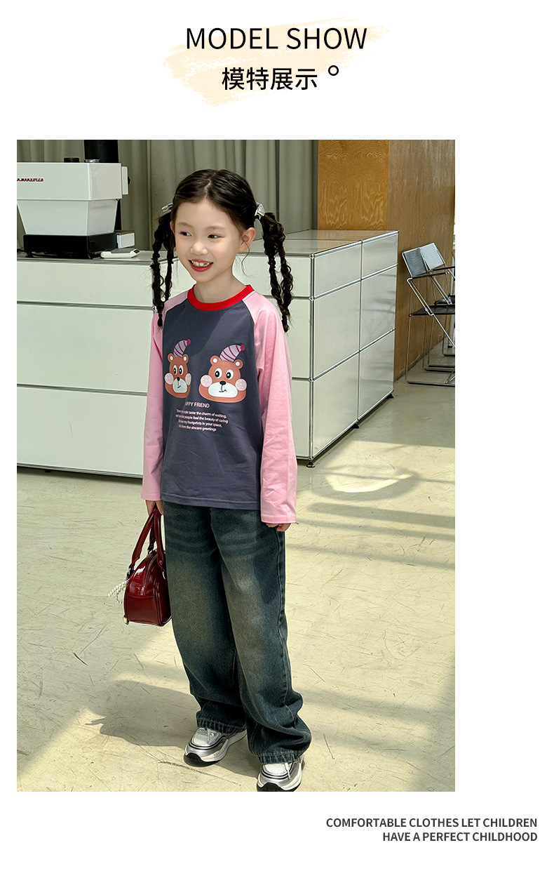 儿童t恤女纯棉长袖卡通印花上衣中小童插肩袖拼色打底衫一件代发