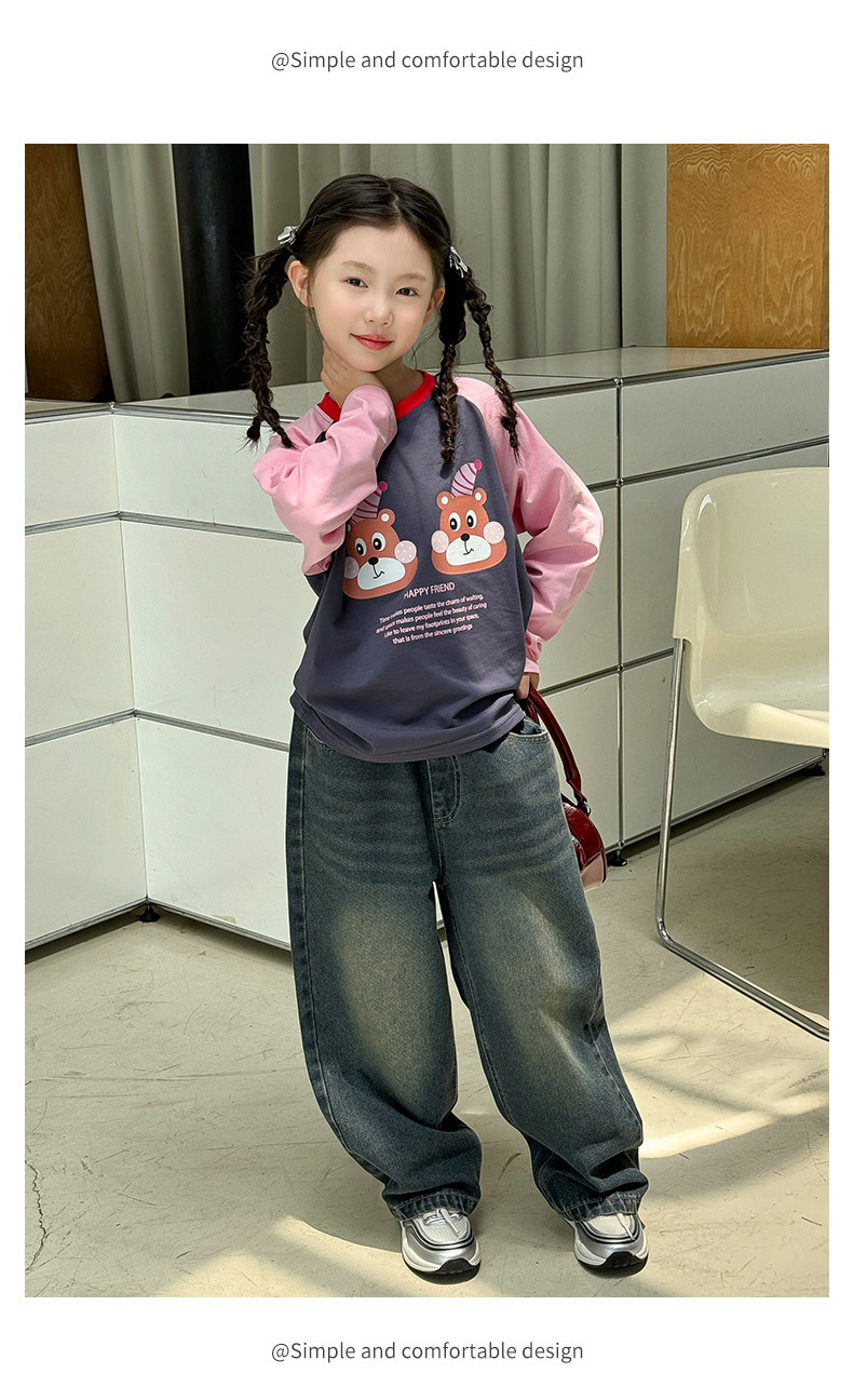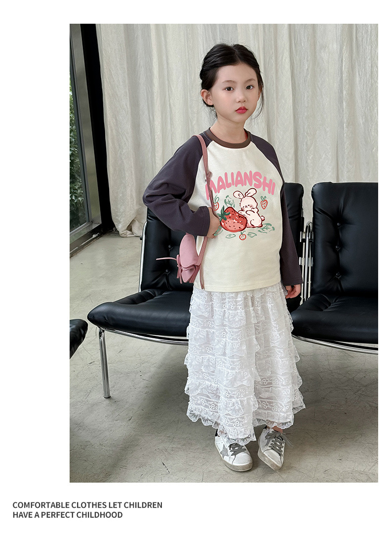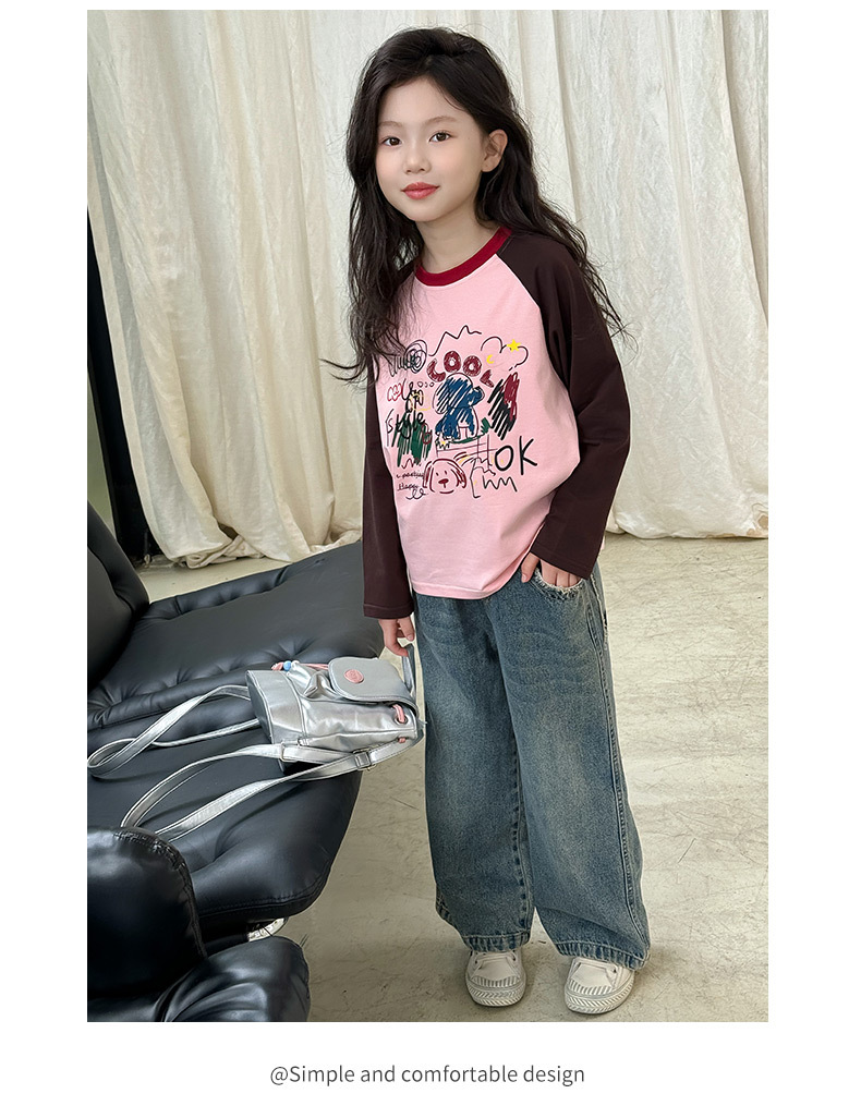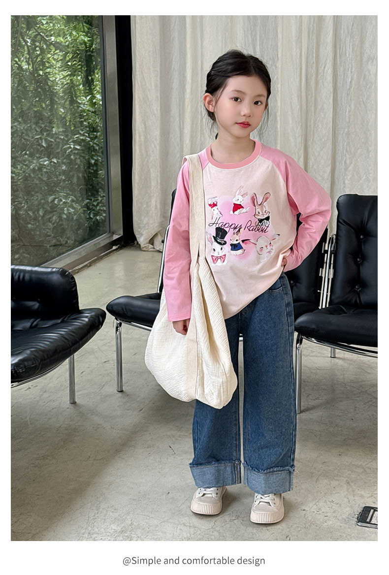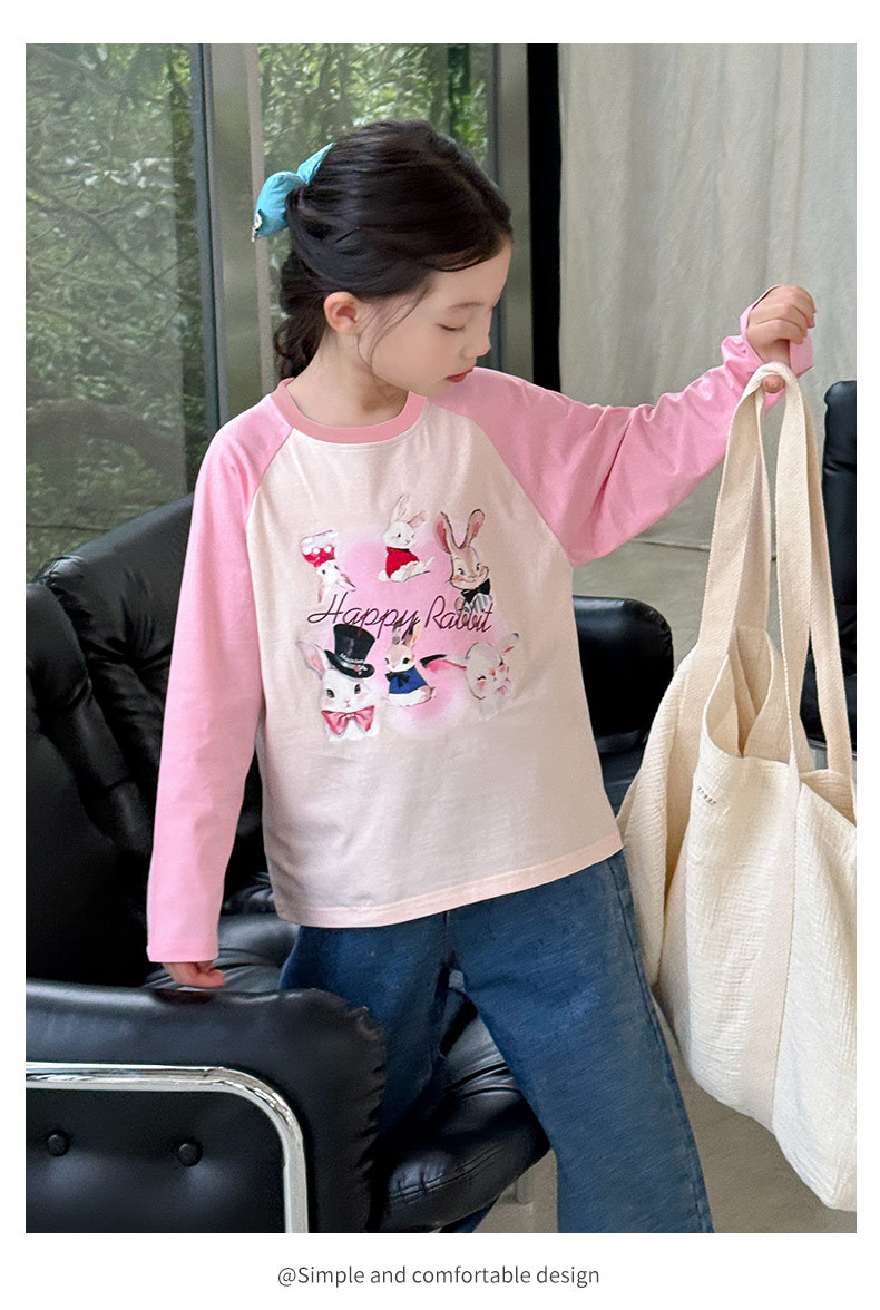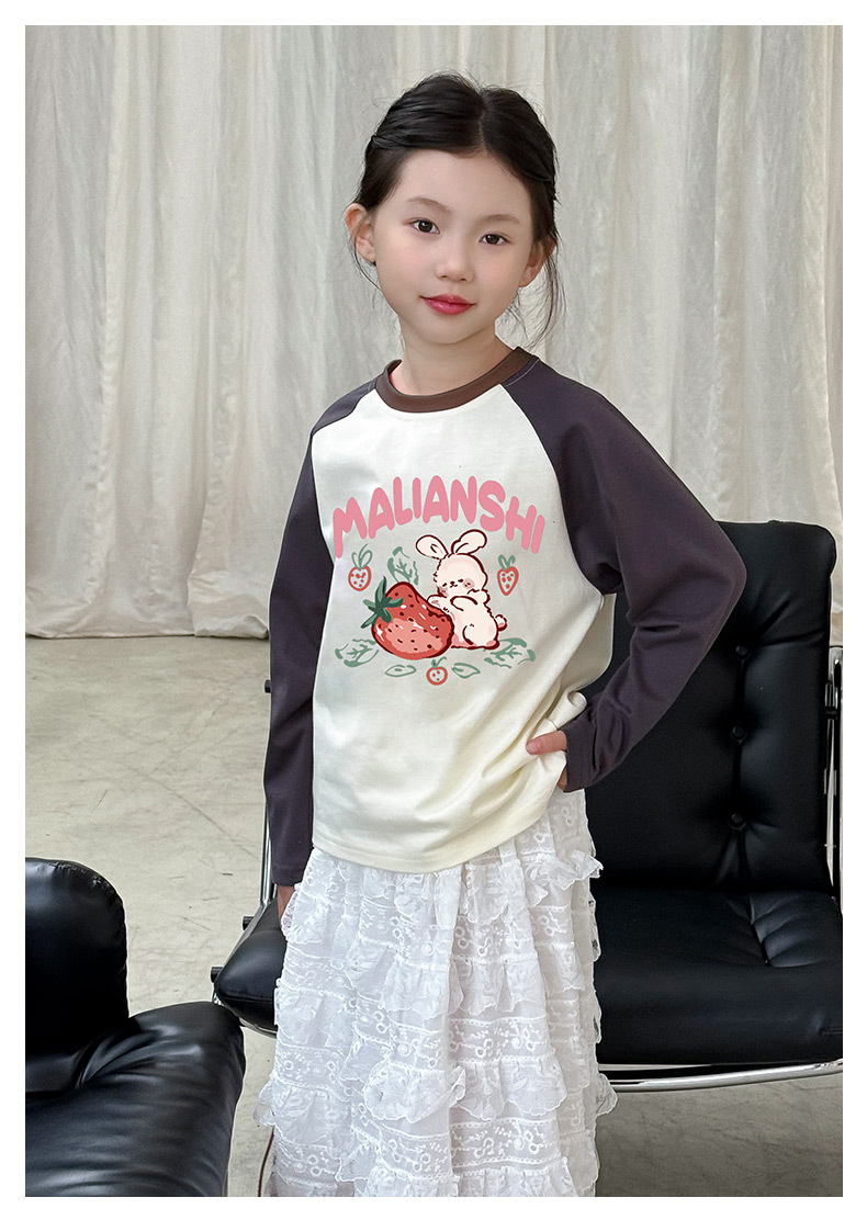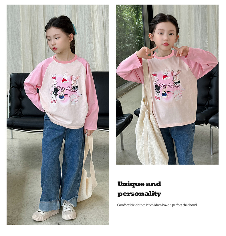 儿童t恤女纯棉长袖卡通印花上衣中小童插肩袖拼色打底衫一件代发