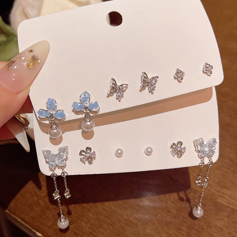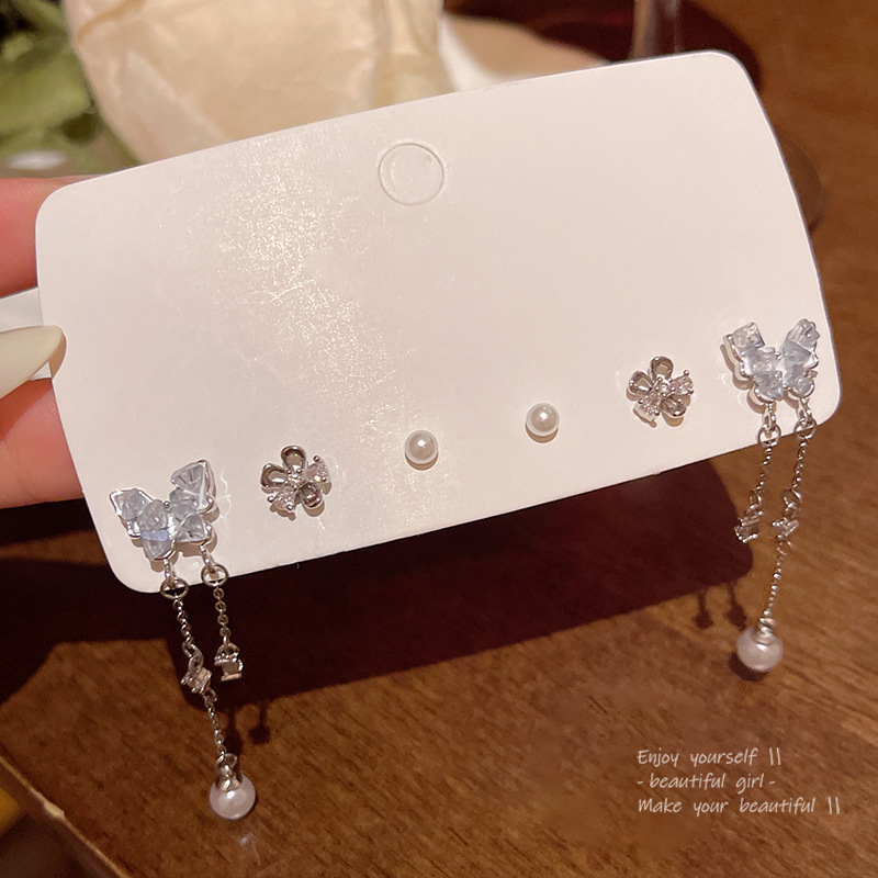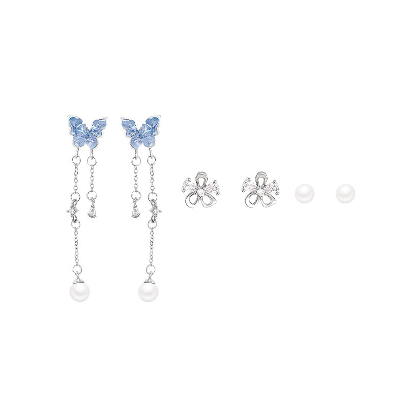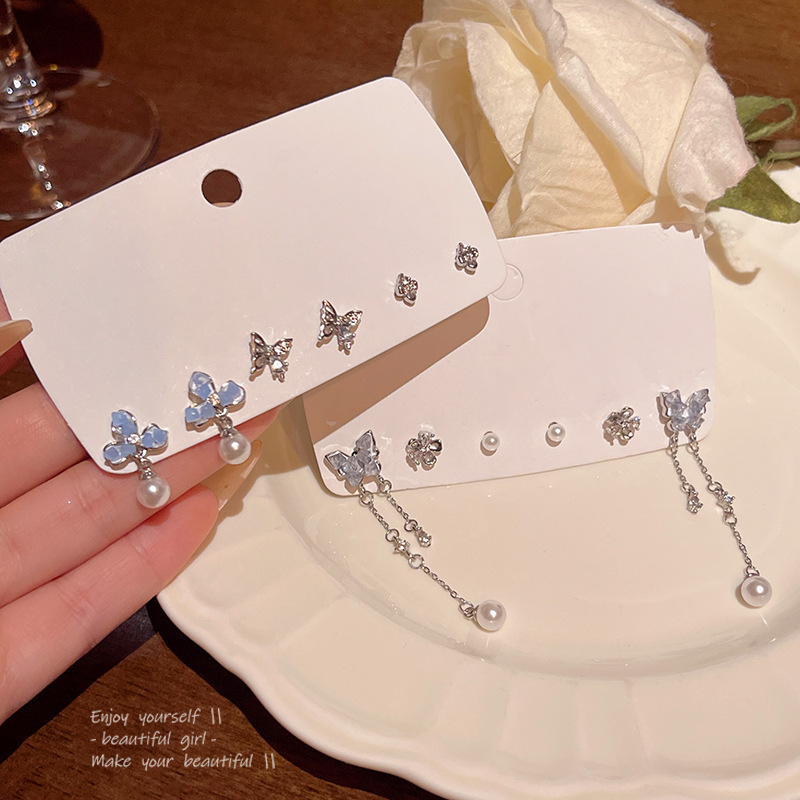 饰品轻奢小众养耳洞套装珍珠耳钉女爆款蓝色碎钻长款流苏蝴蝶耳环