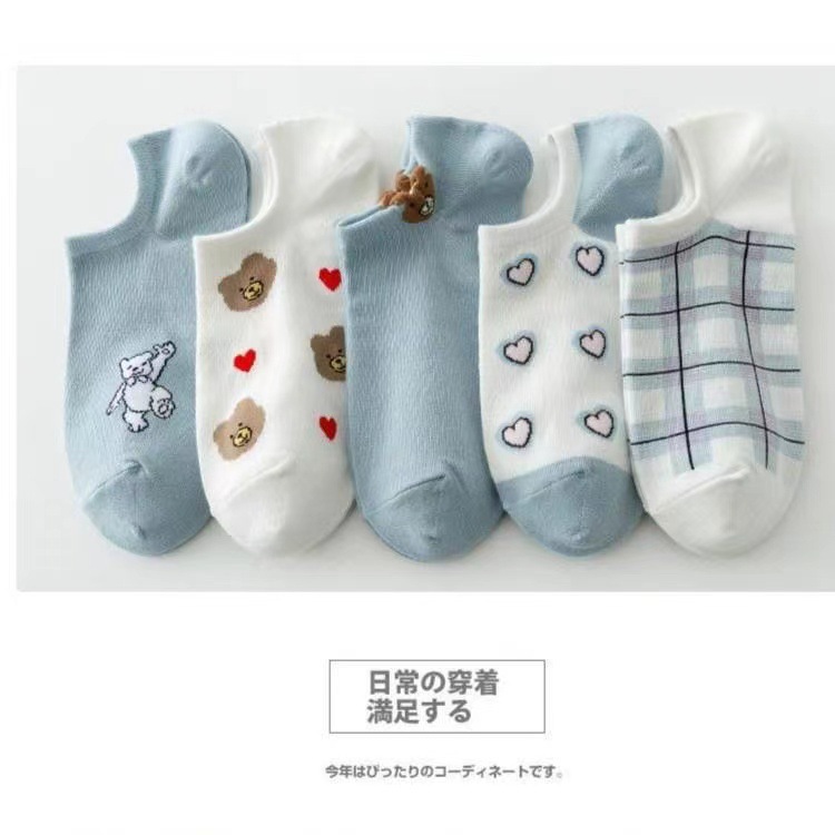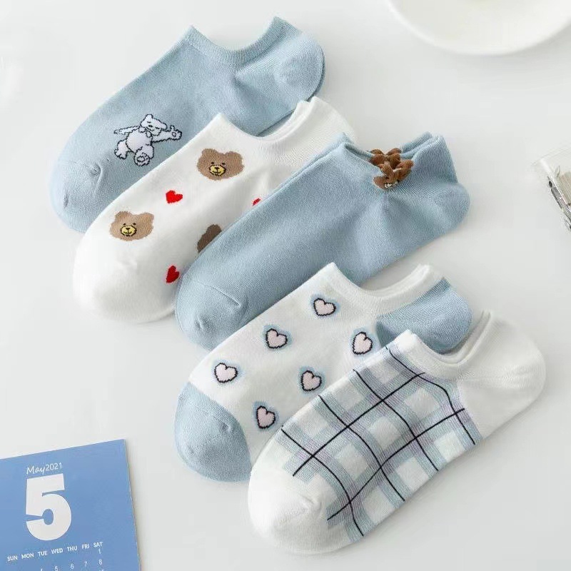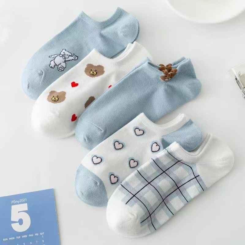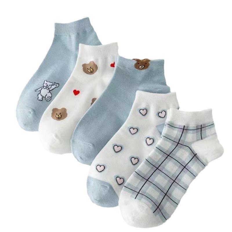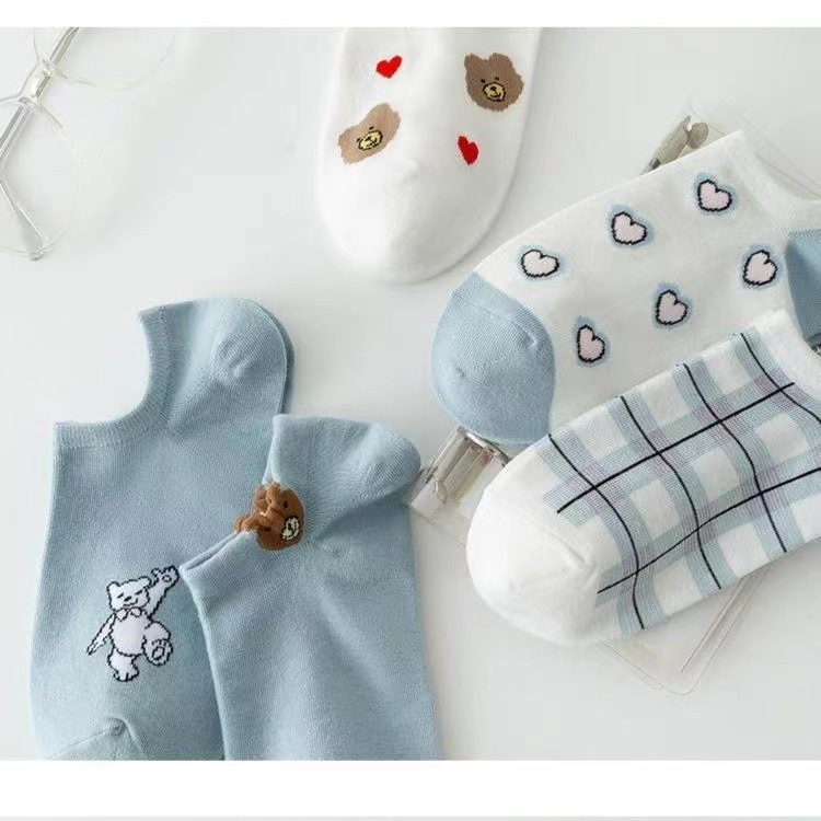 新款春秋小熊蓝色系卡通可爱男女短袜棉袜透气船袜子格子浅口袜