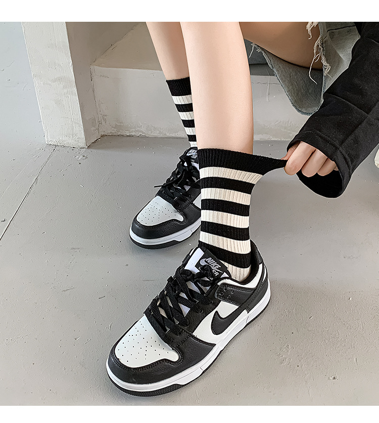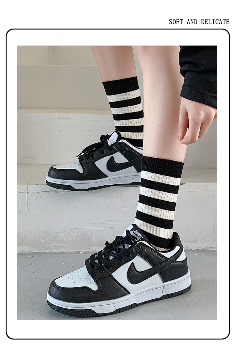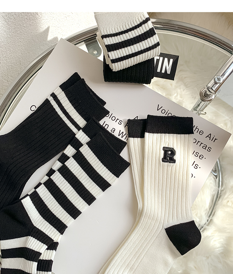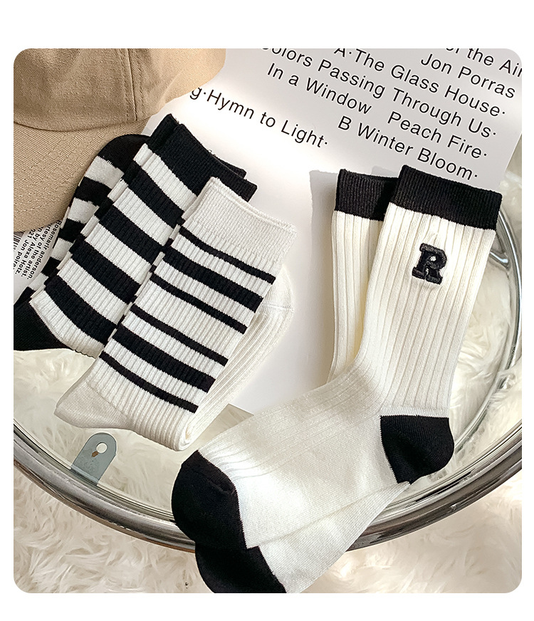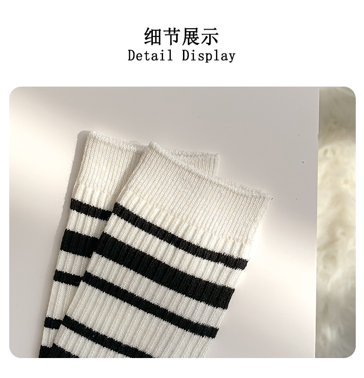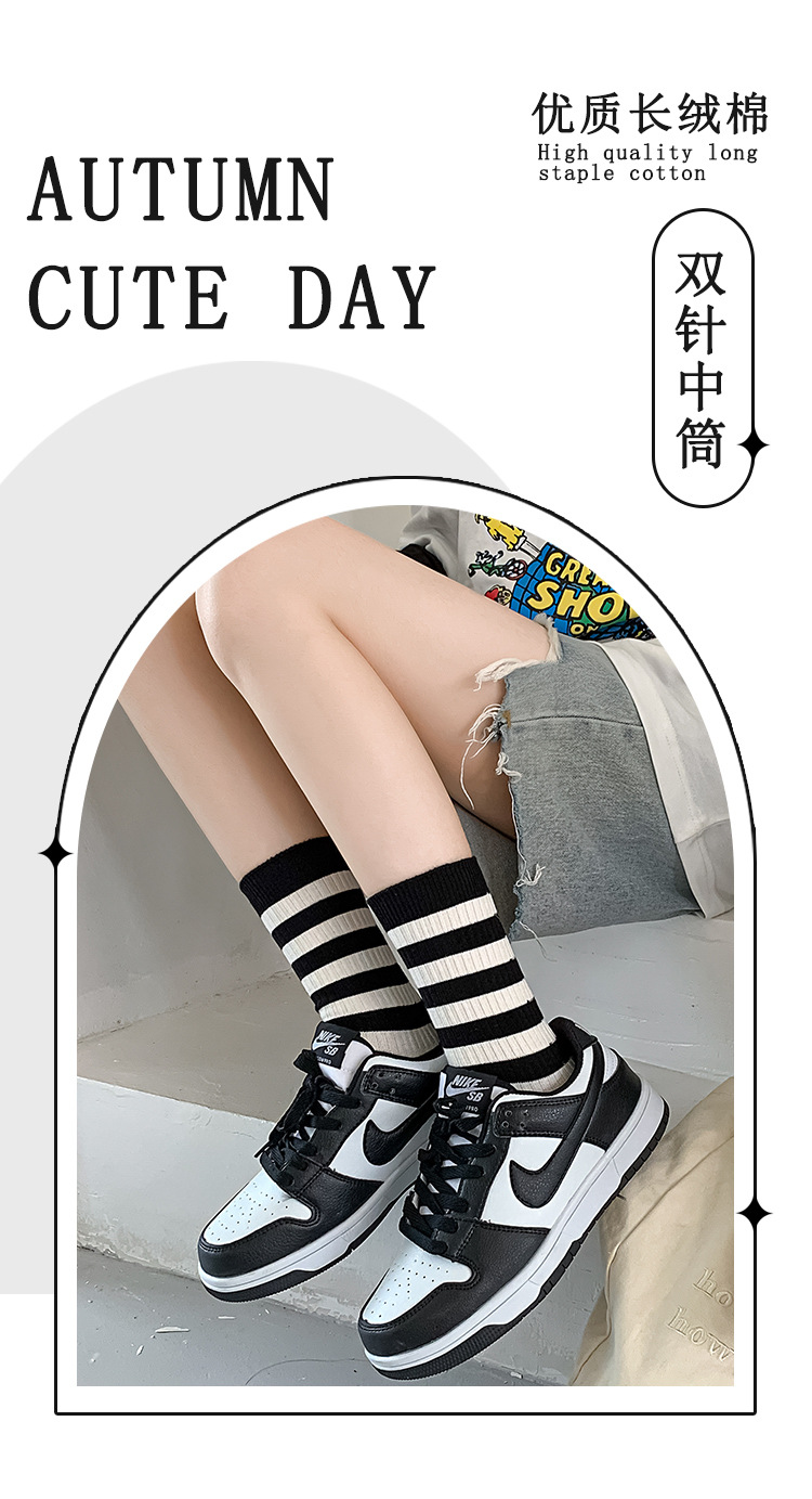 春秋中筒袜子女 黑白条纹双针长筒女士透气棉袜 诸暨刺绣女袜批发