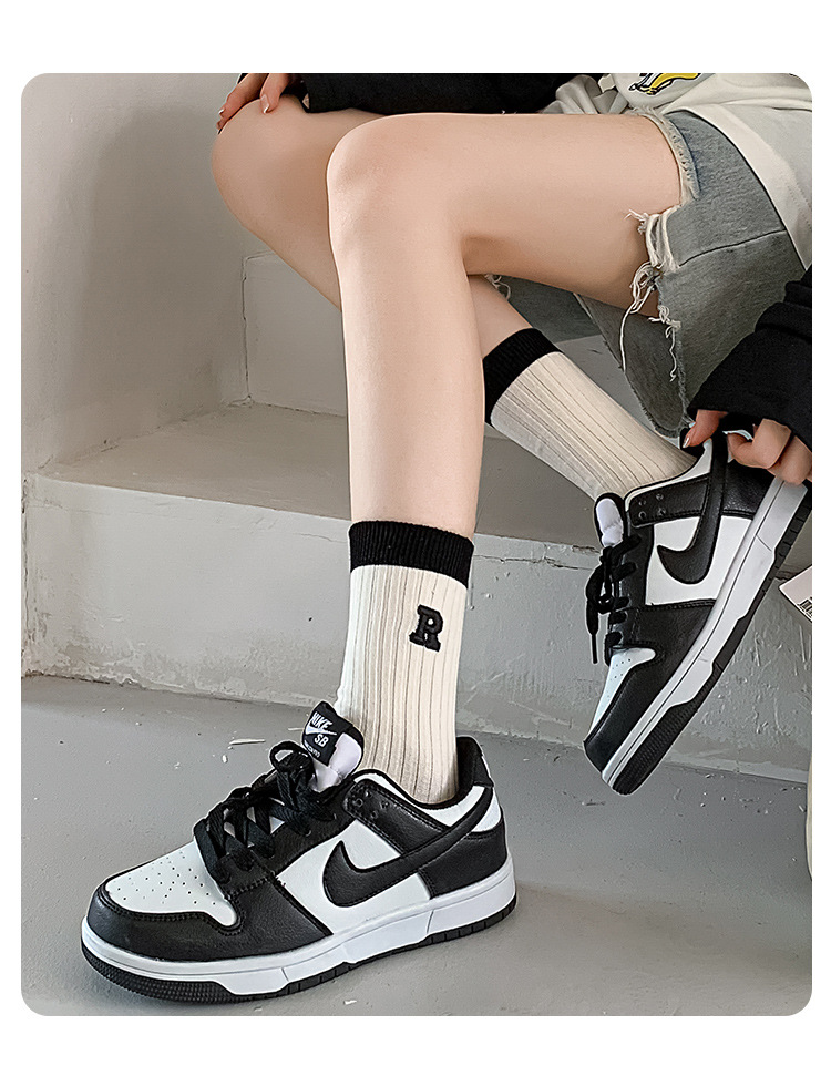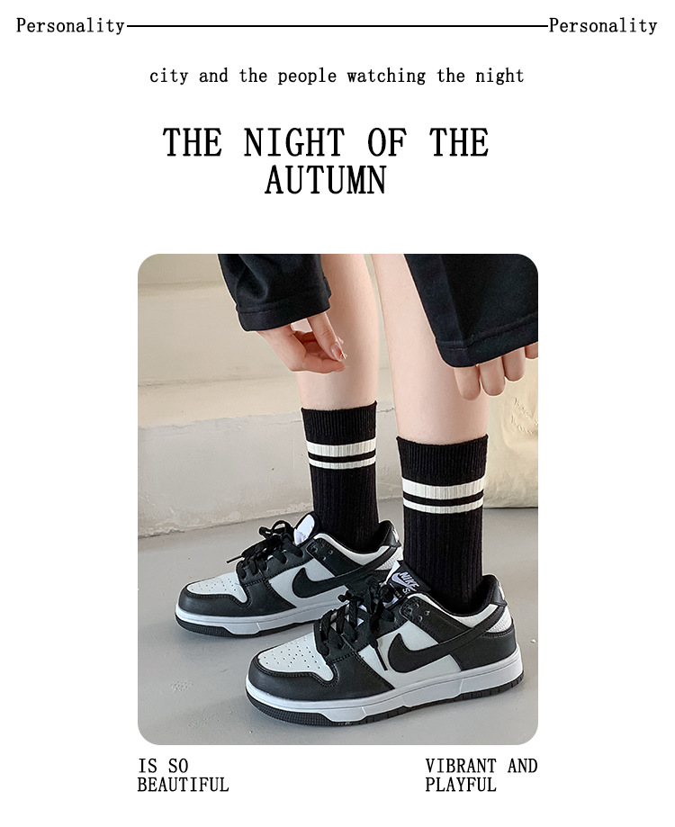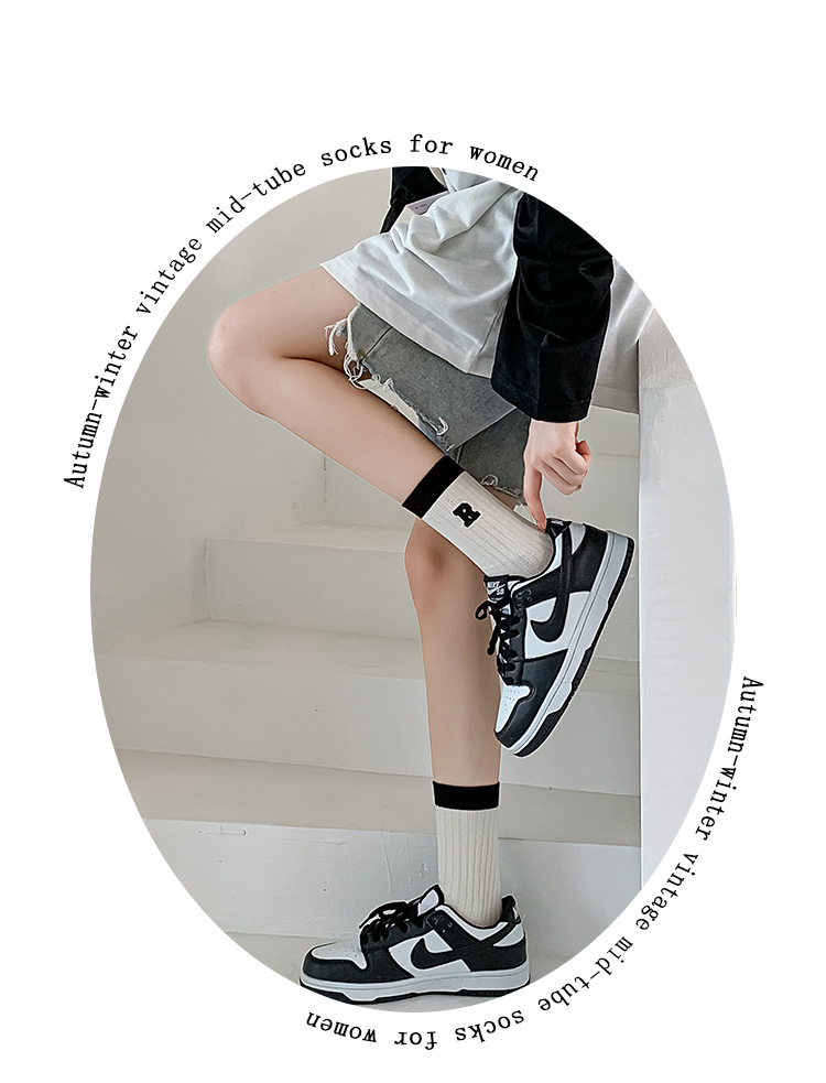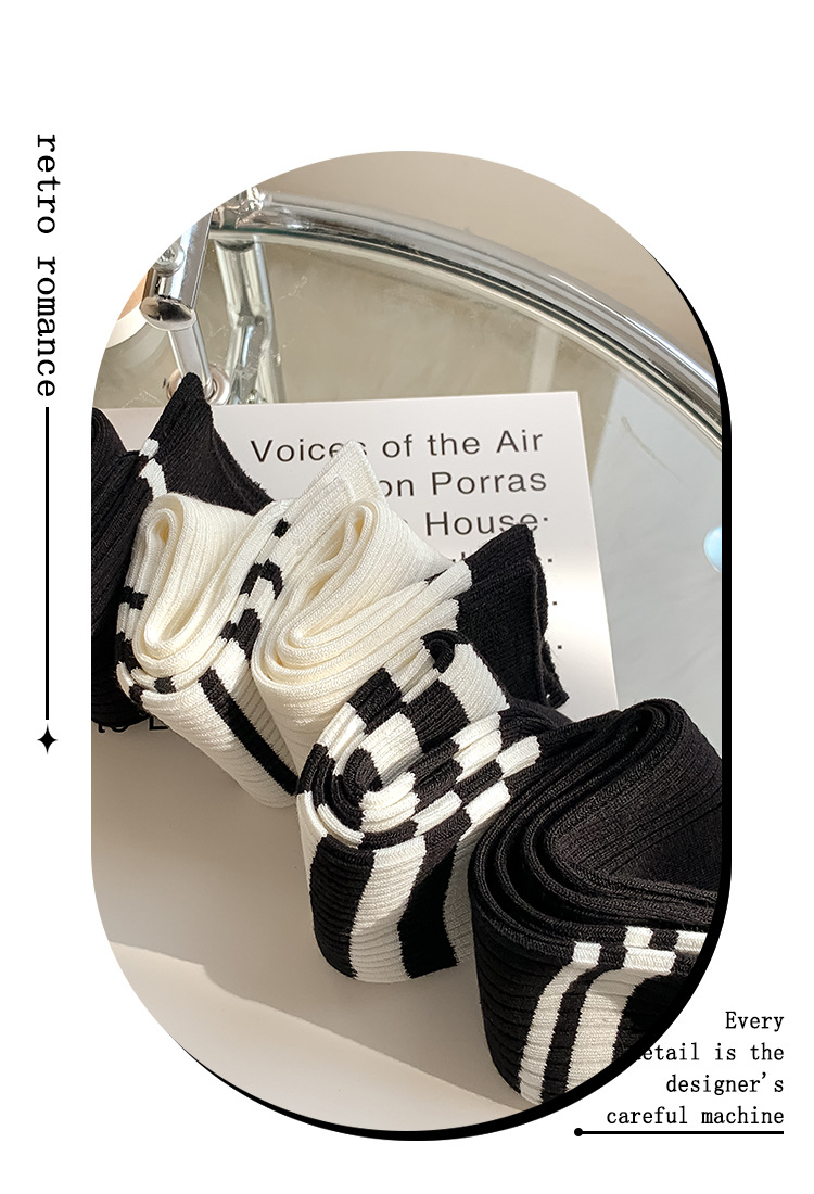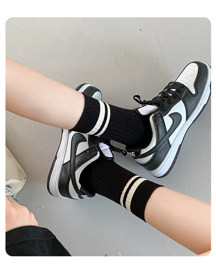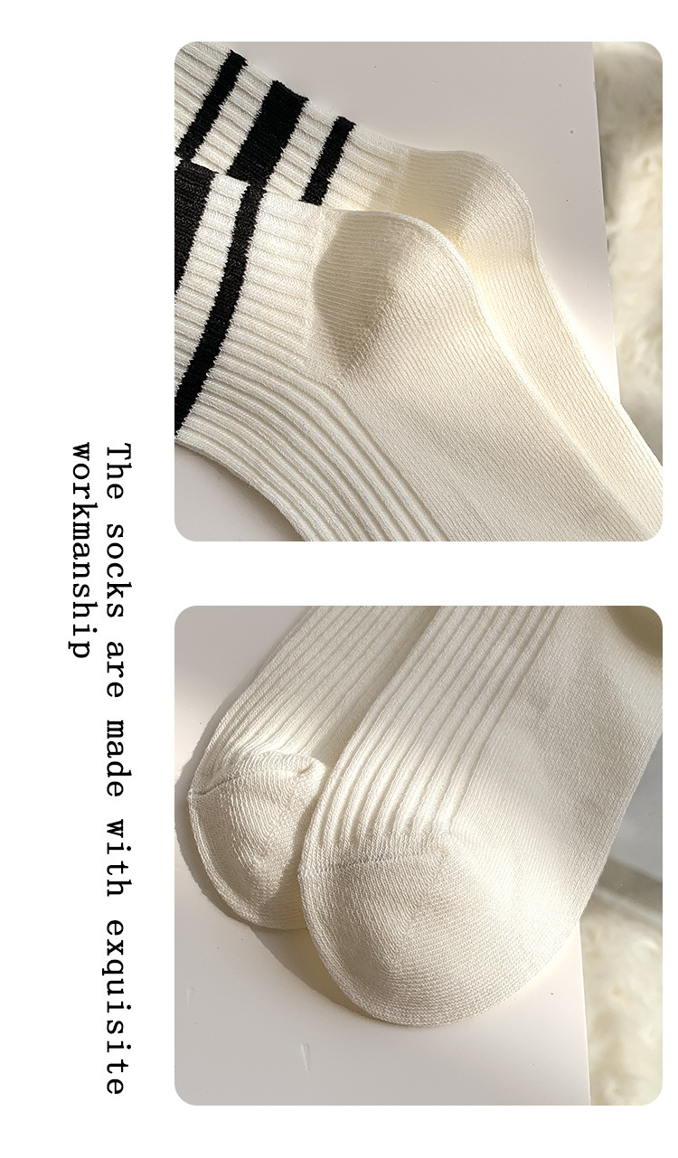 春秋中筒袜子女 黑白条纹双针长筒女士透气棉袜 诸暨刺绣女袜批发