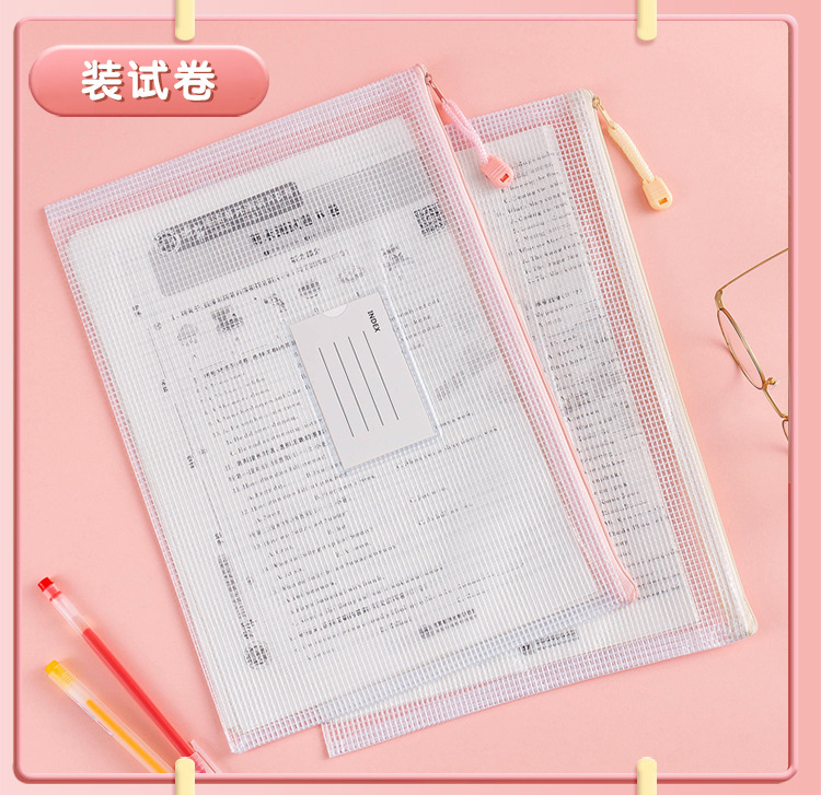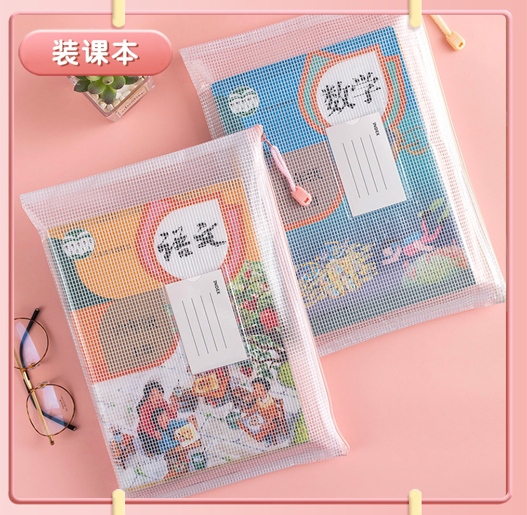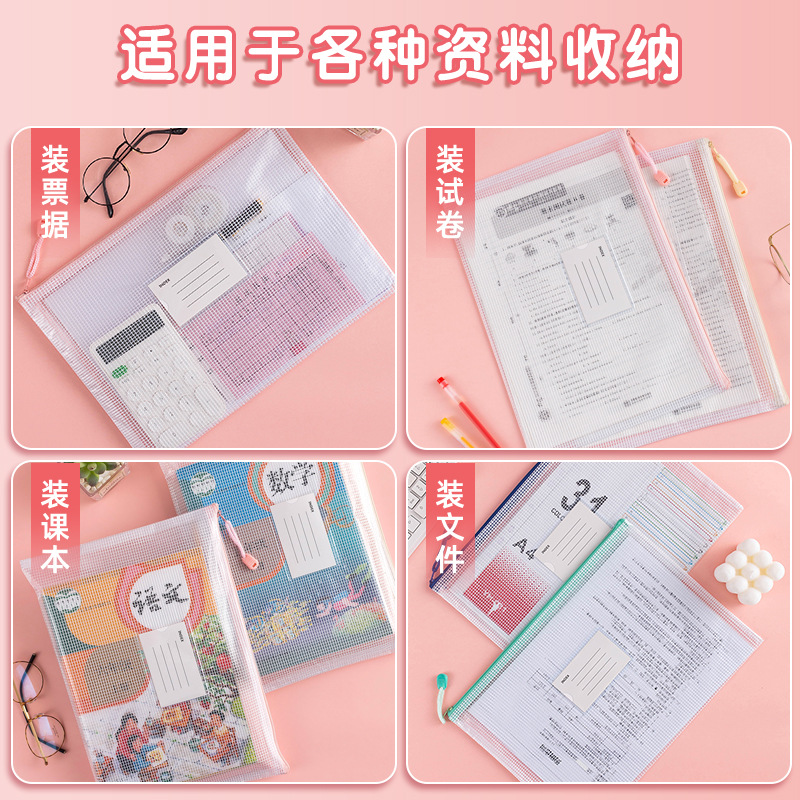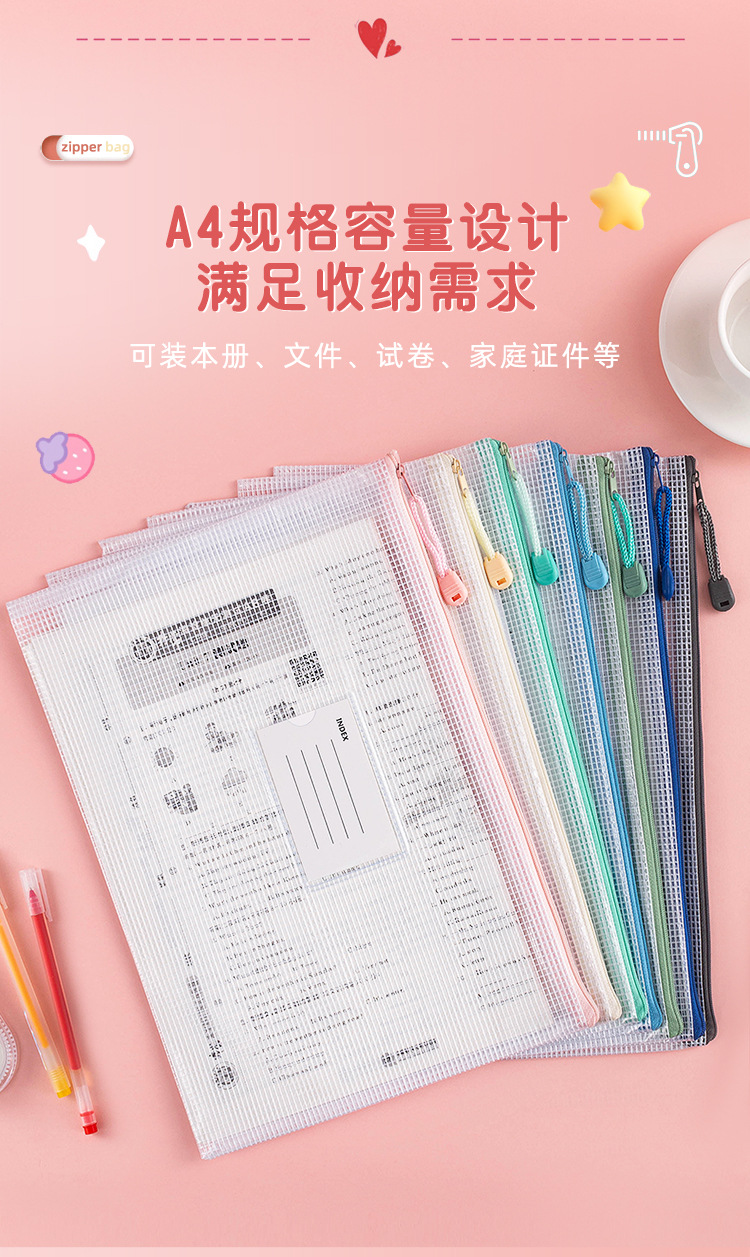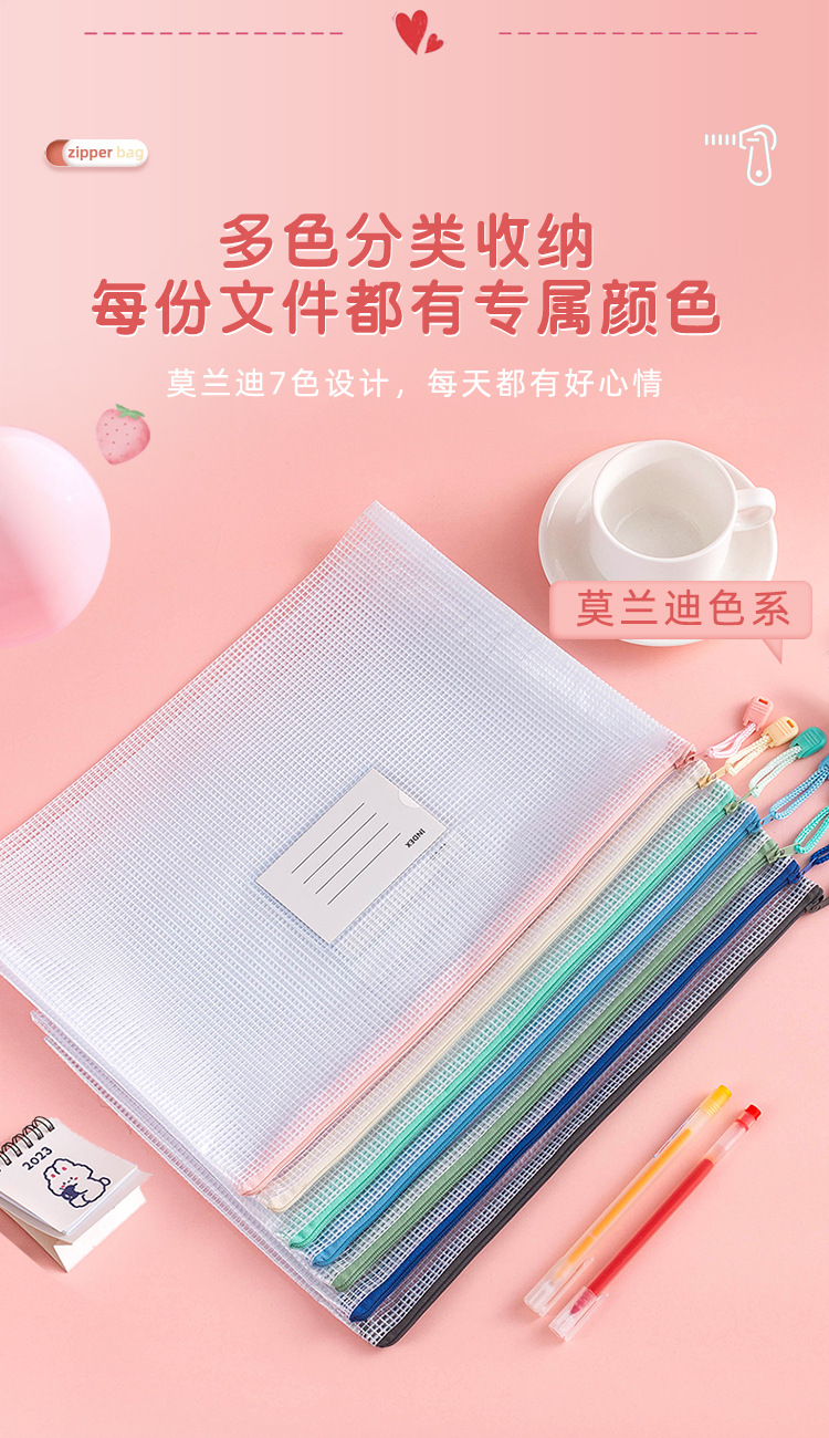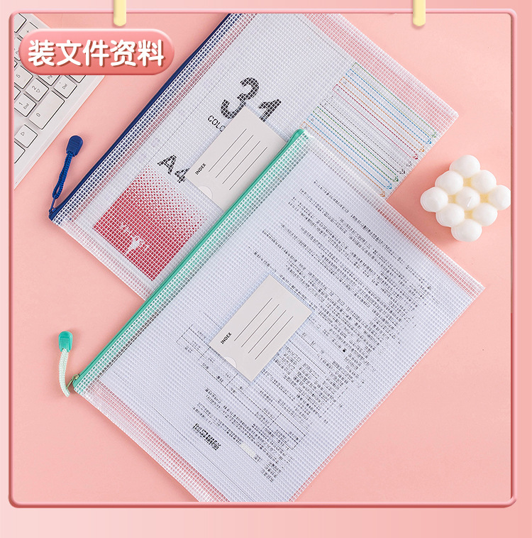 莫兰迪网格拉链袋防水透明办公资料袋学生课本分类收纳袋A4文件袋