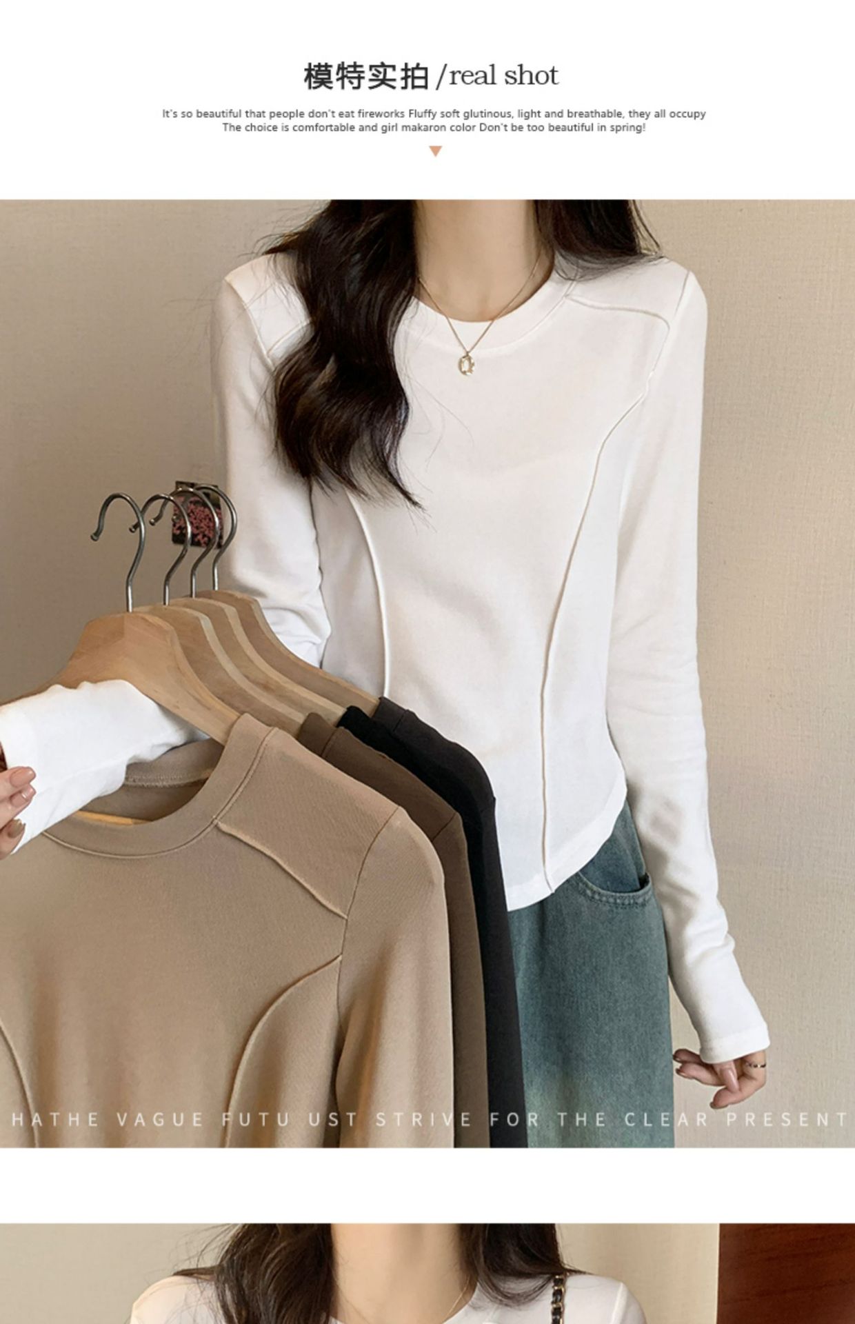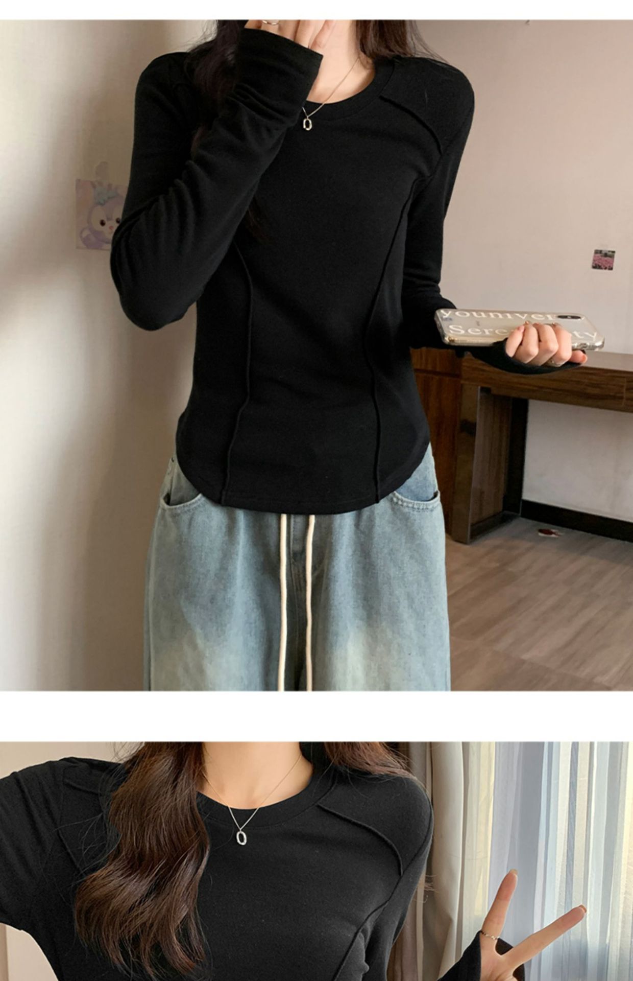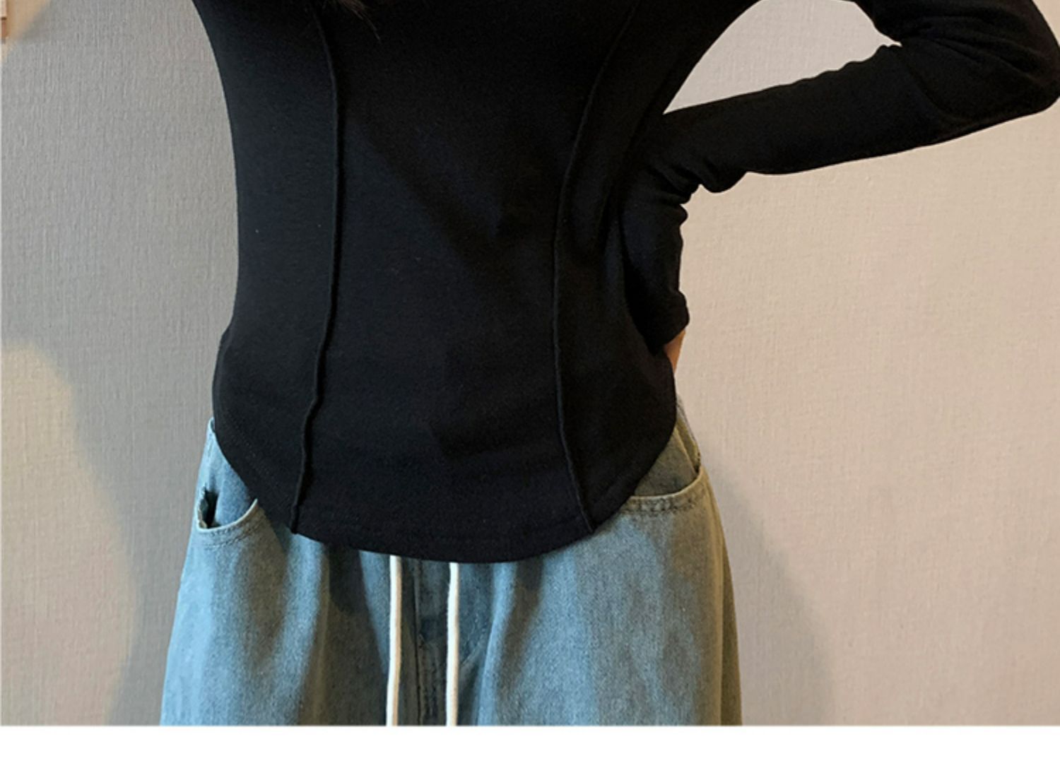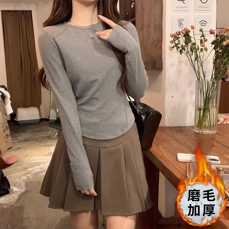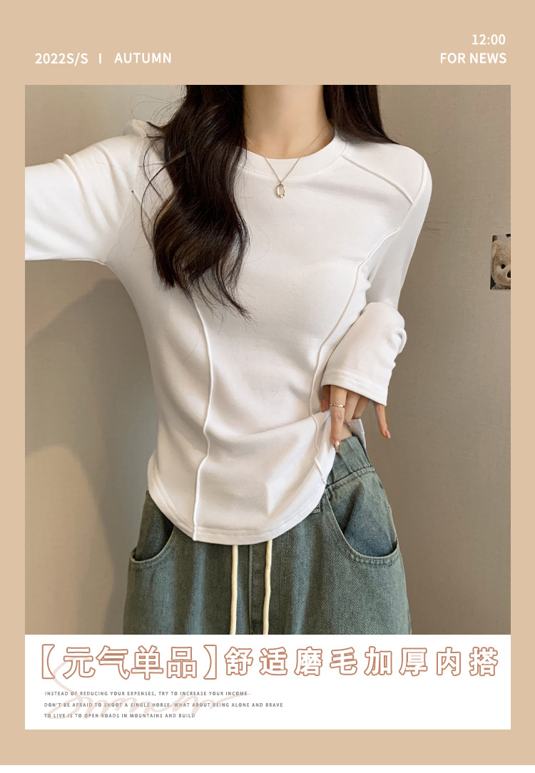白色长袖打底衫女秋冬内搭短款鱼骨上衣设计感修身加绒磨毛T恤