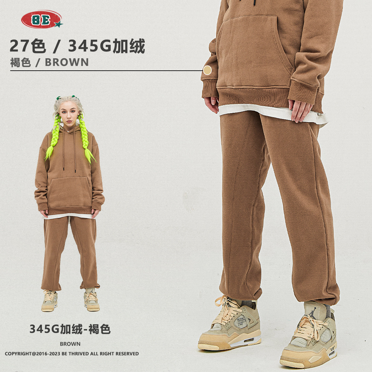 BE男装秋冬2024美式潮牌连帽卫衣男纯色加绒加厚套装男式卫衣穿搭