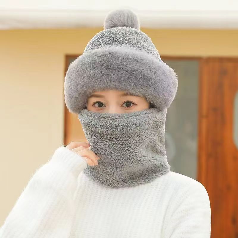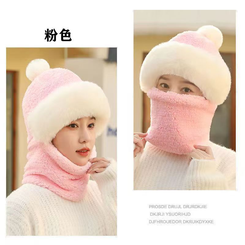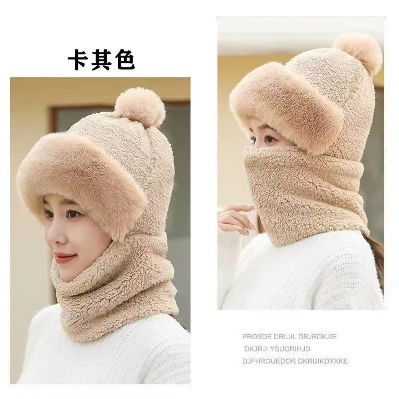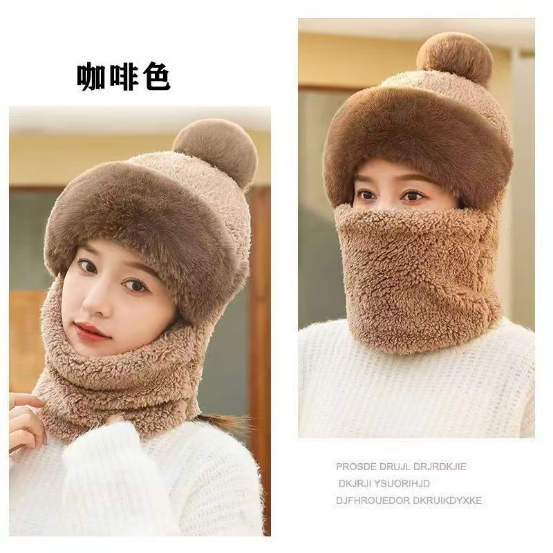 冬季兔绒小熊围脖一体帽子女防风护耳加厚骑车百搭帽子围巾两件套