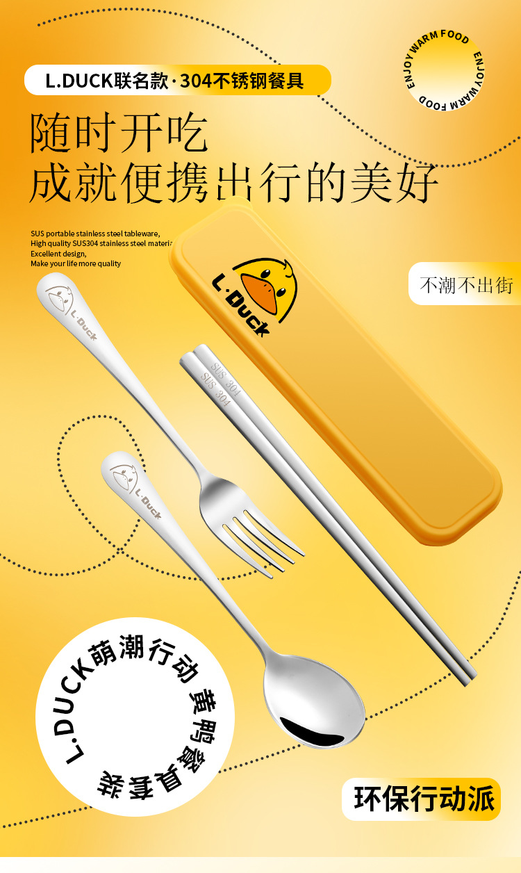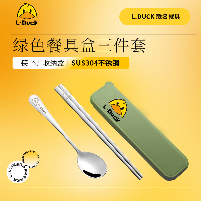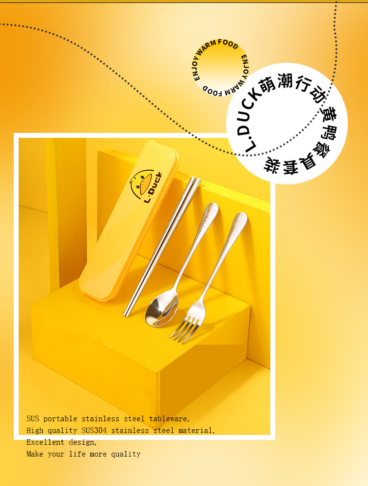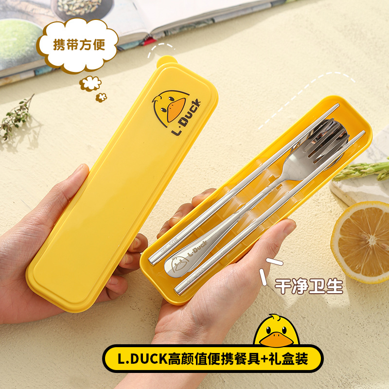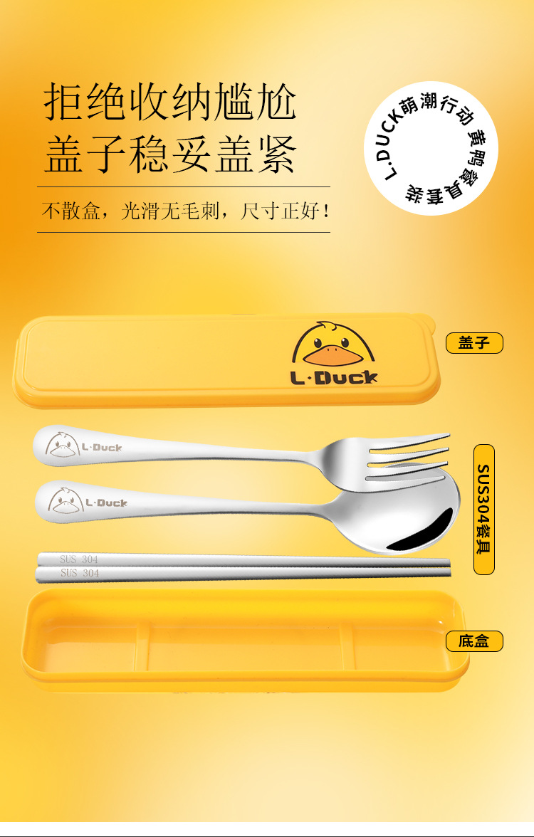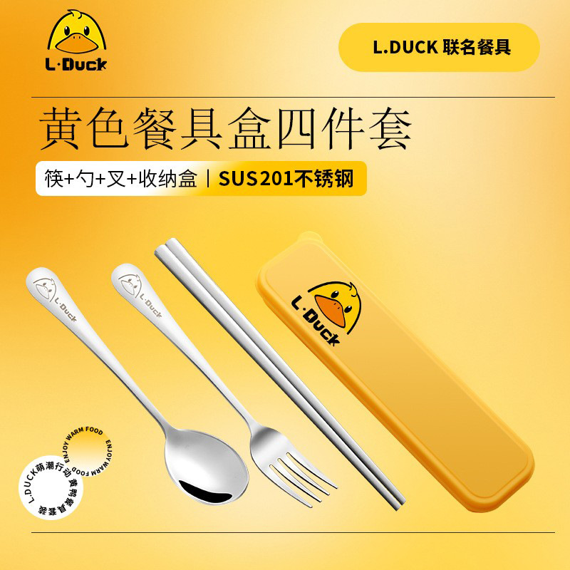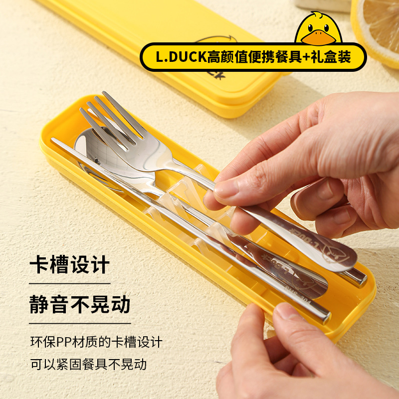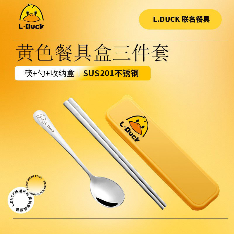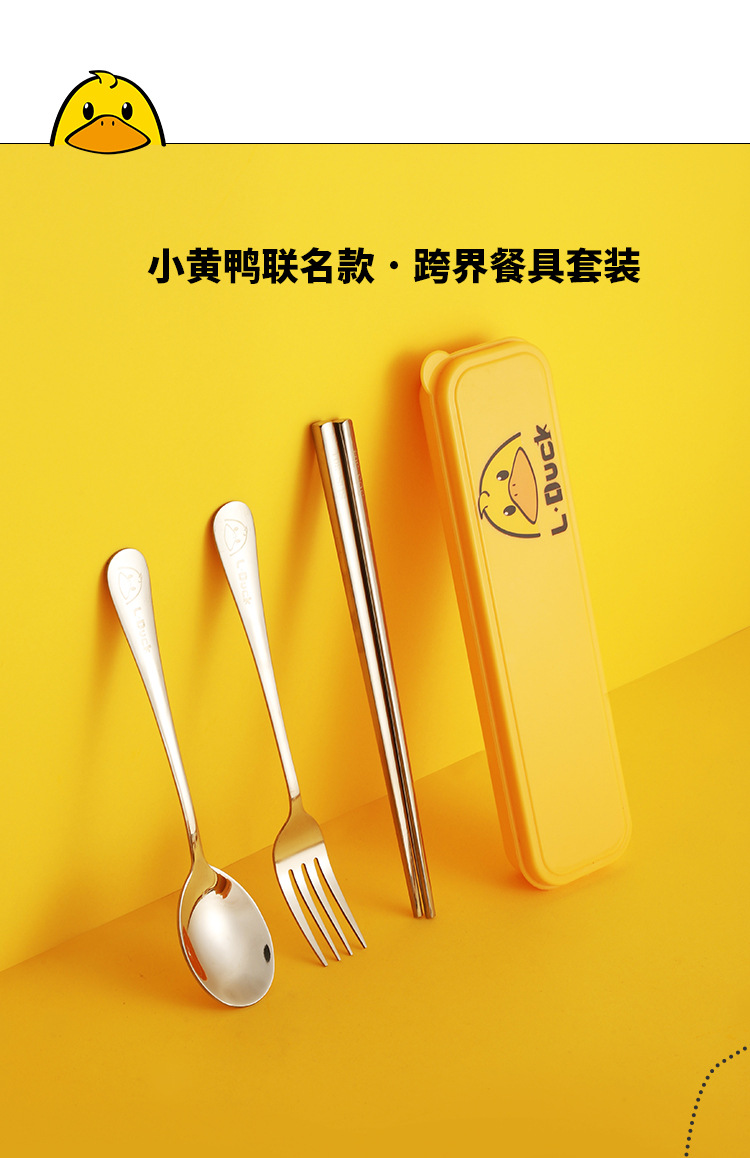 黄鸭联名304不锈钢筷勺叉套装学生上班族单人外带三件套便携餐具