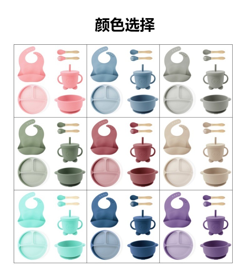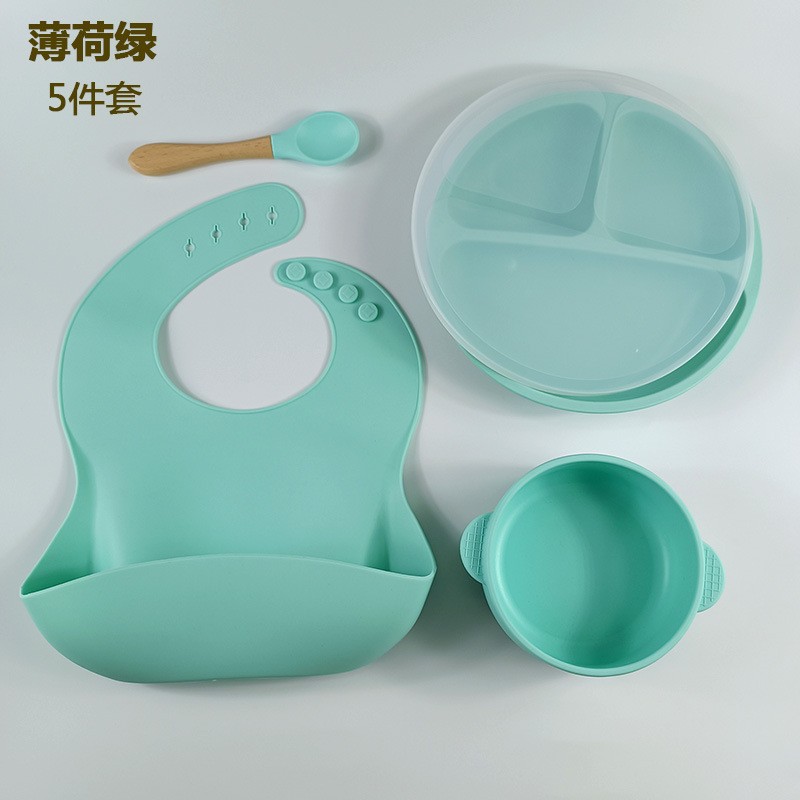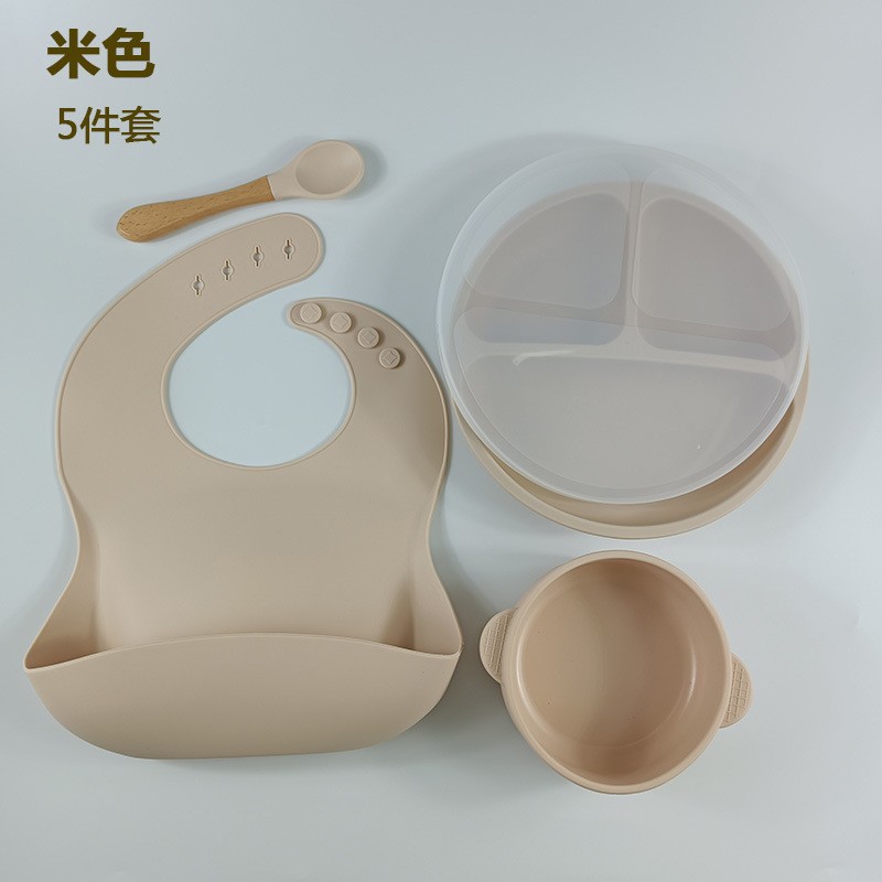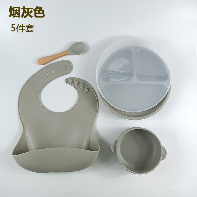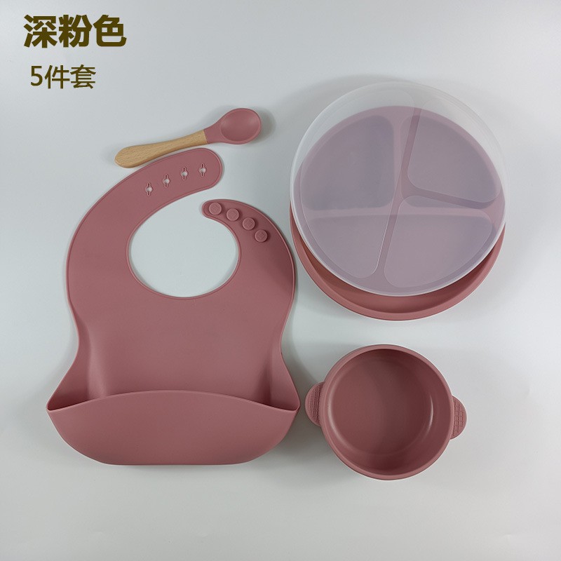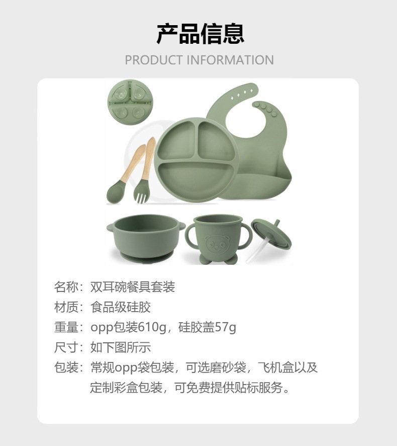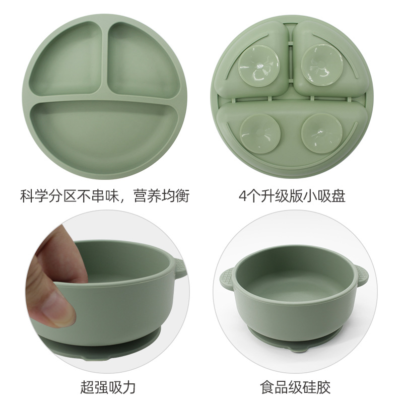 儿童硅胶餐具套装双耳碗一体式硅胶餐盘宝宝吃饭围兜母婴辅食吸盘