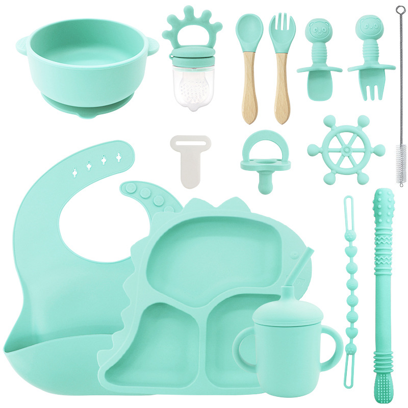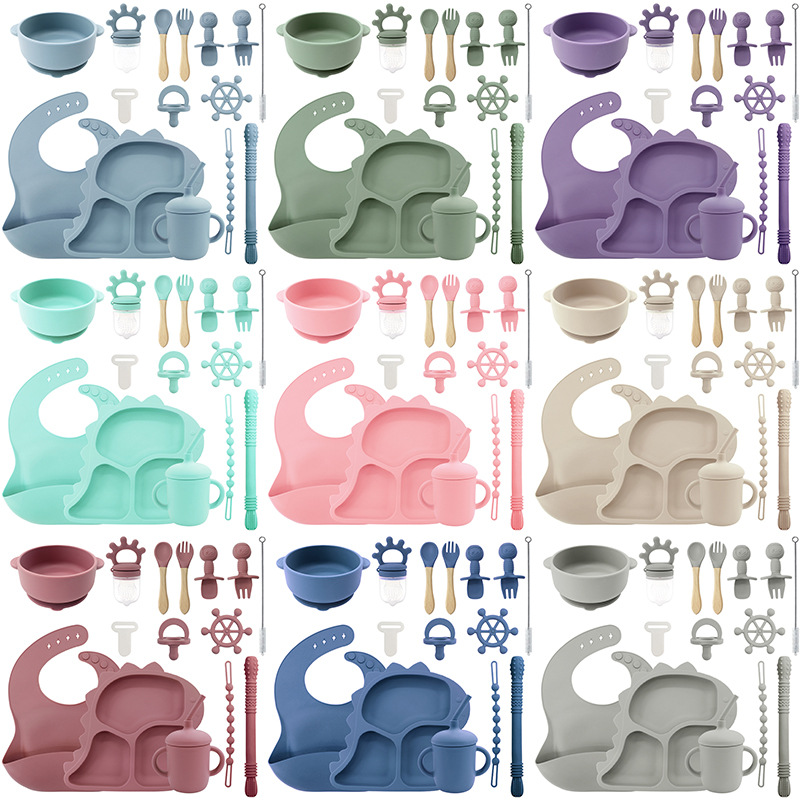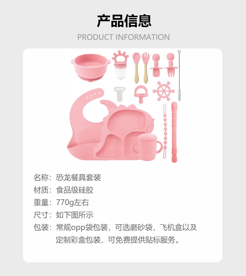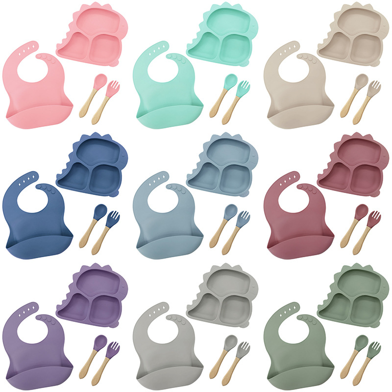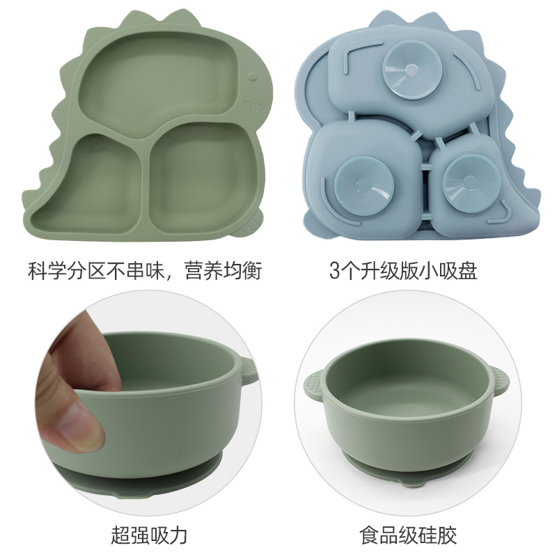 母婴硅胶餐具磨牙棒恐龙辅食餐盘吸盘碗练习吃饭围兜儿童餐具套装