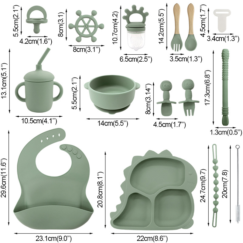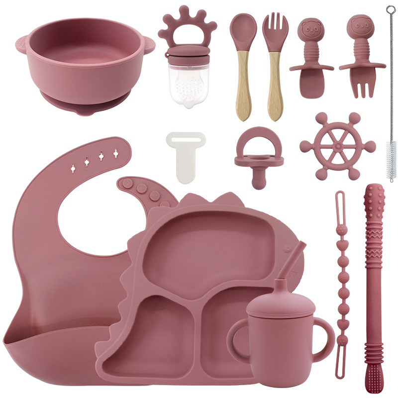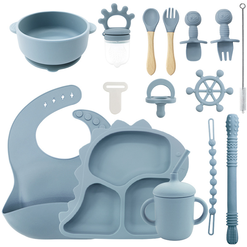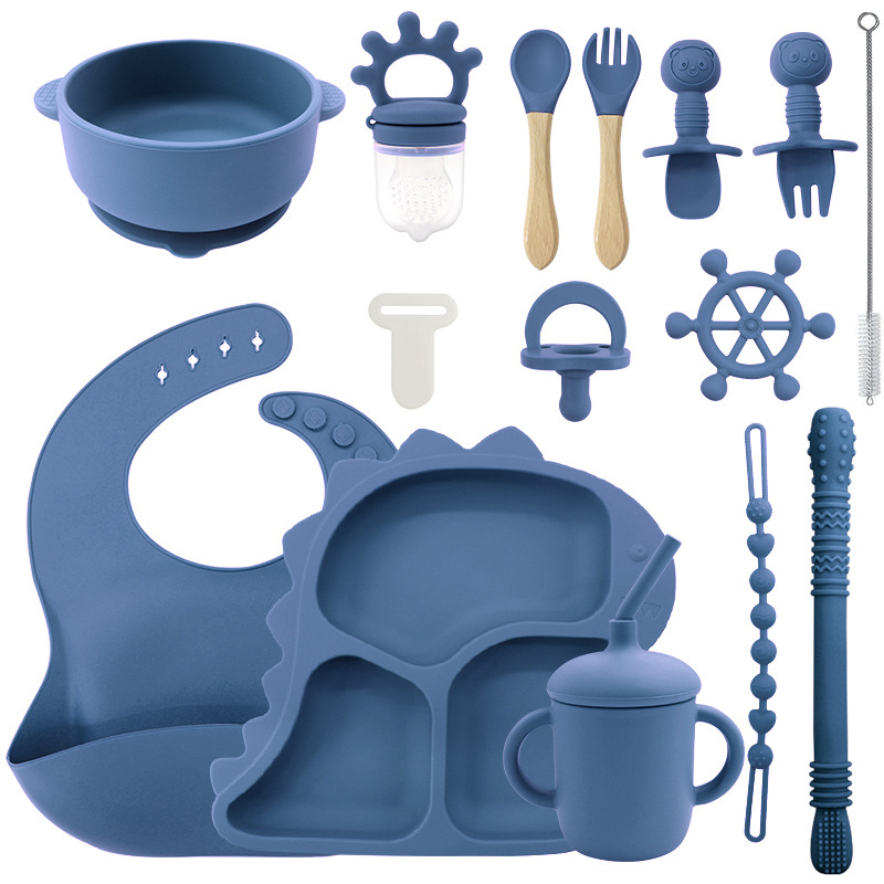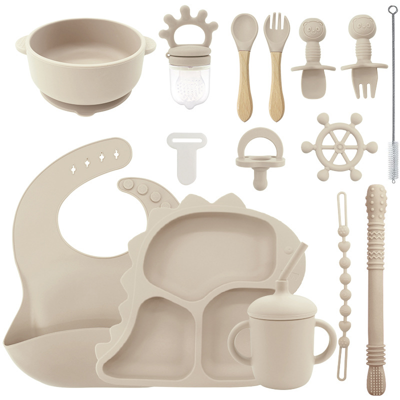 母婴硅胶餐具磨牙棒恐龙辅食餐盘吸盘碗练习吃饭围兜儿童餐具套装