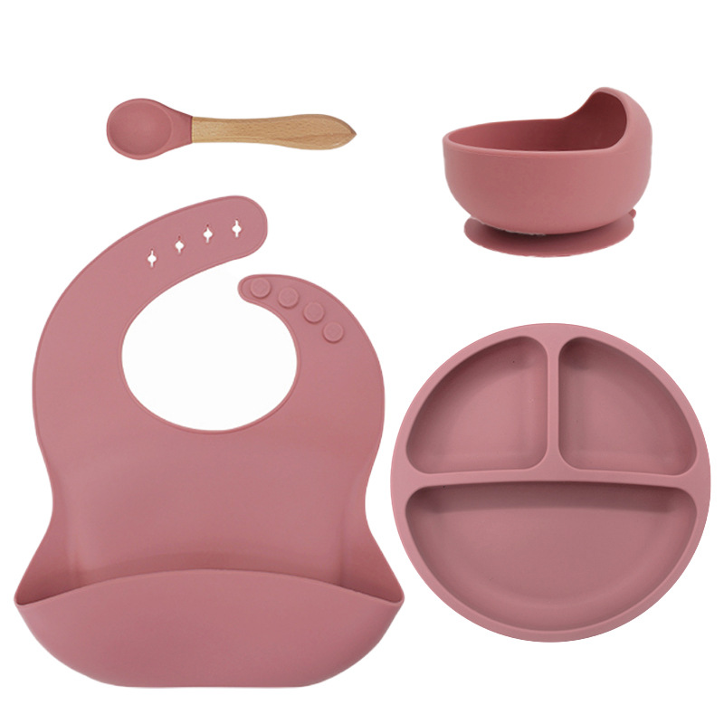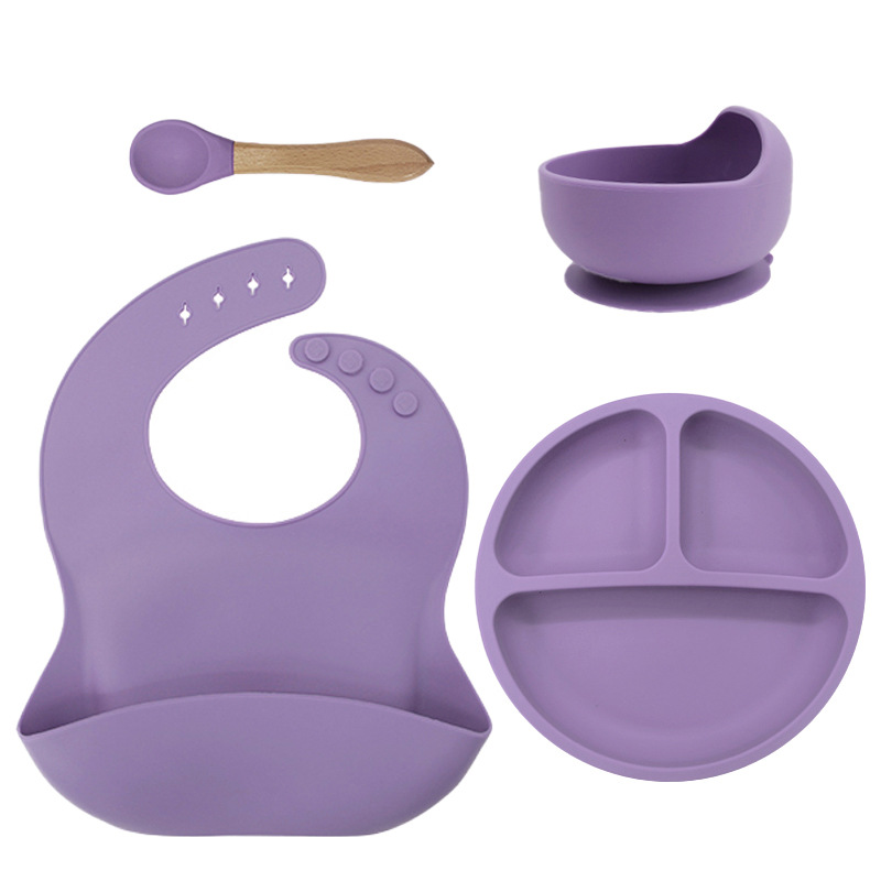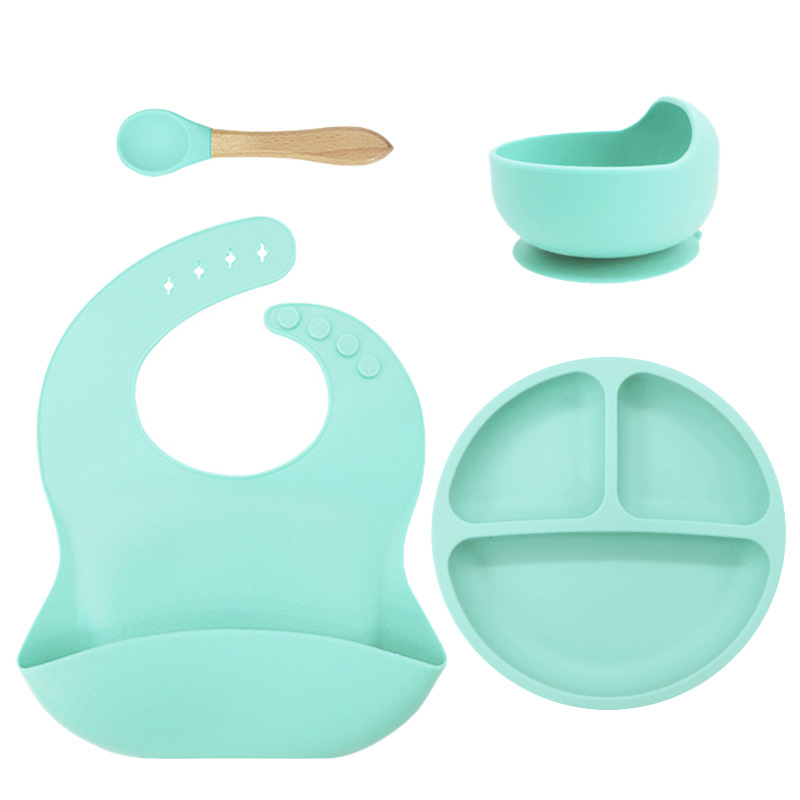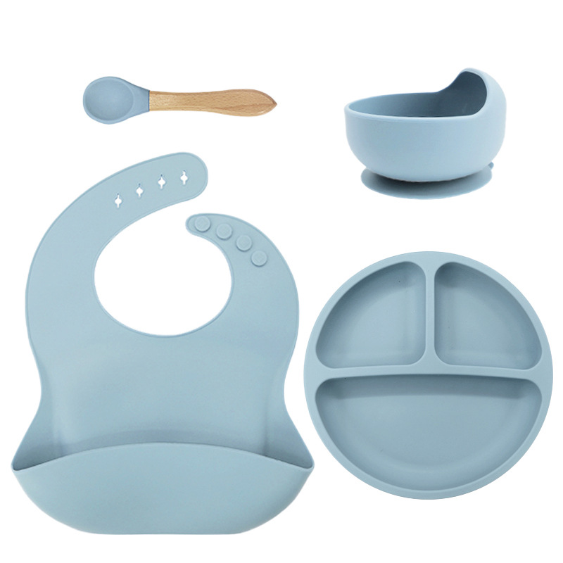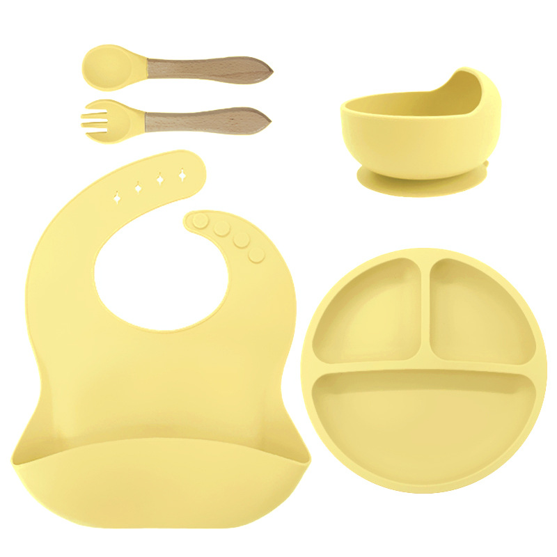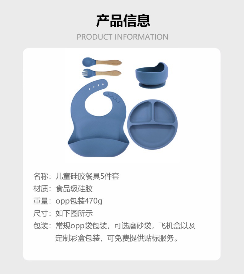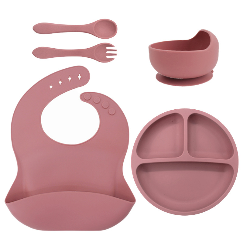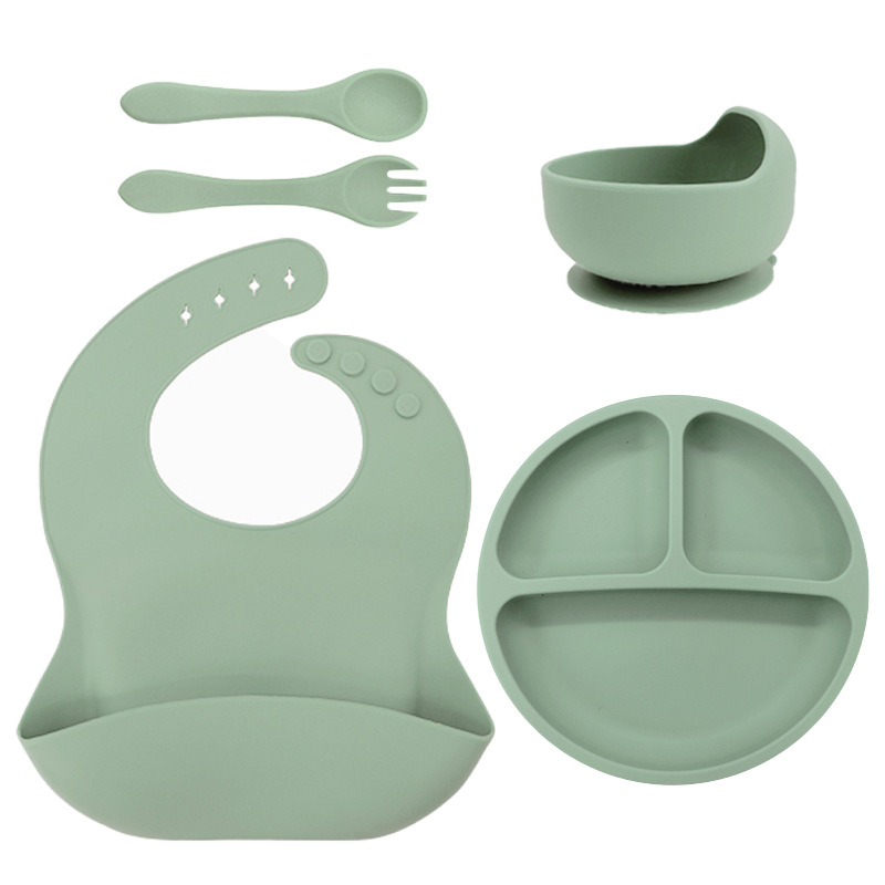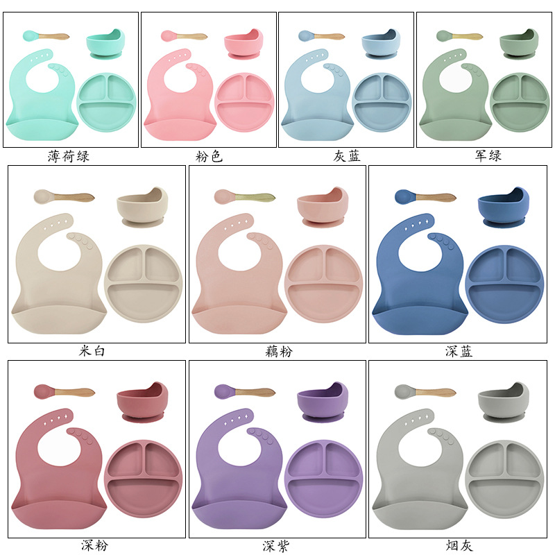 儿童硅胶餐具蜗牛碗套装5件套防摔硅胶围兜辅食叉勺吸盘餐盘跨境