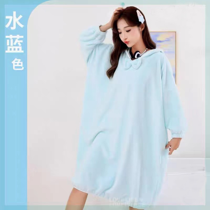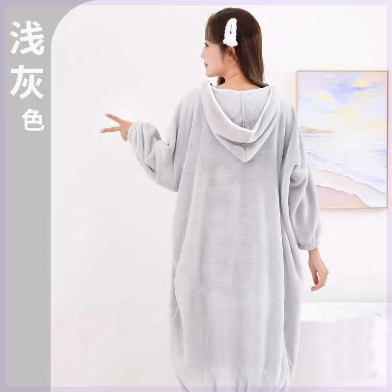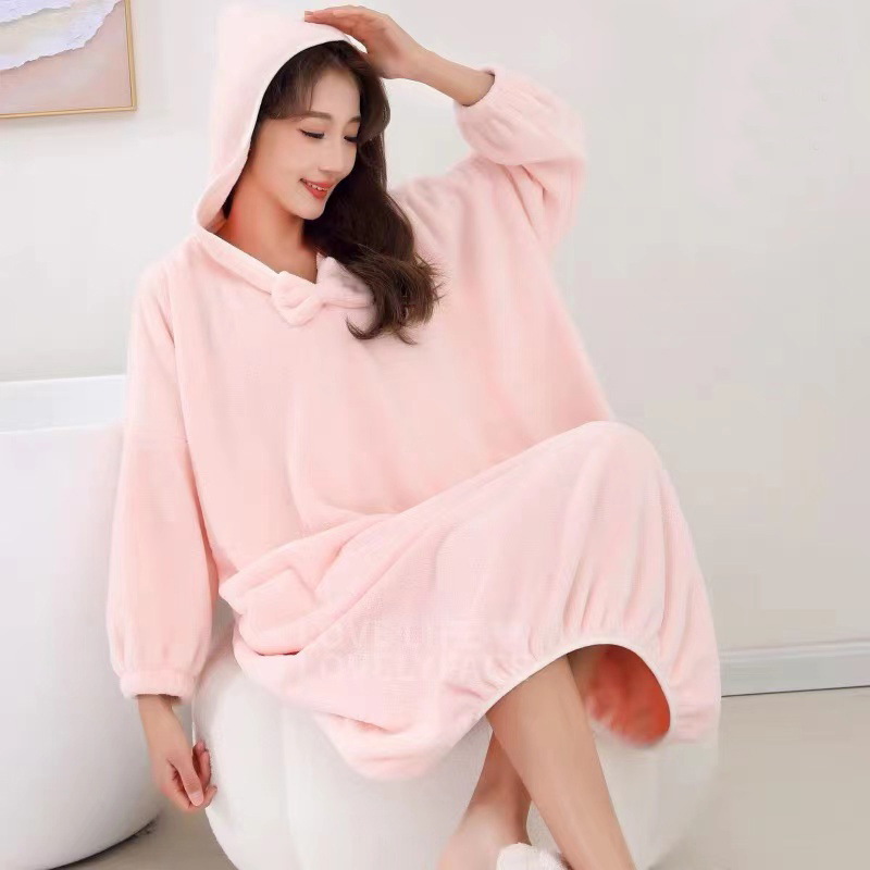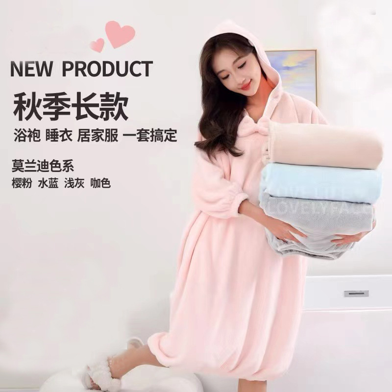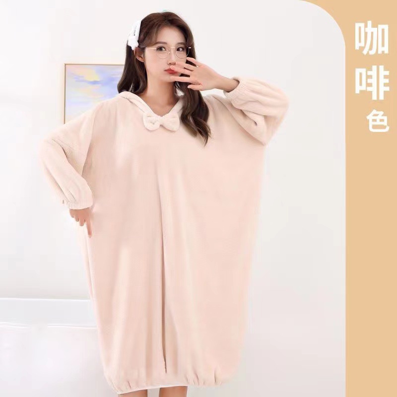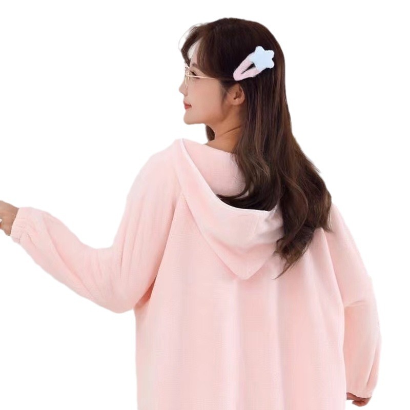 冬季长款居家浴袍女士可穿吸水浴巾珊瑚绒加厚家用连帽长袖浴裙
