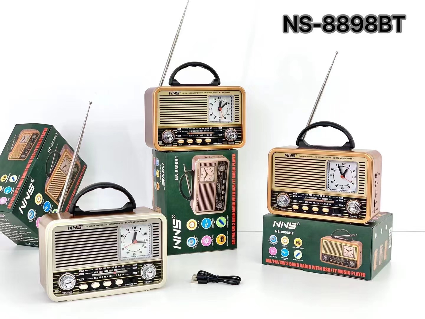 NS-8898BT户外多功能插卡音响 便携多波段带时钟复古蓝牙收音机