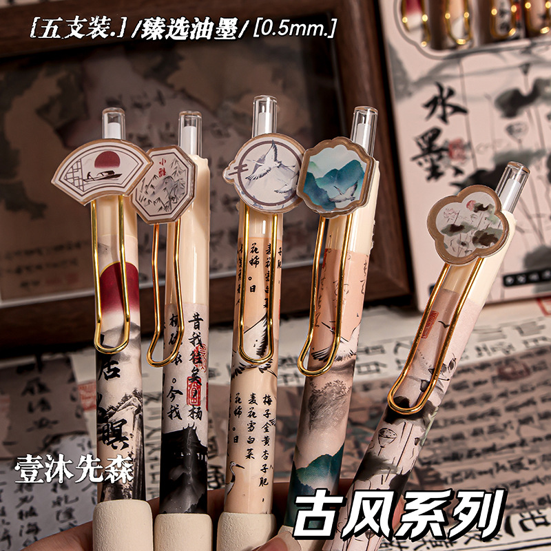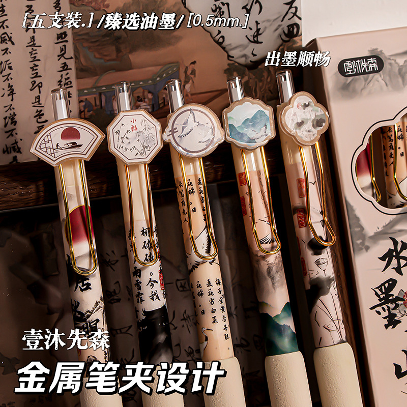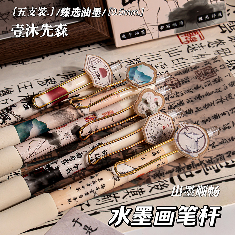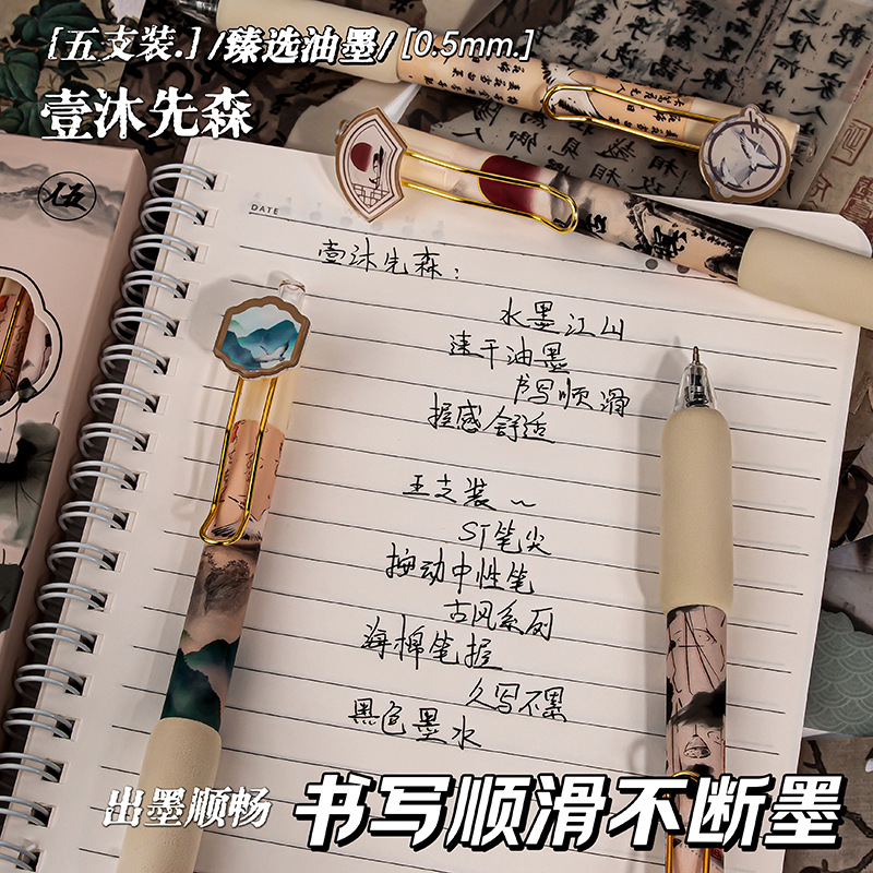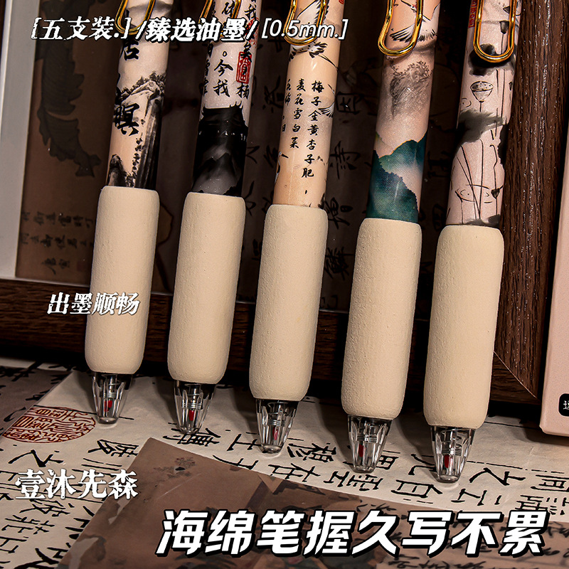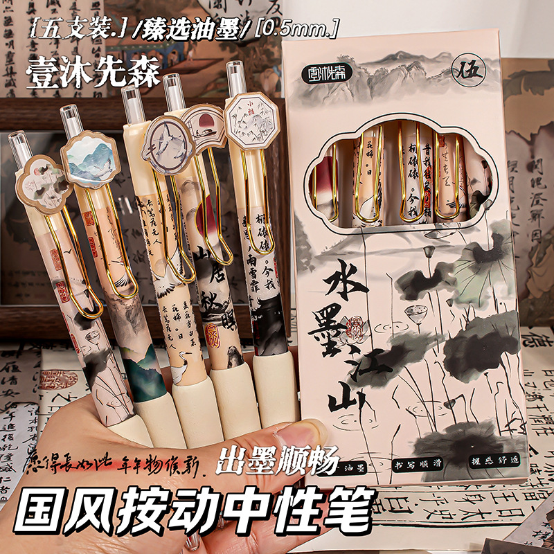 水墨江山按动中性笔软握高颜值国风学生0.5黑色速干按动笔刷题笔